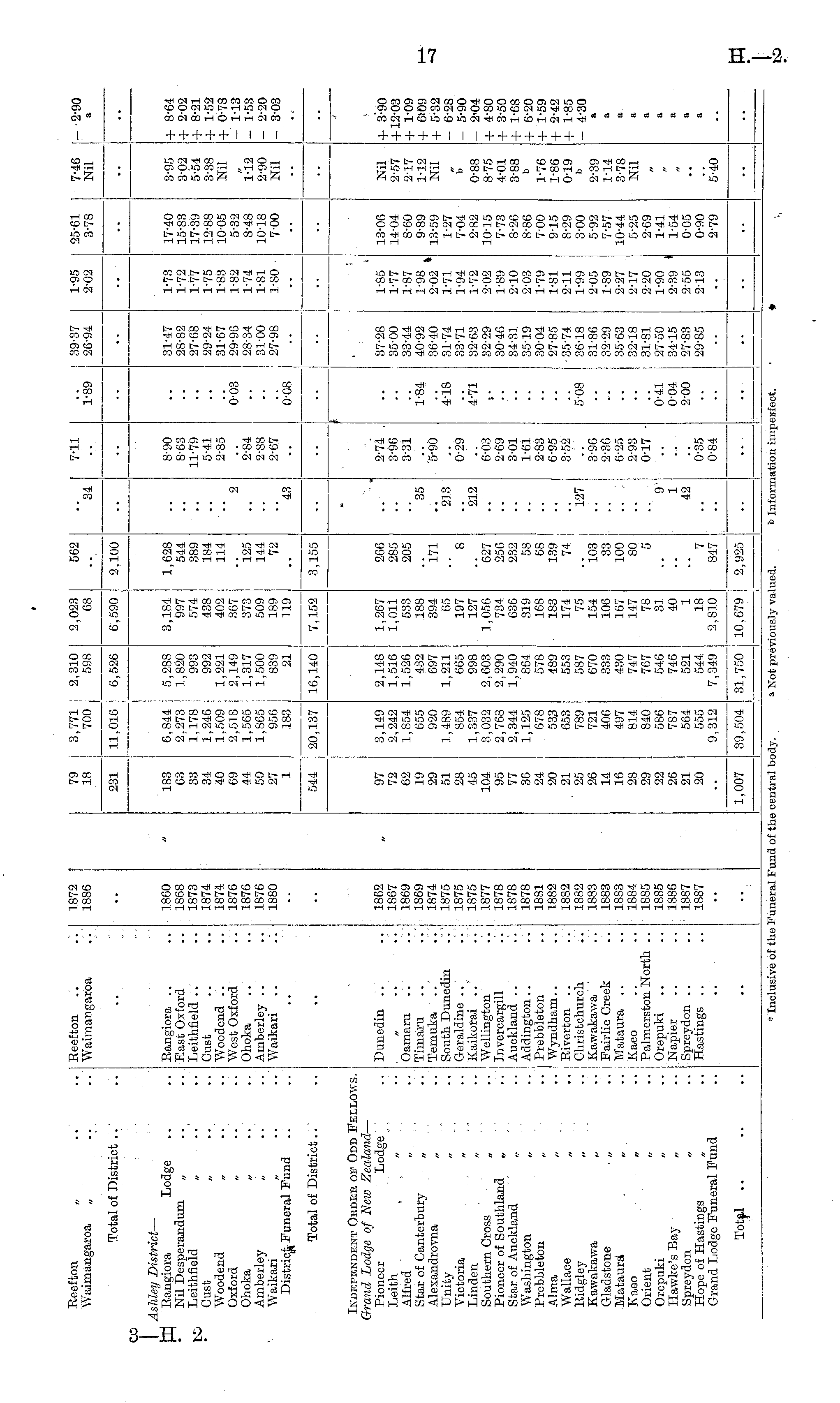 Reefton „ Waimangaroa „ Reef ton Waimangaroa 1872 1886 79 18 3,771 | 700 j I 2,310 598 2,023 68 562 I "34 7-11 1-89 39-37 26-94 1-95 2-02 25-61 3-78 7-46 Nil - 2-90 a Total of District .. 231 I 11,016 | 6,526 6,590 2,100 •• •• " " •• CD I Ashley District — p*j Rangiora Lodge Nil Desperandum „ k~ Leithfield • Oust Woodend „ Oxford Ohoka „ Amberley „ Waikari District Funeral Fund Rangiora East Oxford Loithfield Oust Woodend West Oxford Ohoka Amberley Waikari 1860 1868 1873 1874 1874 1876 1876 1876 1880 183 63 33 34 40 69 44 50 27 1 I 6,844 2,273 1,178 1,246 1,509 2,518 1,565 1,865 956 183 ! I 5,288 1,820 993 992 1,221 2,149 1,317 1,500 839 21 3,184 997 574 438 402 367 373 509 189 119 1,628 544 389 184 114 8-90 8-63 11-79 5-41 2-85 I I j 31-47 28-82 27-68 29-24 31-67 29-96 28-34 31-00 \ 27-98 j 1-73 1-72 1-77 1-75 1-83 1-82 1-74 1-81 1-80 I 17-40 15-83 17-39 12-88 10-05 5-32 8-48 10-18 7-00 3-95 3-02 5-54 3-38 Nil + 8-64 + 2-02 + 8-21 + 1-52 + 0-78 - 1-13 - 1-53 - 2-20 - 3-03 125 144 72 2 2-84 2-88 2-67 0-03 i " I .. 1-12 2-90 i Nil •- 0-08 43| 1 i - I ■• I 1 Total of District 544 I [ I 20,137 I 16,140 7,152 | 3,155 I ' I I I 1 I ; _ Independent Oedee of Odd Fellows. Grand Lodge of New Zealand — Pioneer Lodge Lcith Alfred Star of Canterbury „ Alexandrovna „ Unity „ Victoria „ Linden „ Southern Cross „ Pioneer of Southland „ Star of Auckland „ Washington „ Prebbleton „ Alma „ Wallace „ Ridgley „ Kawakawa „ Gladstone „ Mataura „ Kaeo „ Orient „ Orepuki „ Hawke's Bay Spreydon „ Hope of Hastings „ Grand Lodge Funeral Fund 1 Dunedin Oamaru Timara Temuka South Dunedin . '. * Geraldino Kaikorai Wellington Invercargill Auckland .. Addington Prebbleton Wyndham Riverton .. Christchurch Kawakawa Fairlie Creek Mataura Kaeo Palmerston North .. Orepuki Napier Spreydon Hastings .. 1862 1867 1869 1869 1874 1875 1875 1875 1877 1878 1878 1878 1881 1882 1882 1882 1883 1883 1883 1884 1885 1885 1886 1887 1887 97 j 72 62 19 29 51 28 45 104 95 77 36 24 20 21 25 26 14 16 28 29 22 26 21 20 j 3,149 2,242 1,854 655 920 1,489 854 1,337 3,032 2,768 2,344 1,125 678 533 653 789 721 406 497 814 840 586 787 564 555 9,312 2,148 1,516 1,526 432 697 1,211 665 998 2,603 2,290 1,940 864 578 489 I 553 I 587 670 333 430 747 767 546 746 521 544 7,349 1,267 1,011 533 188 394 65 197 127 1,056 734 636 319 168 183 174 75 154 106 167 147 78 31 40 1 18 2,810 266 285 205 171 8 627 256 232 58 68 139 74 35 #213 '212 2-74 3-96 3-31 ■5-90 j 0-29 6-03 2-69 3-01 1-61 2-83 6-95 3-52 1-84 4-18 4*71 37-28 35-00 33-44 40-92 36-40 31-74 33-71 32-63 32-29 30-46 34-31 35-19 30-04 27-85 35-74 36-18 31-86 32-29 35-63 32-18 31-81 27-50 34-15 27-83 29-85 1-85 1-77 1-87 1-98 2-02 1-71 1-94 1-72 2-02 1-89 2-10 2-03 1-79 1-81 2-11 1-99 2-05 1-89 2-27 2-17 2-20 1-90 2-39 ' 2-55 2-13 13-06 14-04 8-60 9-89 13-59 1-27 7-04 2-82 10-15 7-73 8-26 8-86 700 9-15 8-29 3-00 5-92 7-57 10-44 5-25 2-69 1-41 1-54 0-05 0-90 2-79 Nil 2-57 2-17 1-12 Nil b 0-88 8-75 4-01 3-88 + 3-90 + 12-03 + 1-09 + 6-09 + 5-32 - 6-28 - 5-90 - 2-04 + 4-80 + 3-50 + 1-68 + 6-20 + 1-59 + 2-42 + 1-85 - 4-30 a 1-76 1-86 0-19 127 5-08 103 33 100 80 5 3-96 2-36 6-25 2-93 0-17 2-39 1-14 3-78 Nil a a a 0-41 0-04 2-00 a 9 1 42 a R •■_ 847 0-35 0-84 5-40 a a - •• I 31,750 2,925 ! I Totjd .. 1,007 39,504 10,679 •• I 1 I I * Inclusive of the Funeral Fund of the central body. a Not previously valued. 1) Information imperfect.