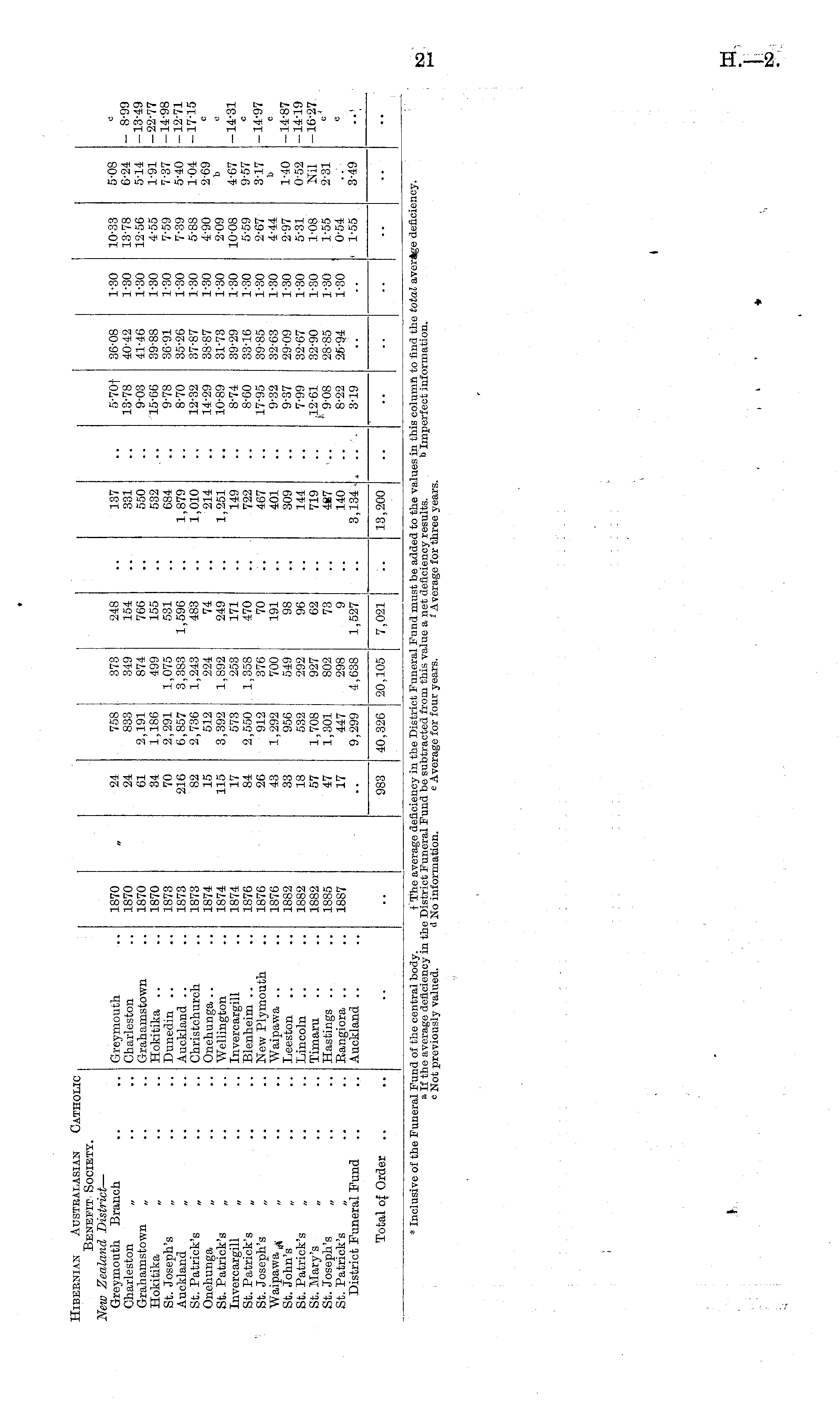Hibernian Austbalasian Catholic Benefit Society. New Zealand District — Greymouth Branch Charleston „ Grahamstown „ Hokitika „ St. Joseph's „ Auckland „ St. Patrick's „ Onehunga „ St. Patrick's Invercargill „ St. Patrick's St. Joseph's „ Waipawa j „ St. John's „ St. Patrick's „ St. Mary's „ St. Joseph's „ St. Patrick's District Funeral Fund Greymouth Charleston Grahamstown Hokitika .. Dunedin .. Auckland .. Christchurch Onehunga .. Wellington Invercargill Blenheim .. New Plymouth Waipawa .. Leeston Lincoln Timaru Hastings .. Eangiora .. Auckland .. 1870 1870 1870 1870 1873 1873 1873 1874 1874 1874 1876 1876 1876 1882 1882 1882 1885 1887 24 24 61 34 70 216 82 15 115 17 84 26 43 33 18 57 47 17 758 833 2,191 1,186 2,291 6,857 2,736 512 3,392 573 2,550 912 1,292 956 532 1,708 1,301 447 9,299 373 349 874 499 1,075 3,383 1,243 224 1,892 253 1,358 376 700 549 292 927 802 298 4,638 248 154 766 155 531 1,596 483 74 249 171 470 70 191 98 96 62 73 9 1,527 137 331 550 532 684 1,879 1,010 214 1,251 149 722 467 401 309 144 719 487 140 3,134 5-70f 13-78 9-03 15-66 9-78 8-70 12-32 14-29 10-89 8-74 8-60 17-95 9-32 9-37 7-99 12-61 ' 9-08 8-22 3-19 36-08 40-42 41-46 39-88 36-91 35-26 37-87 38-87 31-73 39-29 33-16 39-85 32-63 29-09 32-67 32-90 28-85 25-94 1-30 1-30 1-30 1-30 1-30 1-30 1-30 1-30 1-30 1-30 1-30 1-30 1-30 1-30 1-30 1-30 1-30 1-30 10-33 13-78 12-56 4-55 7-59 7-39 5-88 4-90 2-09 10-08 5-59 2-67 4-44 2-97 5-31 1-08 1-55 0-54 1-55 5-08 6-24 5-14 1-91 7-37 5-40 1-04 2-69 b - 8-99 -13-49 -22-77 -14-98 -12-71 -17-15 c c 4-67 9-57 3-17 1-40 0-52 Nil 2-31 3-49 -14-31 C -14-97 C -14-87 -14-19 -16-27 C Total of Order .. 983 40,326 20,105 7,021 13,200 * Inclusive of the Funeral Fund of the central body. t The average deficiency in the District Funeral Fund must be added to the values in this column to find the total average deficiency, a If the average deficiency in the District Funeral Fund be subtracted from this value a net deficiency results. b Imperfect information, o Not previously valued. * No information. e Average for four years. i Average for three years.