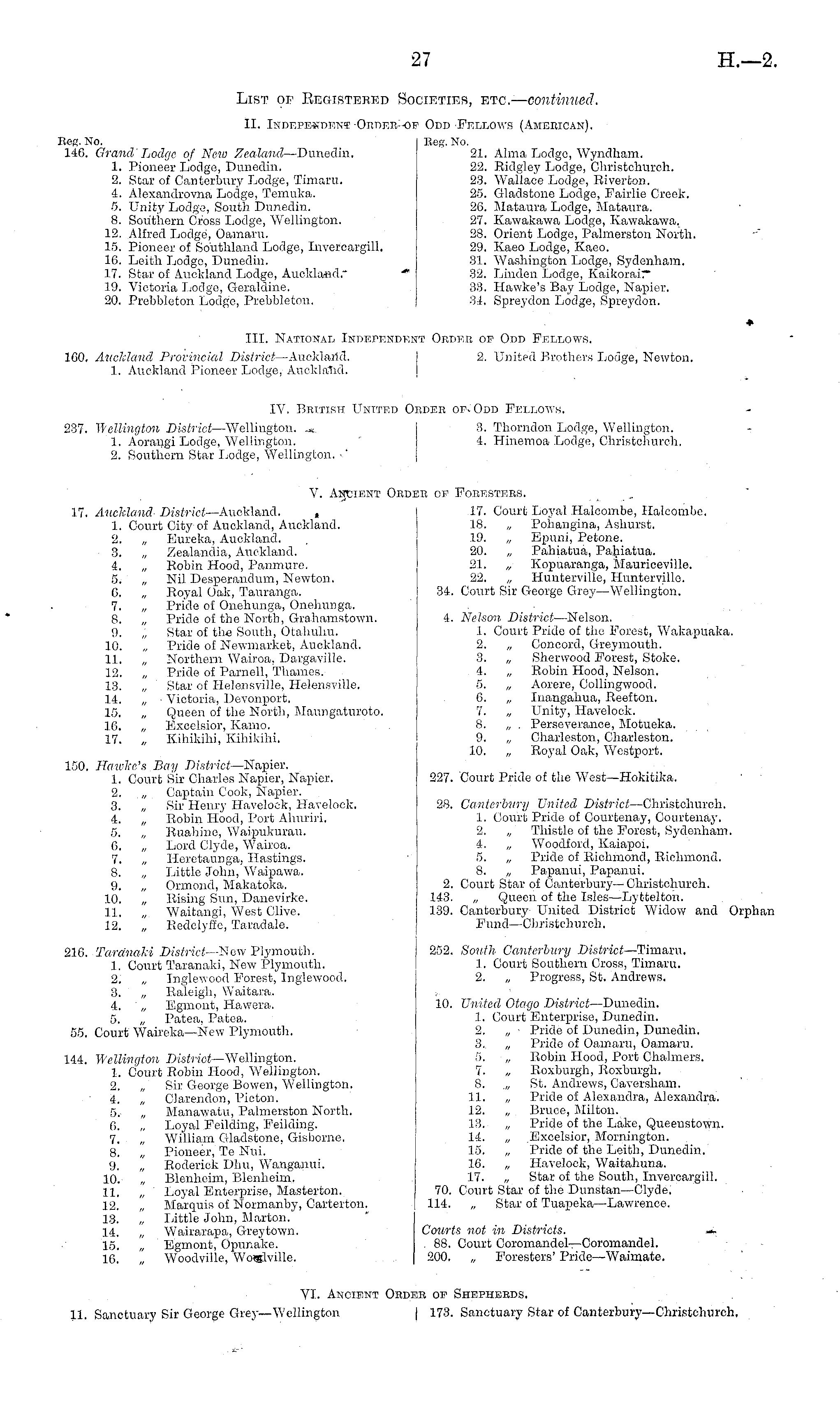 List of Eegistbred Societies, etc. — continued. 11. Independent-Order- -of Odd Fellows (Ameiucah). Reg. No. Eeg. No. 14G. Grand' Lodge of New Zealand —Dnnedin, 21. Alma Lodge, Wyndham. 1. Pioneer Lodge, Dunediii. 22. Eidgley Lodge, Christchureh, 2. Star of Canterbury Lodge, Timaru. 23. Wallace Lodge, Riyerton. 4. Alexandrovna Lodge, Temnka. 25. Gladstone Lodge, Fairlie Creek. 5. Unity Lodge, South Dnnedin. 26. Mataura Lodge, Mataura. 8. Southern Cross Ijodge, Wellington. 27. Kawakawa Ijodge, Kawakawa. 12. Alfred Lodge, Oamaru. 28. Orient Lodge, Palmerston North. 15. Pioneer of Southland Lodge, Invercargill. 29. Kaeo Lodge, Kaeo. 16. Leith Lodge, Dunedin. 31. Washington Lodge, Sydenhani. IT. Star of Auckland Lodge, Auckland. 32. Linden Lodge, Kaikorair 19. Victoria Lodge, Geraldine. 33. Hawke's Bay Lodge, Napier. 20. Prebblcton Lodge, Prebbleton. 31. Spreydon Lodge, Spreydon. * TIT. National Independent Order of Odd Fellows. 100. Auckland Provincial District —Auckland. 2. United Brothers Lodge, Newton. 1. Auckland Pioneer Lodge, Auckland. IV. Bbitish United Order of Odd Fellows, 237. Wellington District —Wellington. .. 3. Thorndon Lodge, Wellington. 1. Aorangi Lodge, Wellington. 4. Hinemoa Lodge, Christchureh. 2. Southern Star Lodge, Wellington. ■' V. Ancient Order of Foresters, 17. Auckland District —Auckland. 17. Court Loyal Haleombe, Halcombe. 1. Court City of Auckland, Auckland. 18. „ Poiiangina, Ashurst. 2. „ Eureka, Auckland. . 19. „ Epuni, Petone. 3. „ Zealandia, Auckland. 20. „ Pahiatua, Pahiatua. 4. „ Robin Hood, Pamnure. 21. „ Kopuaranga, Mauriceyille. 5. „ Nil Desperandum, Newton. 22. „ Hunterville, Hunterville. 6. „ Royal Oak, Tauranga. 34. Court Sir George Grey—Wellington. 7. „ Pride of Onehunga, Onehunga. 8. „ Pride of the North, Grahamstown. 4. Nelson District —Nelson. 9. „ Star of the South, Oiahulm. 1. Court Pride of the Forest, Wakapuaka. 10. Pride of Newmarket, Auckland. 2. „ Concord, Greymouth. 11. „ Northern Wairoa, Dargaville. 3. „ Sherwood Forest, Stoke. 12. „ Pride of Parnell, Thames. 4. „ Robin Hood, Nelson. Star of Helensville, Helensville. 5. „ Aorere, Collingwood. 14. „ ■ Victoria, Devonport. 6. „ Inangahua, Reefton. 15. „ Queen of the North, Maungaturoto. 7. „ Unity, Havelock. 16. „ Excelsior, Kamo. 8. „ , Perseverance, Motueka. 17. „ Kihikihi, Kihikihi. 9. „ Cliarleston, Charleston. 10. „ Royal Oak, Westport. 150. Hawlee'B Bay District —Napier. 1. Court Sir Charles Napier, Napier. 227. Court Pride of the West—Hokitika. 2. „ Captain Cook, Napier. 3. „ Sir Henry Havelock, Havelock. 28. Canterbury United District —Christchureh. 4. „ Robin Hood, Port Ahuriri. 1. Court Pride of Courtenay, Conrtenay. 5. Ruahine, Waipukurau. 2. „ Thistle of the Forest, Sydenhani. 6. „ Lord Clyde, Wairoa. 4. „ Woodford, Kaiapoi. 7. „ Heretaunga, Hastings. 5. „ Pride of Richmond, Richmond. 8. „ Little John,Waipawa. 8. „ Papanui, Papanui. 9. „ Ormond, Makatoka. 2. Court Star of Canterbury—Christchureh. 10. „ Rising Sun, Danevirke. 143. „ Queen of the Isles—Lyttelton. 11. Waitangi, West Clive. 139. Canterbury United District Widow and Orphan 12. „ Redelyile, Taradale. Fund—Cliristchurch, 216. TaranaM District— New Plymouth. 252. South Canterbury District— Miriam. 1. Court Taranaki, New Plymouth. 1 . Court Southern Cross, Timaru. 2. „ Inglewood Forest, Inglewood. 2. „ Progress, St. Andrews. 3. „ Raleigh, Waitara. 4. ' „ Egmont, Hawera. 10. United Otago District —Dunedin. 5. „ Patea. Patea. 1. Court Enterprise, Dunedin. 55. Court Waircka—New Plymouth. 2. „ Pride of Dunedin, Dunedin. 3. „ Pride of Oamaru, Oamaru. 144. Wellington District— Wellington. 5. „ Robin Hood, Port Chalmers. 1. Court Robin Hood, Wellington. 7. „ Roxburgh, Roxburgh. 2. „ Sir George Bowen, Wellington. 8. .„ St. Andrews, Caversham. 4. Clarendon, Picton. 11. „ Pride of Alexandra, Alexandra. 5. "„ Manawatu, Palmerston North. 12. „ Bruce, Milton. 6. „ Loyal Feilding, Feilding. 13. „ Pride of the Lake, Queenstown. 7. „ William Gladstone, Gisborne. 1-t. „ Excelsior, Mornington. 8. „ Pioneer, Te Nui. 15. „ Pride of the Leith, Dunedin. 9. „ Roderick Dhu, Wanganui. 16. „ Havolock, Waitahuna. 30. „ Blenheim, Blenheim. 17. „ Star of the South, Invercargill. 11. Loyal Enterprise, Masterton. 70. Court Star of the Dunstan —Clyde. 12. „ Marquis of Normanby, Carterton. 114. „ Star of Tuapeka—Lawrence. 13. „ Tittle John, Marton. 14. „ Wairarapa, Greytown. Courts not in Districts. 15. Bgmont, Opunake. . 88. Court Coromandel —Coromandel. 16. " Woodville, Wo«lville. 200. „ Foresters' Pride—Waimate. VI. Ancient Obder of Shepherds. 11. Sanctuary Sir George Grey—Wellington | 173. Sanctuary Star of Canterbury— Christchurch,