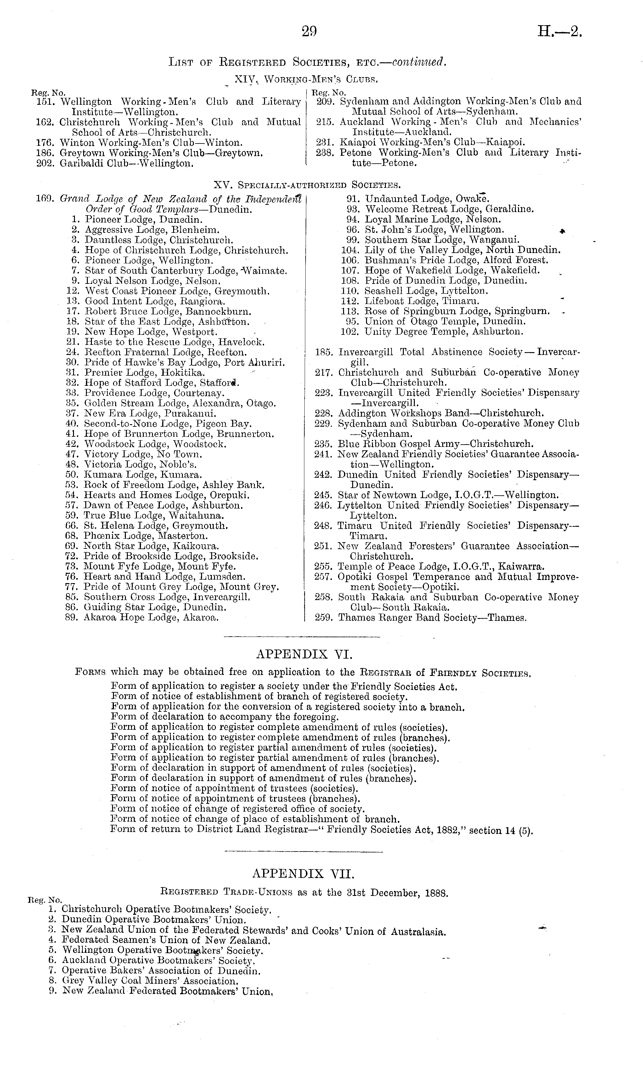 APPENDIX VII. Registered Trade-Unions as at the 31st December, 1888. Keg. No. 1. Christclrarch Operative Bootmakers' Society. 2. Dunedin Operative Bootmakers' Union. 3. New Zealand Union of the Federated Stewards' and Cooks' Union of Australasia. 4. Federated Seamen's Union of New Zealand. 5. Wellington Operative Bootmakers' Society. 6. Auckland Operative Bootmakers' Societj1. 7. Operative Bakers' Association of Dunedin. 8. Grey Valley Coal Miners' Association. 9. New Zealand Federated Bootmakers' Union,