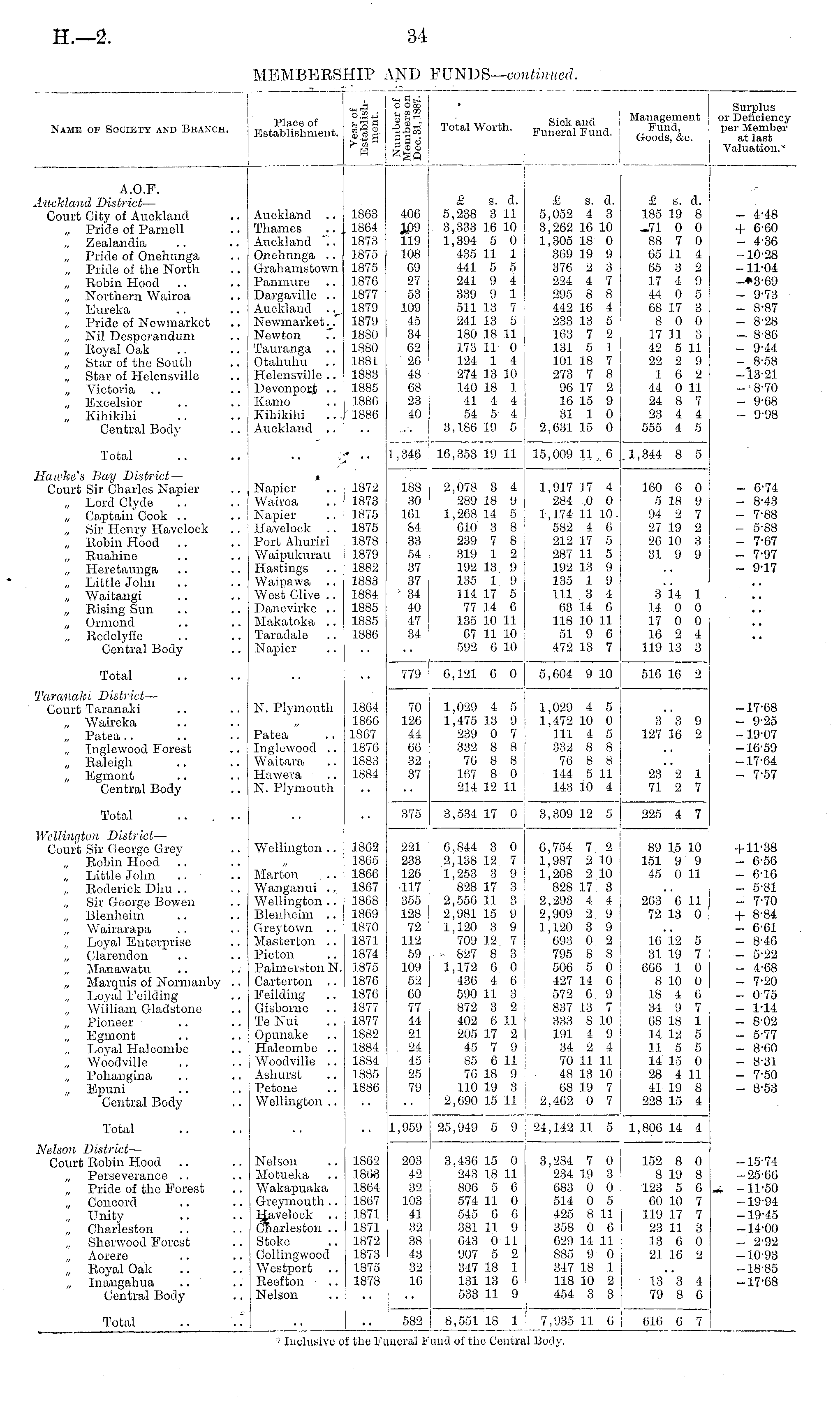 Namu of Society and Branch. Place of Establishment. all sag' o orc fjs 2 d « 39 Total Worth. y , , ' Management nicii anu t?,i,i,i Funeral Fund, G< f 0 ™%, | Surplus or Deficiency per Member at last Valuation.'' [ A.O.P. Auckland District — Court City of Auckland „ Pride of Parnell Zealandia „ Pride of Onehunga „ Pride of the North „ Robin Hood „ Northern Wairoa „ Eureka „ Pride of Newmarket „ Nil Desperandum „ Royal Oak „ Star of the South „ Star of Hclensville „ Victoria „ Excelsior „ Kihikihi Central Body Auckland .. Thames Auckland Onehunga .. Grahamstown Pamuure Dargaville .. Auckland Newmarket.. Newton .. | Tauranga .. Otahuhu Helensvillc .. Devonport .. Ivamo Kihikihi Auckland .. 1803 1804 1873 1875 1875 1870 1877 1879 1879 ! 1880 1880 1881 1883 1885 1880 1880 406 ioo 119 i 108 I 09 27 53 109 45 34 02 ! 26 48 68 23 40 £ s. d. 5,238 3 11 3,333 16 10 1,394 5 0 435 11 1 441 5 5 241 9 4 339 9 1 511 13 7 241 18 5 180 18 11 173 11 0 124 1 4 274 13 10 140 18 1 41 4 4 54 5 4 3,186 19 5 £ s. d. £ s. d. 5,052 4 3 185 19 8 3,262 16 10 .71 0 0 1,305 18 0 88 7 0 369 19 9 i 65 11 4 376 2 3 05 3 2 224 4 7 17 4 9 295 8 8 44 0 5 442 16 4 68 17 3 233 13 5 S 0 0 163 7 2 17 11 3 131 5 1 42 5 11 101 18 7 22 2 9 273 7 8 16 2 96 17 2 44 0 11 16 15 9 24 8 7 31 1 0 23 4 4 2.631 15 0 555 4 5 - 4-48 + 6-60 - 4-36 -10-28 -11-04 -*3-69 - 9-73 - 8-87 - 8-28 - 8-86 - 9-44 - 8-58 -13-21 - 8-70 - 9-08 - 9-98 ! 16,353 19 11 15,009 11. 0 .1,344 8 5 Total 1,346 Ha who's Bay District — Court Sir Charles Napier Lord Clyde „ Captain Cook .. „ Sir Hem-y Havelock „ Eobin Hood „ Eualiine „ Heretauuga „ Little Jolm „ Waitangi „ Eising Sun „ Ormond „ ReclclyfTe Central Body • Napier Wairoa .. I Napier Havelock Port Ahuriri Waipukurau Hastings Waipawa .. ] West Clive .. Danevirke .. Makatoka .. Taradale Napier 1872 1873 1875 1875 1878 1879 1882 ! 1883 1884 1885 1885 1886 188 30 101 &4 33 54 37 37 34 40 47 34 2,078 3 4 289 18 9 1,208 14 5 610 3 8 239 7 8 319 1 2 192 13 9 135 1 9 114 17 5 77 14 6 1.35 10 11 67 11 10 592 6 10 1,917 17 4 284 0 0 1,174 11 10. 582 4 (i 212 17 5 287 11 5 192 13 9 135 1 9 111 3 4 63 14 6 118 10 11 51 9 6 472 13 7 160 6 0 5 18 9 94 2 7 27 19 2 26 10 3 31 9 9 - 0-74 - 8-43 - 7-88 - 5-88 - 7-07 - 7-97 - 9-17 3 14 1 14 0 0 17 0 0 16 2 1 119 13 3 Total 779 0,121 0 0 5,004 9 10 510 16 2 -17-08 - 9-25 -19-07 -10-59 -17-04 - 7-57 'l'aranalti District — Court Taranald „ Waireka „ Patea .. „ lnglewood Forest „ Raleigh „ Egmont Central Body N. Plymouth Patea lnglewood .. Waitara Hawera N. Plymouth 1804 i 1866 J1867 1876 1883 1884 70 126 44 06 32 37 1,029 4 5 1,475 13 9 239 0 7 332 8 8 76 8 8 167 8 0 214 12 11 1,029 4 5 1,472 10 0 111 4 5 332 8 8 76 8 8 144 5 11 143 10 4 3"a 9 127 16 2 23 2 1 71 2 7 Total .. . .. 375 3,534 17 0 3,309 12 5 225 4 7 + 11-38 - 6-50 - 6-16 - 5-81 - 7-70 + 8-84 - 6-01 - 8-40 - 5-22 - 4-08 - 7-20 - 0-75 - 1-14 - 8-02 - 5-77 - 8-60 - 8-31 - 7-50 - 8-53 Wellington District — Court Sir George Grey Robin Hood „ Little John Roderick Dhu .. „ Sir George Bowen „ Blenheim „ Wairarapa Loyal Enterprise „ Clarendon Manawatu Marquis of Normanby .. „ Loyal Foilding William Gladstone „ Pioneer „ Egmont Loyal Halcombe „ Woodville „ Pohangina „ Epuni Central Body Wellington .. Marton Wangiumi .. Wellington .. Blenheim .. Greytown .. Masterfcon .. Picton Palmerston N. Cartertou Feilding Gisborne Te Nui Opunakc Halcombe .. Woodville .. Ashurst Petone Wellington ., 1802 1805 I860 1807 1808 1869 1870 1871 1874 1875 1870 1870 1877 1877 j 1882 1884 1884 I 1885 1880 221 233 120 117 355 128 72 112 59 109 52 60 77 44 21 24 45 25 79 0,844 3 0 2,138 12 7 1,253 3 9 828 17 3 2,550 11 3 2,981 15 9 1,120 3 9 709 12 7 827 8 3 1,172 6 0 436 4 0 590 11 3 872 3 2 402 0 11 205 17 2 45 7 9 85 C 11 70 18 9 110 19 i) 2,690 15 11 0,754 7 2 1,987 2 10 1,208 2 10 828 17 3 2,293 4 4 2,909 2 9 1,120 3 9 098 0 2 795 8 8 506 5 0 427 14 0 572 0 '.) 837 13 7 333 8 10 191 4 9 34 2 4 70 11 11 48 13 10 08 19 7 2,402 0 7 89 15 10 151 9 9 45 0 11 203 0 11 72 13 0 16 12 5 31 19 7 006 1 0 8 10 0 18 4 0 34 9 7 08 18 1 11 12 5 11 5 5 14 15 0 28 4 11 41 19 8 228 15 4 Total 1,959 25,949 5 9 24,142 11 5 1,800 14 4 -15-74 -25-66 • -11-50 -19-94 -19-45 -14-00 - 2-92 -10-93 -18-86 -17-08 Nelson District — Court Robin Hood „ Perseverance .. „ Pride of the Forest „ Concord „ L Tnity „ Charleston Sherwood 'Forest „ Aorere „ Royal Oak Inangahua Central Body Nelson Motuoka Wakapuaka Greyinouth .. Havelock Charleston .. Stoke Collingwood Westport Reefton Nelson 1802 1863 1864 1867 1871 1 1871 1872 1873 1875 1878 203 42 32 103 41 32 38 43 82 10 3,436 15 0 243 18 11 806 5 0 574 11 0 545 0 6 381 11 9 643 0 It 907 5 2 347 18 1 181 13 6 533 11 9 3,284 7 0 234 19 8 683 0 0 514 0 5 425 8 11 358 0 6 029 14 11 885 9 0 347 18 1 118 10 2 454 3 3 152 8 0 8 19 8 123 5 0 CO 10 7 119 17 7 23 11 3 13 0 0 21 16 2 13"3 d 79 8 0 Total .. 582 8,551 18 1 7,935 11 0 016 0 7 ■ Inclusive of the Funeral F .iml of tko Centri kl Body.