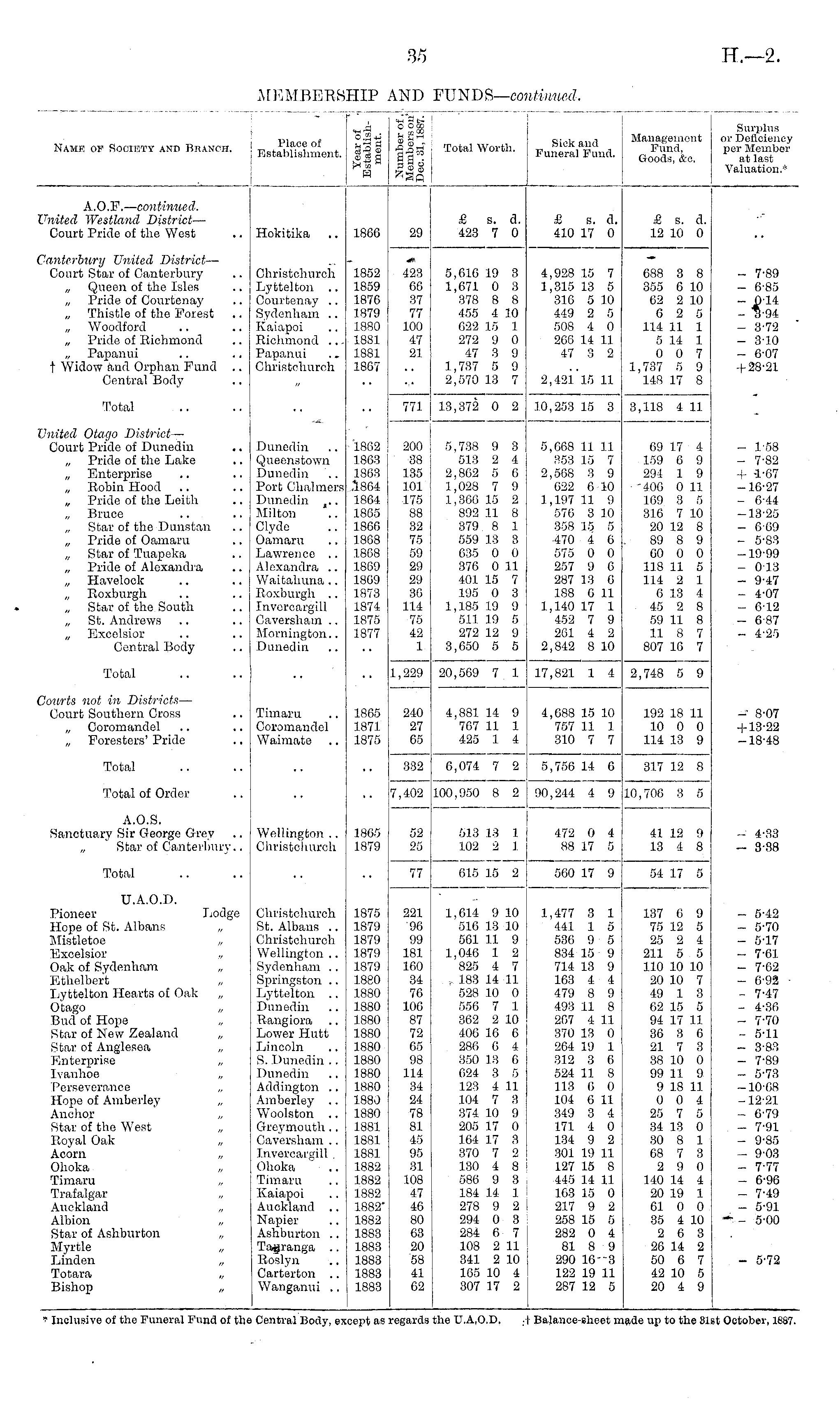 Name of Society ane Branch. Place of Establishment. Hi US Total Worth. Sick and Funeral Fund. Management Fund, Goods, &tt. Surplus or Deficiency per Member at last Valuation.' 5 I A.O.F. — continued. United Westland District — Court Pride of the West A s. d. 423 7 0 & s. a. 410 17 0 & s. d. 12 10 0 I-Iokitika 1866 29 Canterbury United District — Court Star of Canterbury „ Queen of the Isles „ Pride of Courtenay „ Thistle of the Forest .. „ Woodford „ Pride of Richmond „ Papanui t Widow and Orphan Fund .. Central Body Christchurch Lyttelton .. Courtenay .. Sydenham .. Kaiapoi Richmond .. Papanui Christchureh 1852 1859 1876 1879 1880 1881 1881 1867 423 66 37 77 100 47 21 5,616 19 3 1,671 0 3 378 8 8 455 4 10 622 15 1 272 9 0 47 3 9 1,737 5 9 2,570 18 7 4,928 15 7 1,315 13 5 316 5 10 449 2 5 508 4 0 266 14 11 47 3 2 688 3 8 355 6 10 02 2 10 6 2 5 114 11 1 5 14 1 0 0 7 1,737 5 9 148 17 8 - 7-89 - 6-85 - 0-14 - b-94 - 3-72 - 3-10 - 6-07 + 28-21 2, 421 '15 11 Total 771 13,372 0 2 10,253 15 3 3,118 4 11 United Otago District— Court Pride of Dunedin „ Pride of tlie Lake Enterprise „ Robin Hood „ Pride of the Leith „ Bruce „ Star of the Dims tan „ Pride of Oamaru „ Star of Tuapeka „ Pride of Alexandra „ Havelock „ Roxburgh „ Star of the South „ St. Andrews „ Excelsior Central Body Dunedin Queens town Dunedin Port Chalmers Dunedin Milton Clyde Oamaru Lawrence .. Alexandra .. Waitahuna .. Roxburgh .. Invorcargill Caversham .. Mornington.. Dunedin 1862 1863 1863 L-864 1864 1865 1866 1868 1868 1869 1869 1873 1874 1875 3877 200 38 135 101 175 88 32 75 59 29 29 30 114 75 42 1 5,738 9 3 513 2 4 2,862 5 6 1,028 7 9 1,366 15 2 892 11 8 379 8 1 559 13 3 635 0 0 376 0 11 401 15 7 195 0 3 1,185 19 9 511 19 5 272 12 9 3,650 5 5 5,608 11 11 353 15 7 2,568 3 9 622 6 10 1,197 11 9 570 3 10 358 15 5 470 4 6 575 0 0 257 9 6 287 13 0 188 6 11 1,140 17 1 452 7 9 2G1 4 2 2,842 8 10 69 17 4 159 6 9 294 1 9 ■400 0 11 169 3 5 3L6 7 10 20 12 8 89 8 9 00 0 0 118 11 5 114 2 1 6 13 4 45 2 8 59 11 8 11 8 7 807 16 7 - 1-68 - 7-82 + -1'67 -16-27 - 6-44 -13-25 - 609 - 5-83 -19-99 - 013 - 9-47 - 4-07 - 6-12 - 6-87 - 4-25 Total 1,229 20,509 7 1 17,821 1 4 2,748 5 9 - 8-07 + 13-22 -18-48 Courts not in District's — Court Southern Cross „ Coromandel „ Foresters' Pride Timaru Coromandel Waimate 1865 1871 1875 240 27 65 4,881 14 9 767 11 1 425 1 4 4,688 15 10 757 11 1 310 7 7 192 18 11 10 0 0 114 13 9 Total 332 6,074 7 2 5,756 14 6 317 12 8 Total of Order !7,402 1100,950 8 2 I 90,244 4 9 10,706 3 5 - 4-33 - 8-88 A.O.S. Sanctuary Sir George Grey Star of Canterbury.. ' Wellington .. Christchurch 1865 1879 52 | 25 > 513 13 1 102 2 1 I I 472 0 4 88 17 5 41 12 9 13 4 8 Total i 77 j I 615 15 2 560 17 9 54 17 5 U.A.O.D. Pioneer Lodge Hope of St. Albans „ Mistletoe Excelsior , Oak of Sydpnham Ethelbcr't Lyttelton Hearts of Oak „ Otago „ Bud of Hope Star of New Zealand Star of Anglesea „ Enterprise „ Tvanhoe „ Perseverance „ Hope of Amberley „ Anchor Star of the West Royal Oak Acorn „ Ohoka „ Tiraaru Trafalgar „ Auckland „ Albion „ Star of Ashburton Myrtle Linden „ Totara Bishop „ Christchurch St. Albans .. Christoliurch Wellington .. Sydenham .. Springston .. Lyttelton .. Dunedin Rangiora Lower Hutt Lincoln S. Dunedin .. Dunedin Addington .. Amberley .. Woolston .. Greymouth.. Caversham .. Invereargill . Ohoka Timaru Kaiapoi Auckland .. Napier Ashburton .. Tagranga .. Roslyn Carterton .. Wanganui .. 1875 1879 1879 1879 1879 1880 1880 1880 1880 1880 1880 1880 1880 1880 1880 1880 1881 1881 1881 1882 1882 1882 1882' 1882 1883 1883 1883 1883 1883 221 96 99 181 160 34 76 106 87 72 65 98 114 34 24 78 81 45 95 31 108 47 40 80 63 20 58 41 62 I 1,614 9 10 516 13 10 561 11 9 1,046 1 2 825 4 7 183 14 11 528 10 0 556 7 1 362 2 10 406 16 6 286 6 4 350 13 6 624 3 5 123 4 11 104 7 3 374 10 9 205 17 0 164 17 3 370 7 2 130 i 8 586 9 3 184 14 1 278 9 2 294 0 3 284 6 7 108 2 11 341 2 10 165 10 4 307 17 2 i 1.477 3 1 441 1 5 536 9 5 834 15 9 714 13 9 163 4 4 479 8 9 493 11 8 207 4 11 370 13 0 264 19 1 312 3 6 524 11 8 113 6 0 104 6 11 349 3 4 171 4 0 134 9 2 301 19 11 127 15 8 445 14 11 163 15 0 217 9 2 258 15 5 282 0 4 81 8 9 290 16 3 122 19 11 287 12 5 137 6 9 75 12 5 25 2 4 211 5 5 110 10 10 20 10 7 49 1 3 62 15 5 94 17 11 36 3 6 21 7 3 38 10 0 99 11 9 9 18 11 0 0 4 25 7 5 34 13 0 30 8 1 68 7 3 2 9 0 140 14 4 20 19 1 61 0 0 35 4 10 2 6 3 26 14 2 50 6 7 42 10 5 20 4 9 - 5-42 - 5-70 - 5-17 - 7-01 - 7-62 - 6-92 ■ - 7-47 - 4-36 - 7-70 - 5-11 - 3-83 - 7-89 - 5-73 -10-68 -12-21 - 6-79 - 7-91 - 9-85 - 903 - 7-77 - 6-96 - 7-49 - 5-91 - - 5-00 - 5-72 ♦ Inclusive oi the Funeral Fund of the Central Body, except as regards the U.A.O.D. ■ I Balance-sheet made up to the 81st October, 1887.