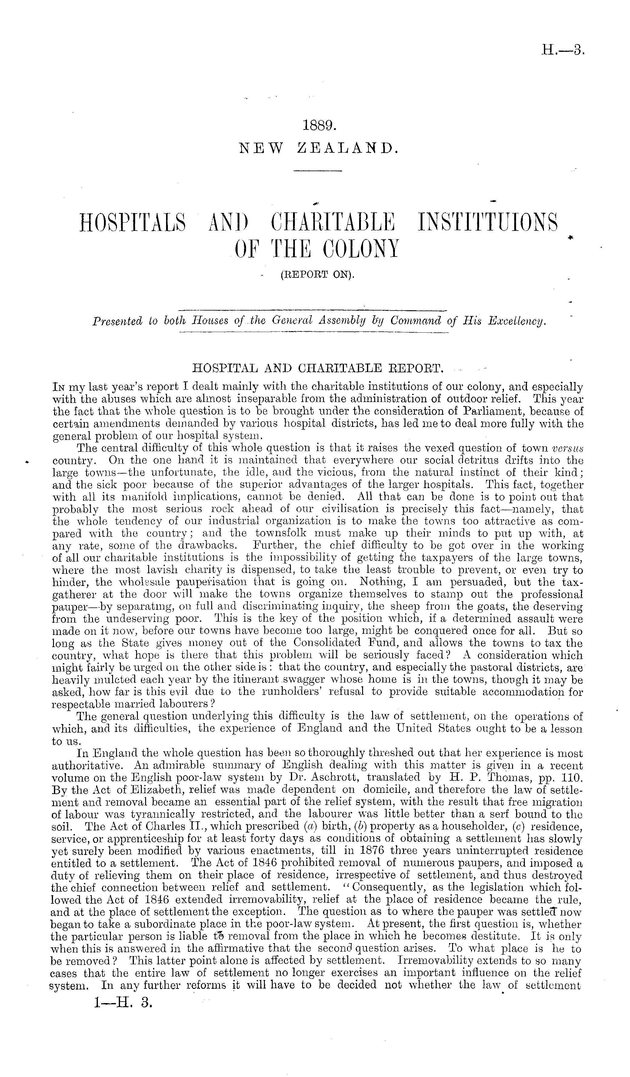 HOSPITAL AND GHAEITABLE EEPOET. In my last year's report I dealt mainly with the charitable institutions of our colony, and especially with the abuses which are almost inseparable from the administration of outdoor relief. This year the fact that the whole question is to be brought under the consideration of Parliament, because of certain amendments demanded by various hospital districts, has led me to deal more fully with the general problem of our hospital system. The central difficulty of this whole question is that it raises the vexed question of town versus country. On the one hand it is maintained that everywhere our social detritus drifts into the large towns—the unfortunate, the idle, and the vicious, from the natural instinct of their kind; and the sick poor because of the superior advantages of the larger hospitals. This fact, together with all its manifold implications, cannot be denied. All that can be clone is to point out that probably the most serious rock ahead of our civilisation is precisely this fact —namely, that the whole tendency of our industrial organization is to make the towns too attractive as compared with the country; and the townsfolk must make up their minds to put up with, at any rate, some of the drawbacks. Further, the chief difficulty to be got over in the working of all our charitable institutions is the impossibility of getting the taxpayers of the large towns, where the most lavish charity is dispensed, to take the least trouble to prevent, or even try to hinder, the wholesale pauperisation that is going on. Nothing, I am persuaded, but the taxgatherer at the door will make the towns organize themselves to stamp out the professional pauper—by separating, on full and discriminating inquiry, the sheep from the goats, the deserving from the undeserving poor. This is the key of the position which, if a determined assault were made on it now, before our towns have become too large, might be conquered once for all. But so long as the State gives money out of the Consolidated Fund, and allows the towns to tax the country, what hope is there that this problem will be seriously faced ? A consideration which might fairly be urged on the other side is : that the country, and especially the pastoral districts, are heavily mulcted each year by the itinerant .swagger whose home is in the towns, though it may be asked, how far is this evil due to the runholders' refusal to provide suitable accommodation for respectable married labourers ? The general question underlying this difficulty is the law of settlement, on the operations of which, and its difficulties, the experience of England and the United States ought to be a lesson to us. In England the whole question has been so thoroughly threshed out that her experience is most authoritative. An admirable summary of English dealing with this matter is given in a recent volume on the English poor-law system by Dr. Aschrott, translated by H. P. Thomas, pp. 110. By the Act of Elizabeth, relief was made dependent on domicile, and therefore the law of settlement and removal became an essential part of the relief system, with the result that free migration of labour was tyrannically restricted, and the labourer was little better than a serf bound to the soil. The Act of Charles 11., which prescribed (a) birth, (b) property as a householder, (c) residence, service, or apprenticeship for at least forty days as conditions of obtaining a settlement has slowly yet surely been modified by various enactments, till in 1876 three years uninterrupted residence entitled to a settlement. The Act of 1846 prohibited removal of numerous paupers, and imposed a duty of relieving them on their place of residence, irrespective of settlement, and thus destroyed the chief connection between relief and settlement. "Consequently, as the legislation which followed the Act of 1846 extended irremovability, relief at the place of residence became the rule, and at the place of settlement the exception. The question as to where the pauper was settled" now began to take a subordinate place in the poor-law system. At present, the first question is, whether the particular person is liable i"& removal from the place in which he becomes destitute. It is only when this is answered in the affirmative that the second question arises. To what place is he to be removed ? This latter point alone is affected by settlement. Irremovability extends to so many cases that the entire law of settlement no longer exercises an important influence on the relief system. In any further reforms it will have to be decided not whether the law of settlement I—H. 3.