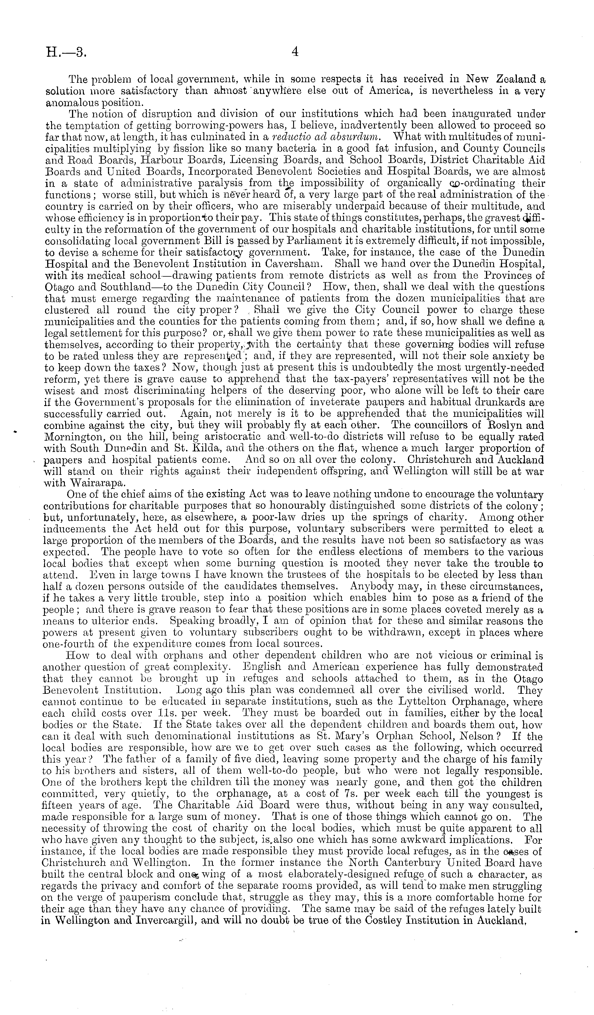 The problem of local government, while in some respects it has received in New Zealand a solution more satisfactory than almost anywhere else out of America, is nevertheless in a very anomalous position. The notion of disruption and division of our institutions which had been inaugurated under the temptation of getting borrowing-powers has, I believe, inadvertently been allowed to proceed so far that now, at length, it has culminated in a reductio ad absurdum. What with multitudes of municipalities multiplying by fission like so many bacteria in a good fat infusion, and County Councils and Eoad Boards, Harbour Boards, Licensing Boards, and School Boards, District Charitable Aid Boards and United Boards, Incorporated Benevolent Societies and Hospital Boards, we are almost in a state of administrative paralysis from the impossibility of organically co-ordinating their functions ; worse still, but which is never heard of, a very large part of the real administration of the country is carried on by their officers, who are miserably underpaid because of their multitude, and whose efficiency is in proportion *to their pay. This state of things constitutes, perhaps, the gravest difficulty in the reformation of the government of our hospitals and charitable institutions, for until some consolidating local government Bill is passed by Parliament it is extremely difficult, if not impossible, to devise a scheme for their satisfactory government. Take, for instance, the case of the Dunedin Hospital and the Benevolent Institution in Caversham. Shall we hand over the Dunedin Hospital, with its medical school—drawing patients from remote districts as well as from the Provinces of Otago and Southland —to the Dunedin City Council? How, then, shall we deal with the questions that must emerge regarding the maintenance of patients from the dozen municipalities that are clustered all round the city proper ? Shall we give the City Council power to charge these municipalities and the counties for the patients coming from them; and, if so, how shall we define a legal settlement for this purpose? or, shall we give them power to rate these municipalities as well as themselves, according to their property, with the certainty that these governing bodies will refuse to be rated unless they are represented ; and, if they are represented, will not their sole anxiety be to keep down the taxes? Now, though just at present this is undoubtedly the most urgently-needed reform, yet there is grave cause to apprehend that the tax-payers' representatives will not be the wisest and most discriminating helpers of the deserving poor, who alone will be left to their care if the Government's proposals for the elimination of inveterate paupers and habitual drunkards are successfully carried out. Again, not merely is it to be apprehended that the municipalities will combine against the city, but they will probably fly at each other. The councillors of Eoslyn and Mornington, on the hill, being aristocratic and well-to-do districts will refuse to be equally rated with South Dun^din and St. Kilda, and the others on the flat, whence a much larger proportion of paupers and hospital patients come. And so on all over the colony. Christchurch and Auckland will stand on their rights against their independent offspring, and Wellington will still be at war with Wairarapa. One of the chief aims of the existing Act was to leave nothing undone to encourage the voluntary contributions for charitable purposes that so honourably distinguished some districts of the colony; but, unfortunately, her.c, as elsewhere, a poor-law dries up the springs of charity. Among other inducements the Act held out for this purpose, voluntary subscribers were permitted to elect a large proportion of the members of the Boards, and the results have not been so satisfactory as was expected. The people have to vote so often for the endless elections of members to the various local bodies that except when some burning question is mooted they never take the trouble to attend. Even in large towns I have known the trustees of the hospitals to be elected by less than half a dozen persons outside of the candidates themselves. Anybody may, in these circumstances, if he takes a very little trouble, step into a position which enables him to pose as a friend of the people ; and there is grave reason to fear that these positions are in some places coveted merely as a means to ulterior ends. Speaking broadly, I am of opinion that for these and similar reasons the powers at present given to voluntary subscribers ought to be withdrawn, except in places where one-fourth of the expenditure comes from local sources. How to deal with orphans and other dependent children who are not vicious or criminal is another question of great complexity. English and American experience has fully demonstrated that they cannot be brought up in refuges and schools attached to them, as in the Otago Benevolent Institution. Long ago this plan was condemned all over the civilised world. They cannot continue to be educated in. separate institutions, such as the Lyttelton Orphanage, where each child costs over 11s. per week. They must be boarded out in families, either by the local bodies or the State. If the State takes over all the dependent children and boards them out, how can it deal with such denominational institutions as St. Mary's Orphan School, Nelson? If the local bodies are responsible, how are we to get over such cases as the following, which occurred this year ? The father of a family of five died, leaving some property and the charge of his family to his brothers and sisters, all of them well-to-do people, but who were not legally responsible. One of the brothers kept the children till the money was nearly gone, and then got the children committed, very quietly, to the orphanage, at a cost of 7s. per week each till the youngest is fifteen years of age. The Charitable Aid Board were thus, withou