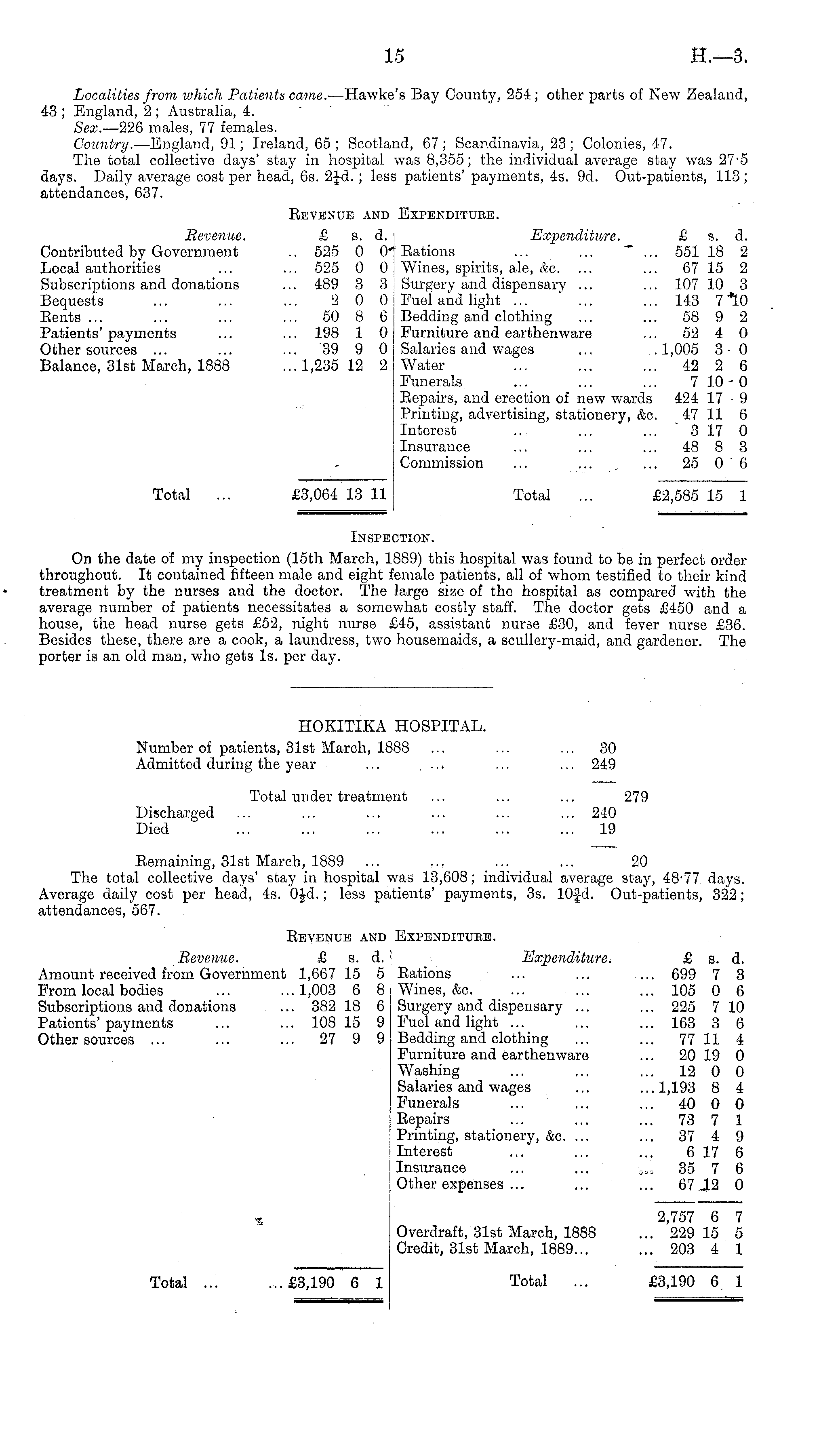 Localities from which Patients came. —Hawke's Bay County, 254 ; other parts of New Zealand, 43 ; England, 2 ; Australia, 4. Sex.—226 males, 77 females. Country. —England, 91; Ireland, 65 ; Scotland, 67 ; Scandinavia, 23 ; Colonies, 47. The total collective days' stay in hospital was 8,355; the individual average stay was 275 days. Daily average cost per head, 6s. 2Jd. ; less patients' payments, 4s. 9d. Out-patients, 113 ; attendances, 637. Revenue and Expenditure. Bevenue. & s. d. ; Expenditure. £ s. d. Contributed by Government .. 525 0 Of Rations ... ... "... 551 18 2 Local authorities ... ... 525 0 0 Wines, spirits, ale, &c. ... ... 67 15 2 Subscriptions and donations ... 489 3 3 Surgery and dispensary ... ... 107 10 3 Bequests ... ... ... 2 0 0 j Fuel and light ... ... ... 143 7*lo Rents... ... ... ... 50 8 6 | Bedding and clothing ... ... 58 9 2 Patients' payments ... ... 198 1 0 j Furniture and earthenware ... 52 4 0 Other sources ... ... ... '39 9 0 i Salaries and wages ... .1,005 3- 0 Balance, 31st March, 1888 ...1,235 12 2 I Water ... ... ... 42 2 6 Funerals ... ... ... 7 10 ' 0 Repairs, and erection of new wards 424 17 - 9 Printing, advertising, stationery, &c. 47 11 6 Interest ... ... ... 3 17 0 Insurance ... ... ... 48 8 3 Commission ... ... ... 25 0 6 Total ... £3,064 13 11! Total ... £2,585 15 1 Inspection. On the date of my inspection (15th March, 1889) this hospital was found to be in perfect order throughout. It contained fifteen male and eight female patients, all of whom testified to their kind treatment by the nurses and the doctor. The large size of the hospital as compared with the average number of patients necessitates a somewhat costly staff. The doctor gets £450 and a house, the head nurse gets £52, night nurse £45, assistant nurse £30, and fever nurse £36. Besides these, there are a cook, a laundress, two housemaids, a scullery-maid, and gardener. The porter is an old man, who gets Is. per day.