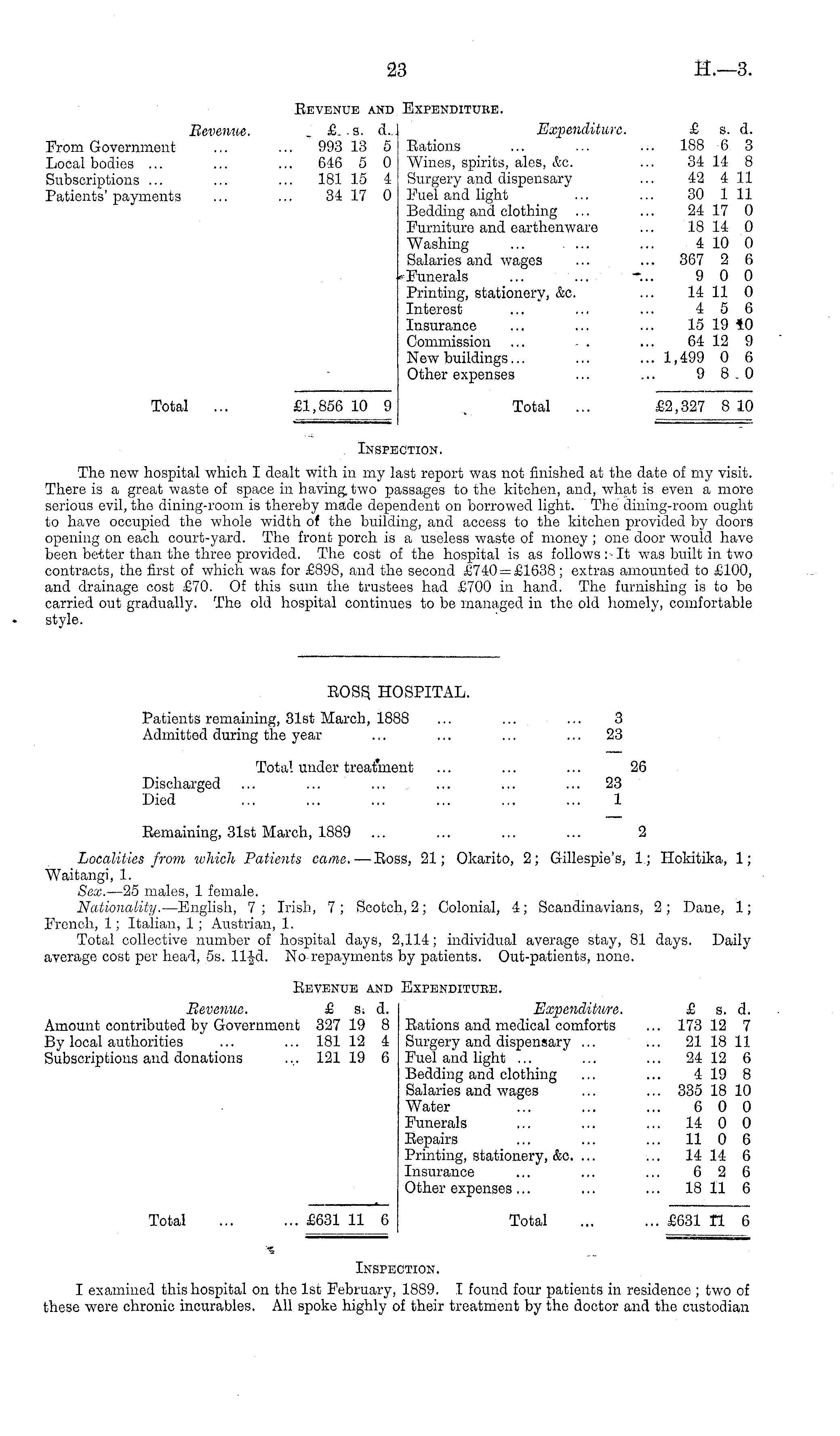 ROSS, HOSPITAL. Patients remaining, 31st March, 1888 ... ... ... 3 Admitted during the year ... ... ... ... 23 Total under treatment ... ... ... 26 Discharged ... ... ... ... ... ... 23 Died ... ... ... ... ... ... 1 Remaining,.3lst March, 1889 ... ... ... ... 2 Localities from which Patients came. — Boss, 21; Okarito, 2; Gillespie's, 1; Hokitika, 1; Waitangi, 1. Sex. —2s males, 1 female. Nationality. —English, 7; Irish, 7; Scotch, 2; Colonial, 4; Scandinavians, 2; Dane, 1; French, 1; Italian, 1 ; Austrian, 1. Total collective number of hospital days, 2,114; individual average stay, 81 days. Daily average cost per head, ss. 11-Jd. No repayments by patients. Out-patients, none. Revenue and Expenditure. Revenue. £ s. d. Expenditure. £ s. d. Amount contributed by Government 327 19 8 Bations and medical comforts ... 173 12 7 By local authorities ... ... 181 12 4 Surgery and dispensary ... ... 21 18 11 Subscriptions and donations .... 121 19 6 Fuel and light ... ... ... 24 12 6 Bedding and clothing ... ... 419 8 Salaries and wages ... ... 335 18 10 Water ... ... ... 6 0 0 Funerals ... ... ... 14 0 0 Repairs ... ... ... 11 0 6 Printing, stationery, &c. ... ... 14 14 6 Insurance ... ... ... 626 Other expenses... ... ... 18116 Total £631 11 6 Total £631 TL 6 Inspection. I examined this hospital on the Ist February, 1889. I found four patients in residence ; two of these were chronic incurables. All spoke highly of their treatment by the doctor and the custodian