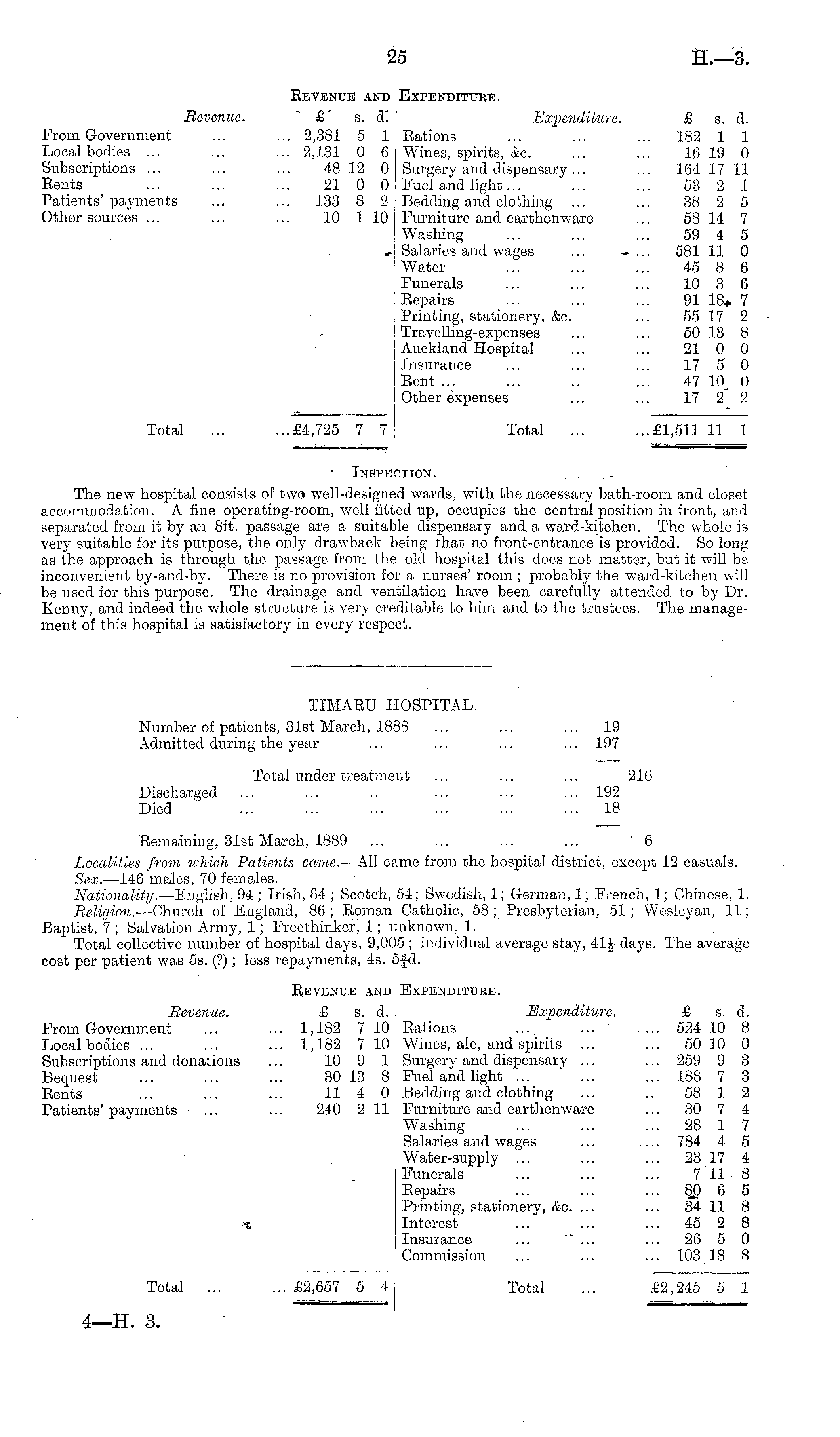 Revenue and Expendituke. Bevenue. £' s. d. Expenditure. £ s. d. From Government ... ... 2,381 5 1 Rations ... ... ... 182 1 1 Local bodies ... ... ... 2,131 0 6 Wines, spirits, &c. ... ... 16 19 0 Subscriptions ... ... ... 48 12 0 Surgery and dispensary... ... 164 17 11 Rents ... ... ... 21 0 0 Fuel and light... ... ... 53 2 1 Patients'payments ... ... 133 8 2 Bedding and clothing ... ... 38 2 5 Other sources ... ... ... 10 1 10 Furniture and earthenware ... 58 14 7 Washing ... ... ... 59 4 5 « Salaries and wages ... — ... 581 11 0 Water ... ... ... 45 8 6 Funerals ... ... ... 10 3 6 Repairs ... ... ... 91 18* 7 Printing, stationery, &c. ... 55 17 2 Travelling-expenses ... ... 50 13 8 Auckland Hospital ... ... 21 0 0 Insurance ... ... ... 17 S 0 Rent ... ... .. ... 47 10. 0 Other expenses ... ... 17 2' 2 Total ... ...£4,725 7 7 Total ... ...£1,511 11 1 Inspection. The new hospital consists of two well-designed wards, with the necessary bath-room and closet accommodation. A fine operating-room, well fitted up, occupies the central position in front, and separated from it by an Bft. passage are a suitable dispensary and a ward-kitchen. The whole is very suitable for its purpose, the only drawback being that no front-entrance is provided. So long as the approach is through the passage from the old hospital this does not matter, but it will bs inconvenient by-and-by. There is no provision for a nurses' room ; probably the ward-kitchen will be used for this purpose. The drainage and ventilation have been carefully attended to by Dr. Kenny, and indeed the whole structure is very creditable to him and to the trustees. The management of this hospital is satisfactory in every respect.