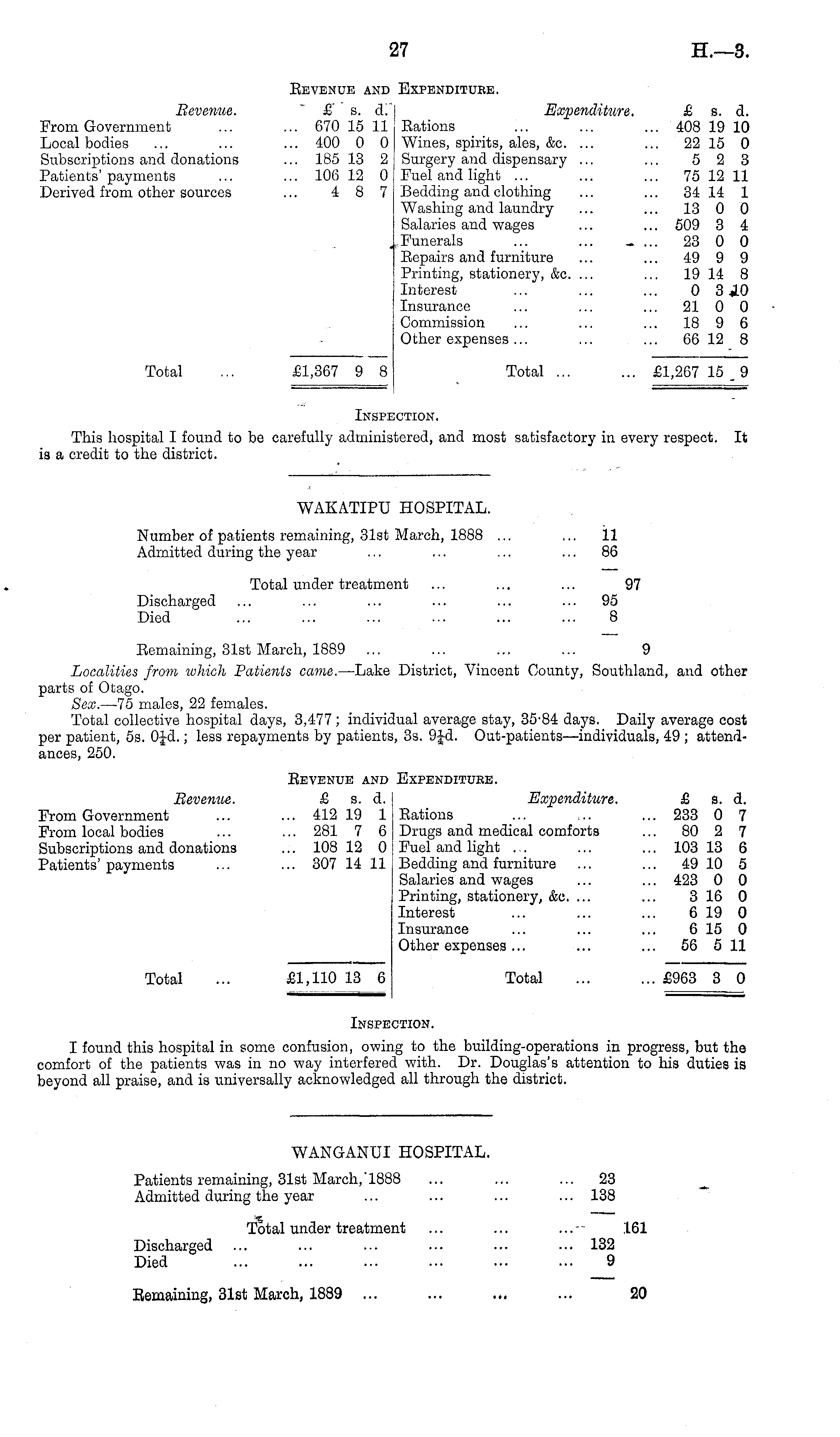 WANGANUI HOSPITAL. Patients remaining, 31st March, 1888 ... ... ... 23 Admitted during the year ... ... ... ... 138 Total under treatment ... ... ...— .161 Discharged ... ... ... ... ... ... 132 Died 9 Eemaining, 31st March, 1889 ... ... ... ... 20