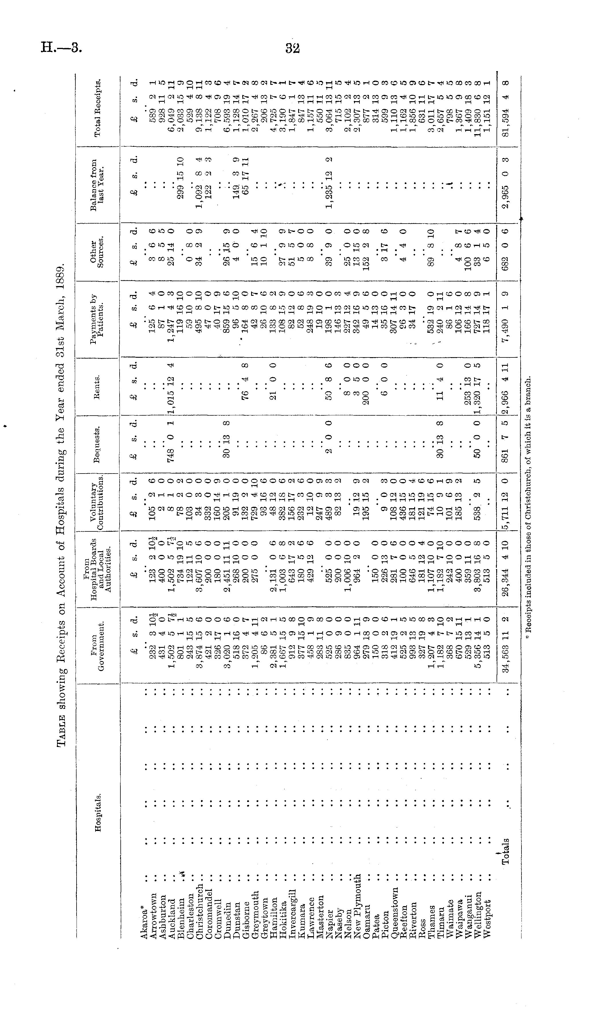 Table showing Receipts on Account of Hospitals during the Year ended 31st March, 1889.