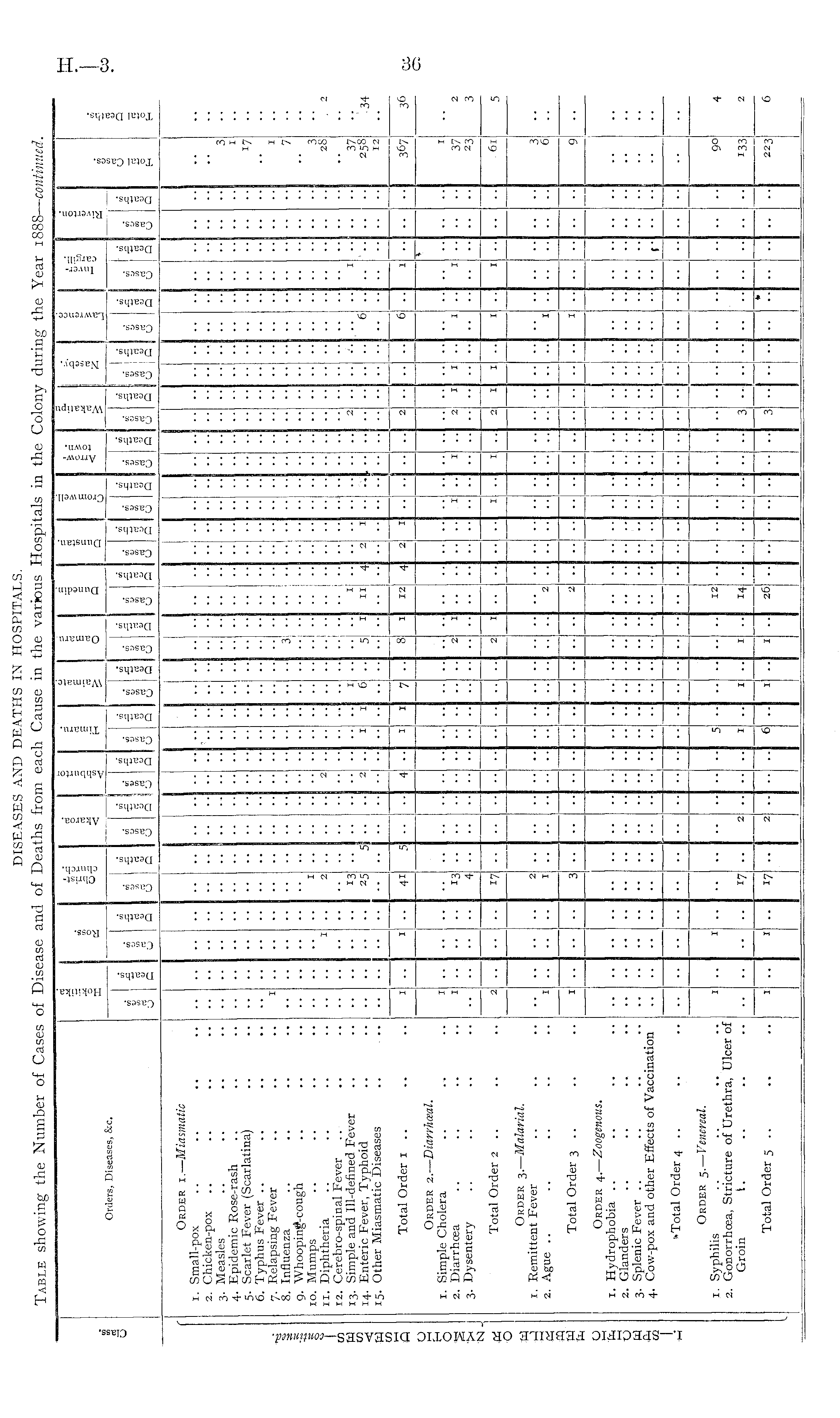 DISEASES AND DEATHS IN HOSPITALS. Table showing the Number of Cases of Disease and of Deaths from each Cause in the various Hospitals in the Colony during the Year 1888— continued.