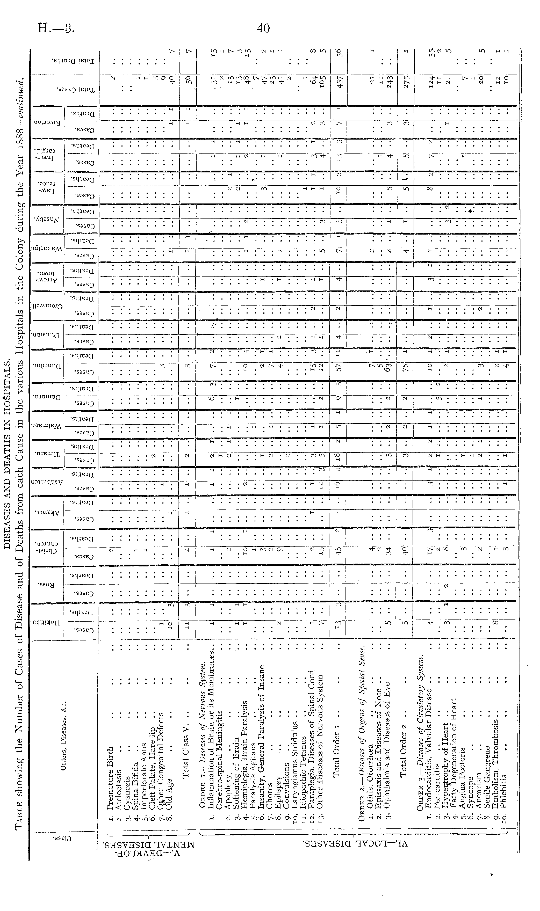 DISEASES AND DEATHS IN HOSPITALS. Table showing the Number of Cases of Disease and of Deaths from each Cause in the various Hospitals in the Colony during the Year 1888— continued.