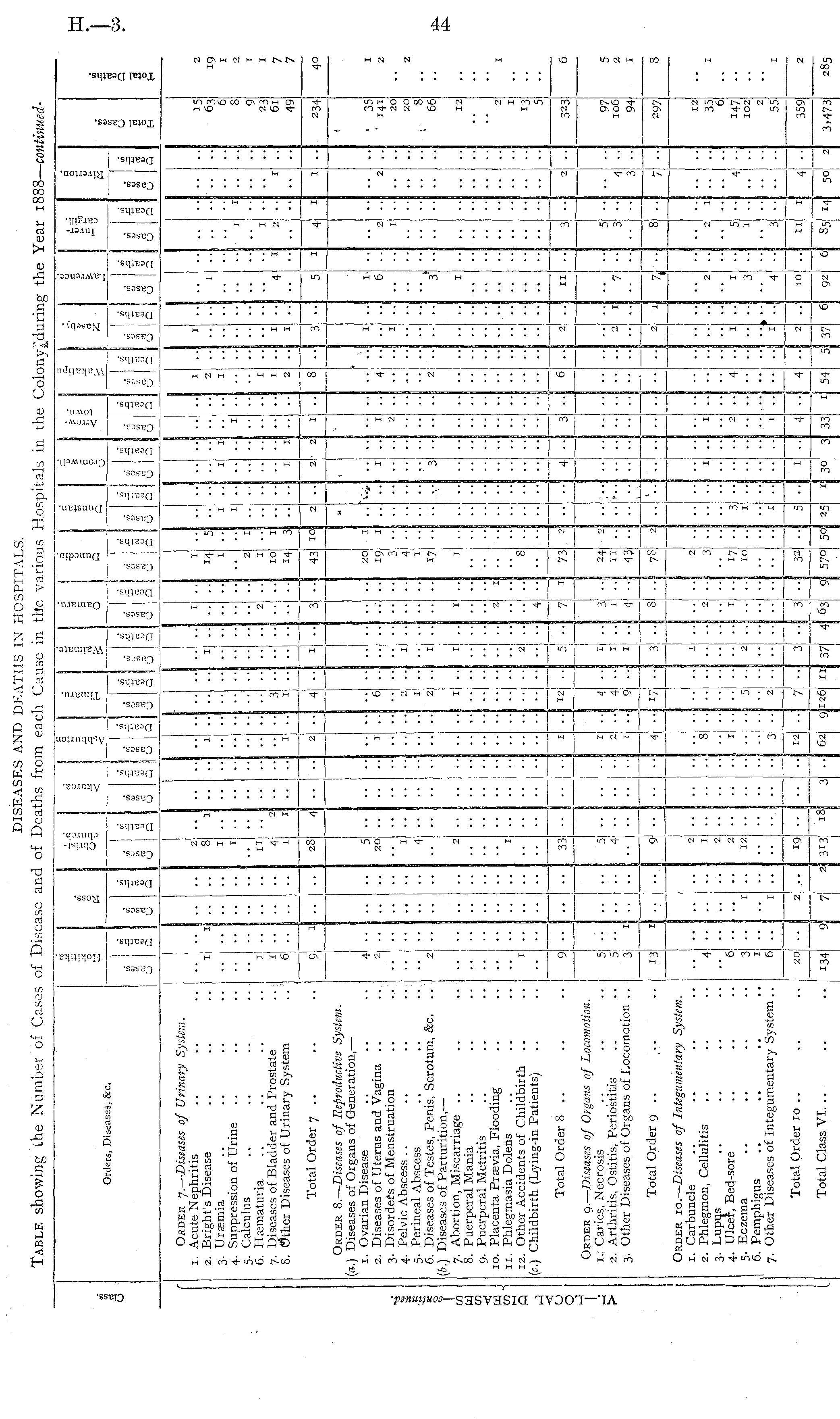 DISEASES AND DEATHS IN HOSPITALS. Table showing the Number of Cases of Disease and of Deaths from each Cause in the various Hospitals in the Colony the Year 1888— continued.