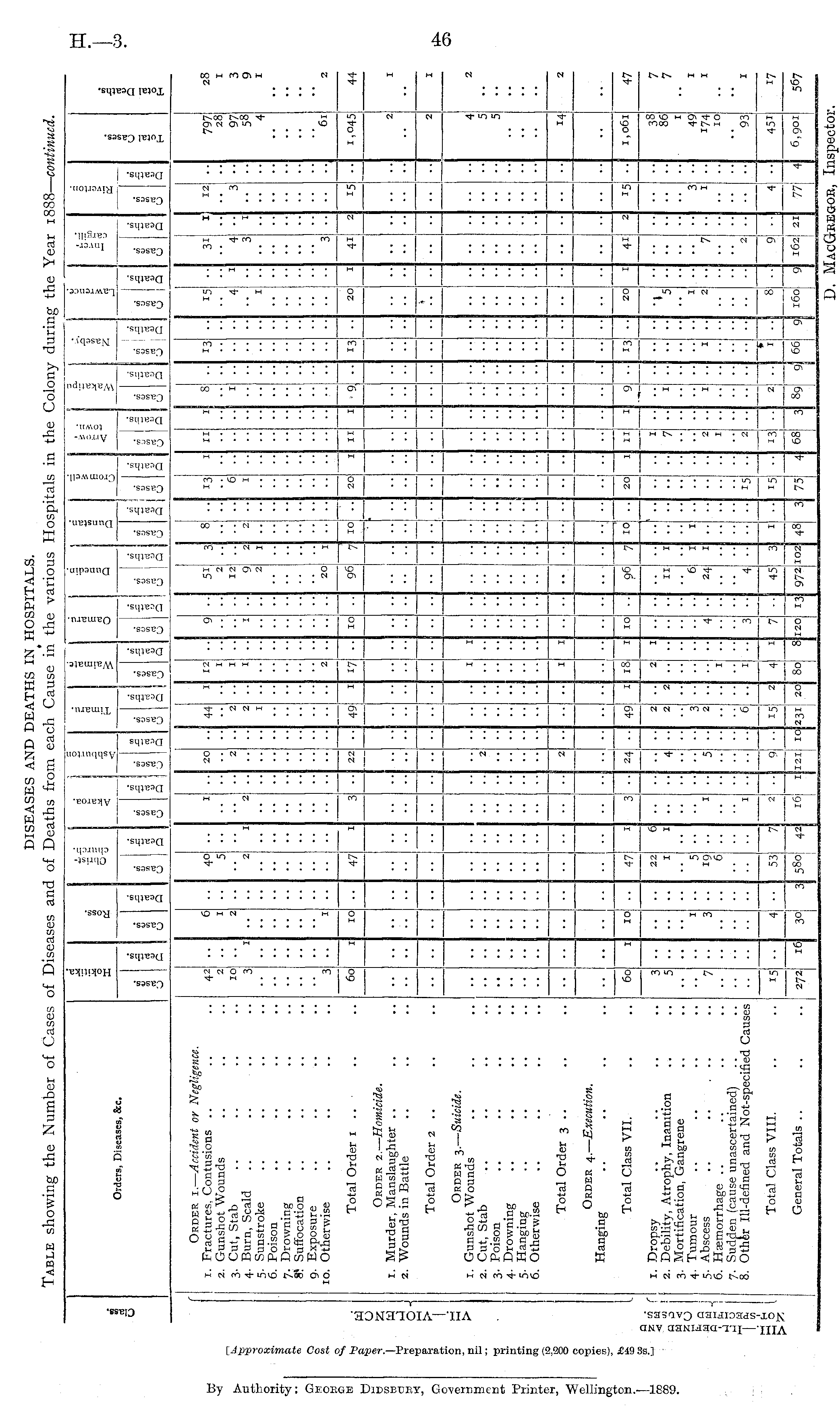 DISEASES AND DEATHS IN HOSPITALS. Table showing the Number of Cases of Diseases and of Deaths from each Cause in the various Hospitals in the Colony during the Year 1888— continued.