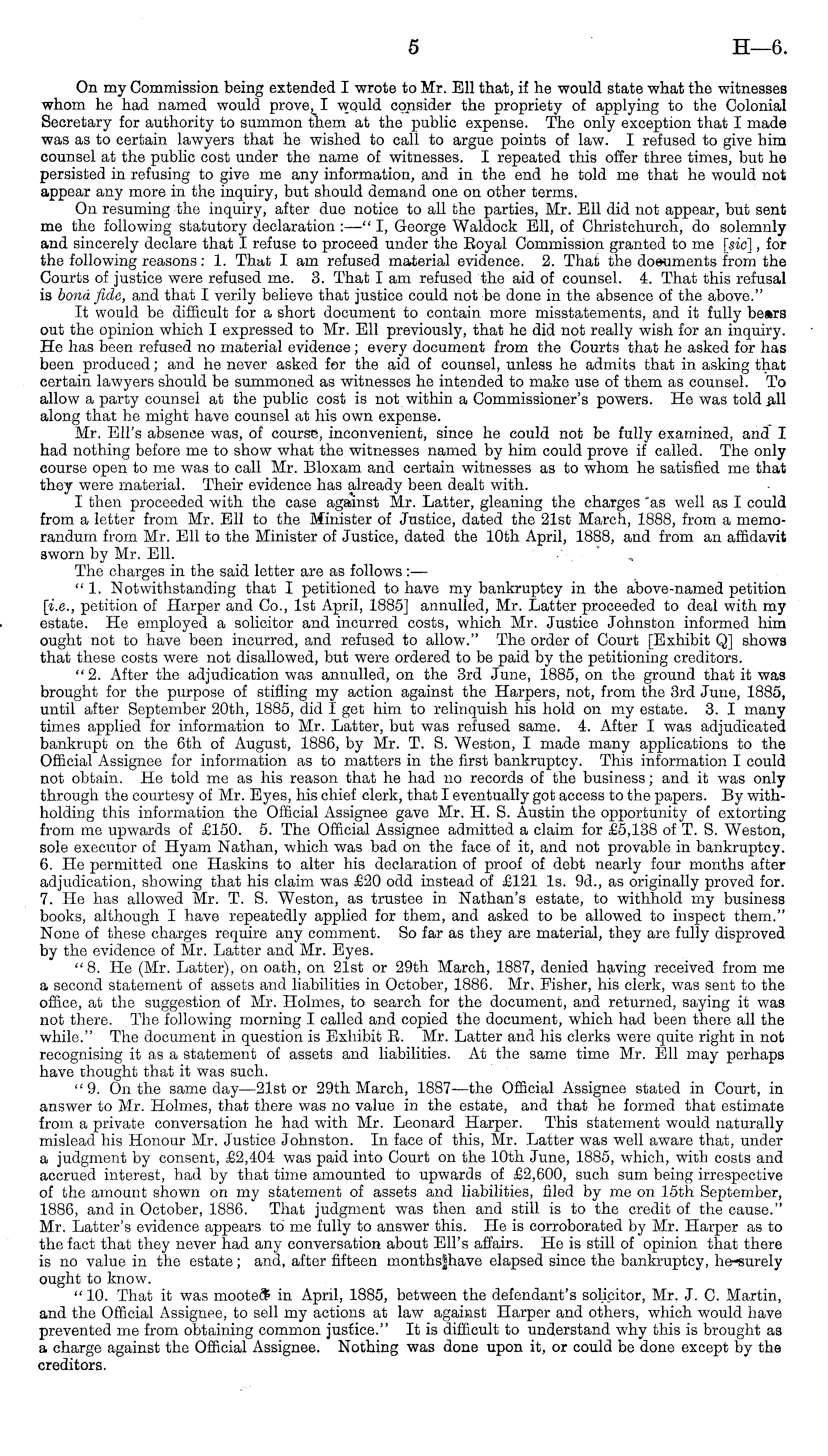 On my Commission being extended I wrote to Mr. Ell that, if he would state what the witnesses whom he had named would prove, I would consider the propriety of applying to the Colonial Secretary for authority to summon them at the public expense. The only exception that I made was as to certain lawyers that he wished to call to argue points of law. I refused to give him counsel at the public cost under the name of witnesses. I repeated this offer three times, but he persisted in refusing to give me any information, and in the end he told me that he would not appear any more in the inquiry, but should demand one on other terms. On resuming the inquiry, after due notice to all the parties, Mr. Ell did not appear, but sent me the following statutory declaration : —" I, George Waldock Ell, of Christchurch, do solemnly and sincerely declare that I refuse to proceed under the Eoyal Commission granted to me [sic], for the following reasons: 1. That I am refused material evidence. 2. That the documents from the Courts of justice were refused me. 3. That lam refused the aid of counsel. 4. That this refusal is bond fide, and that I verily believe that justice could not be done in the absence of the above." It would be difficult for a short document to contain more misstatements, and it fully bears out the opinion which I expressed to Mr. Ell previously, that he did not really wish for an inquiry. He has been refused no material evidence; every document from the Courts that he asked for has been produced; and he never asked for the aid of counsel, unless he admits that in asking that certain lawyers should be summoned as witnesses he intended to make use of them as counsel. To allow a party counsel at the public cost is not within a Commissioner's powers. He was told .all along that he might have counsel at his own expense. Mr. Ell's absence was, of course, inconvenient, since he could not be fully examined, and I had nothing before me to show what the witnesses named by him could prove if called. The only course open to me was to call Mr. Bloxam and certain witnesses as to whom he satisfied me that they were material. Their evidence has already been dealt with. I then proceeded with the case against Mr. Latter, gleaning the charges "as well as I could from a letter from Mr. Ell to the Minister of Justice, dated the 21st March, 1888, from a memorandum from Mr. Ell to the Minister of Justice, dated the 10th April, 1888, and from an affidavit sworn by Mr. Ell. The charges in the said letter are as follows: — " 1. Notwithstanding that I petitioned to have my bankruptcy in the above-named petition [i.e., petition of Harper and Co., Ist April, 1885] annulled, Mr. Latter proceeded to deal with my estate. He employed a solicitor and incurred costs, which Mr. Justice Johnston informed him ought not to have been incurred, and refused to allow." The order of Court [Exhibit Q] shows that these costs were not disallowed, but were ordered to be paid by the petitioning creditors. "2. After the adjudication was annulled, on the 3rd June, 1885, on the ground that it was brought for the purpose of stifling my action against the Harpers, not, from the 3rd June, 1885, until after September 20th, 1885, did I get him to relinquish his hold on my estate. 3. I many times applied for information to Mr. Latter, but was refused same. 4. After I was adjudicated bankrupt on the 6th of August, 1886, by Mr. T. S. Weston, I made many applications to the Official Assignee for information as to matters in the first bankruptcy. This information I could not obtain. He told me as his reason that he had no records of the business; and it was only through the courtesy of Mr. Eyes, his chief clerk, that I eventually got access to the papers. By withholding this information the Official Assignee gave Mr. H. S. Austin the opportunity of extorting from me upwards of £150. 5. The Official Assignee admitted a claim for £5,138 of T. S. Weston, sole executor of Hyam Nathan, which was bad on the face of it, and not provable in bankruptcy. 6. He permitted one Haskins to alter his declaration of proof of debt nearly four months after adjudication, showing that his claim was £20 odd instead of £121 Is. 9d., as originally proved for. 7. He has allowed Mr. T. S. Weston, as trustee in Nathan's estate, to withhold my business books, although I have repeatedly applied for them, and asked to be allowed to inspect them." None of these charges require any comment. So far as they are material, they are fully disproved by the evidence of Mr. Latter and Mr. Eyes. "8. He (Mr. Latter), on oath, on 21st or 29th March, 1887, denied having received from me a second statement of assets and liabilities in October, 1886. Mr. Fisher, his clerk, was sent to the office, at the suggestion of Mr. Holmes, to search for the document, and returned, saying it was not there. The following morning I called and copied the document, which had been there all the while." The document in question is Exhibit E. Mr. Latter and his clerks were quite right in not recognising it as a statement of assets and liabilities. At the same time Mr. Ell may perhaps have thought that it was such. "9. On the same day—2lst or 29th March, 1887 —the Official Assignee stated in Court, in answer to Mr. Holmes, that there was no value in the estate, and that he formed that estimate from a private conversation he had with Mr. Leonard Harper. This statement would naturally mislead his Honour Mr. Justice Johnston. In face of this, Mr. Latter was well aware that, under a judgment by consent, £2,404 was paid into Court on the 10th June, 1885, which, with costs and accrued interest, had by that time amounted to upwards of £2,600, such sum being irrespective of the amount shown on my statement of assets and liabilities, filed by me on 15tb September, 1886, and in October, 1886. That judgment was then and still is to the credit of the cause." Mr. Latter's evidence appears to me fully to answer this