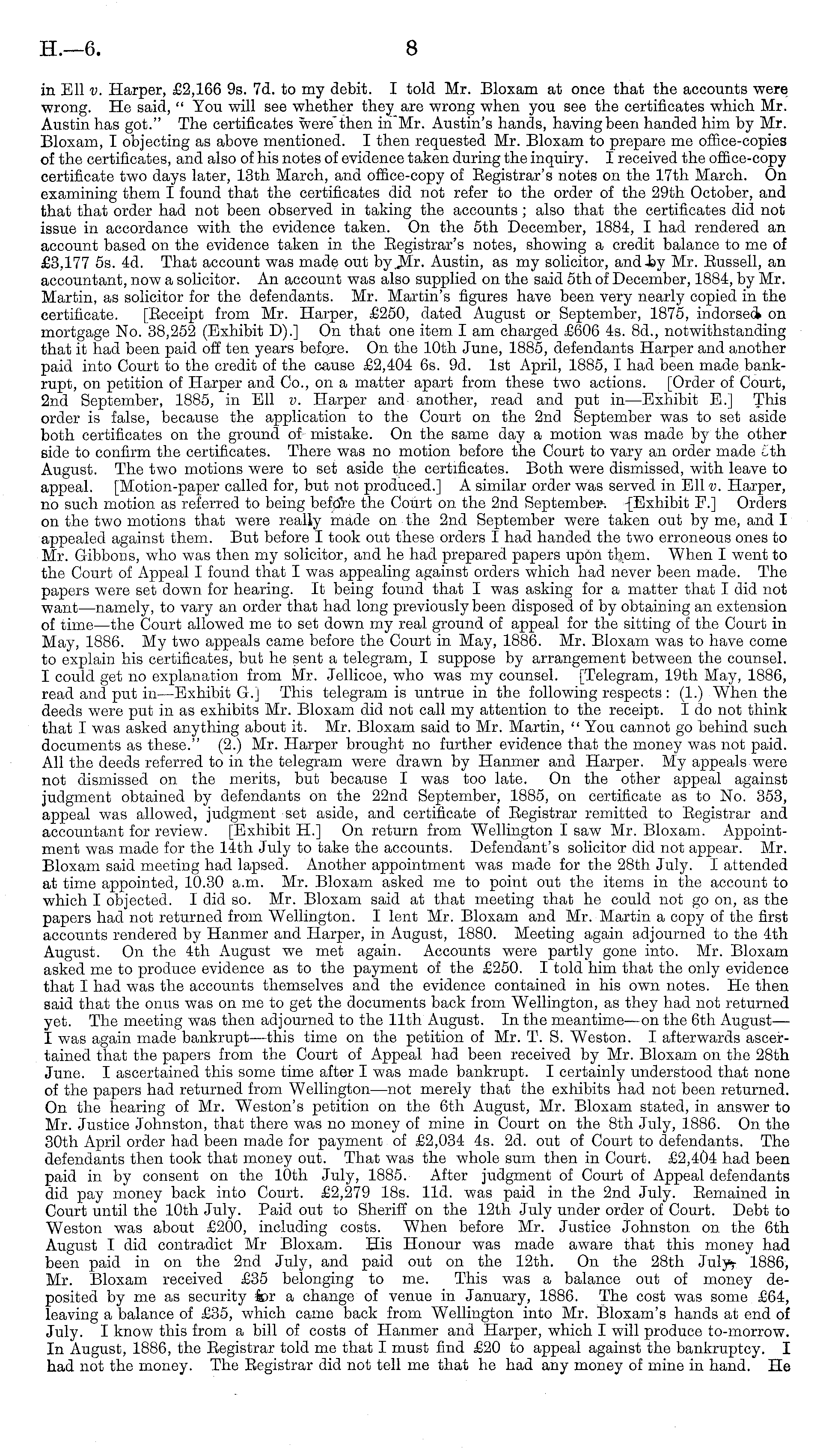 in Ell v. Harper, £2,166 9s. 7d. to my debit. I told Mr. Bloxam at once that the accounts were wrong. He said, " You will see whether they are wrong when you see the certificates which Mr. Austin has got." The certificates were'then in Mr. Austin's hands, having been handed him by Mr. Bloxam, I objecting as above mentioned. I then requested Mr. Bloxam to prepare me office-copies of the certificates, and also of his notes of evidence taken during the inquiry. I received the office-copy certificate two days later, 13th March, and office-copy of Begistrar's notes on the 17th March. On examining them I found that the certificates did not refer to the order of the 29th October, and that that order had not been observed in taking the accounts ; also that the certificates did not issue in accordance with the evidence taken. On the sth December, 1884, I had rendered an account based on the evidence taken in the Begistrar's notes, showing a credit balance to me of £3,177 ss. 4d. That account was made out by Mr- Austin, as my solicitor, and-by Mr. Russell, an accountant, now a solicitor. An account was also supplied on the said sth of December, 1884, by Mr. Martin, as solicitor for the defendants. Mr. Martin's figures have been very nearly copied in the certificate. [Receipt from Mr. Harper, £250, dated August or September, 1875, indorsed on mortgage No. 38,252 (Exhibit D).] On that one item lam charged £606 4s. Bd., notwithstanding that it had been paid off ten years before. On the 10th June, 1885, defendants Harper and another paid into Court to the credit of the cause £2,404 6s. 9d. Ist April, 1885, I had been made bankrupt, on petition of Harper and Co., on a matter apart from these two actions. [Order of Court, 2nd September, 1885, in Ell v. Harper and another, read and put in—Exhibit E.] This order is false, because the application to the Court on the 2nd September was to set aside both certificates on the ground of mistake. On the same day a motion was made by the other side to confirm the certificates. There was no motion before the Court to vary an order made £th August. The two motions were to set aside the certificates. Both were dismissed, with leave to appeal. [Motion-paper called for, but not produced.] A similar order was served in Ell-y. Harper, no such motion as referred to being before the Court on the 2nd September-. {Exhibit F.] Orders on the two motions that were really made on the 2nd September were taken out by me, and I appealed against them. But before I took out these orders I had handed the two erroneous ones to Mr. Gibbons, who was then my solicitor, and he had prepared papers upon them. When I went to the Court of Appeal I found that I was appealing against orders which had never been made. The papers were set down for hearing. It being found that I was asking for a matter that I did not want —namely, to vary an order that had long previously been disposed of by obtaining an extension of time—the Court allowed me to set down my real ground of appeal for the sitting of the Court in May, 1886. My two appeals came before the Court in May, 1886. Mr. Bloxam was to have come to explain his certificates, but he sent a telegram, I suppose by arrangement between the counsel. I could get no explanation from Mr. Jellicoe, who was my counsel. [Telegram, 19th May, 1886, read and put in—Exhibit G.] This telegram is untrue in the following respects : (1.) When the deeds were put in as exhibits Mr. Bloxam did not call my attention to the receipt. Ido not think that I was asked anything about it. Mr. Bloxam said to Mr. Martin, " You cannot go behind such documents as these." (2.) Mr. Harper brought no further evidence that the money was not paid. All the deeds referred to in the telegram were drawn by Hanmer and Harper. My appeals were not dismissed on the merits, but because I was too late. On the other appeal against judgment obtained by defendants on the 22nd September, 1885, on certificate as to No. 353, appeal was allowed, judgment set aside, and certificate of Eegistrar remitted to Eegistrar and accountant for review. [Exhibit ll.] On return from Wellington I saw Mr. Bloxam. Appointment was made for the 14th July to take the accounts. Defendant's solicitor did not appear. Mr. Bloxam said meeting had lapsed. Another appointment was made for the 28th July. I attended at time appointed, 10.30 a.m. Mr. Bloxam asked me to point out the items in the account to which I objected. I did so. Mr. Bloxam said at that meeting that he could not go on, as the papers had not returned from Wellington. I lent Mr. Bloxam and Mr. Martin a copy of the first accounts rendered by Hanmer and Harper, in August, 1880. Meeting again adjourned to the 4th August. On the 4th August we met again. Accounts were partly gone into. Mr. Bloxam asked me to produce evidence as to the payment of the £250. I told him that the only evidence that I had was the accounts themselves and. the evidence contained in his own notes. He then said that the onus was on me to get the documents back from Wellington, as they had not returned yet. The meeting was then adjourned to the 11th August. In the meantime—on the 6th August— I was again made bankrupt—this time on the petition of Mr. T. S. Weston. I afterwards ascertained that the papers from the Court of Appeal had been received by Mr. Bloxam on the 28th June. I ascertained this some time after I was made bankrupt. I certainly understood that none of the papers had returned from Wellington—not merely that the exhibits had not been returned. On the hearing of Mr. Weston's petition on the 6th August, Mr. Bloxam stated, in answer to Mr. Justice Johnston, that there was no money of mine in Court on the Bth July, 1886. On the 30th April order had been made for payment of £2,034 4s. 2d. out of Court to defendants. The defendants then took that money out. That was the whole sum then in Court. £2,404 had been paid in by consent on the 10th July, 1885. After judg