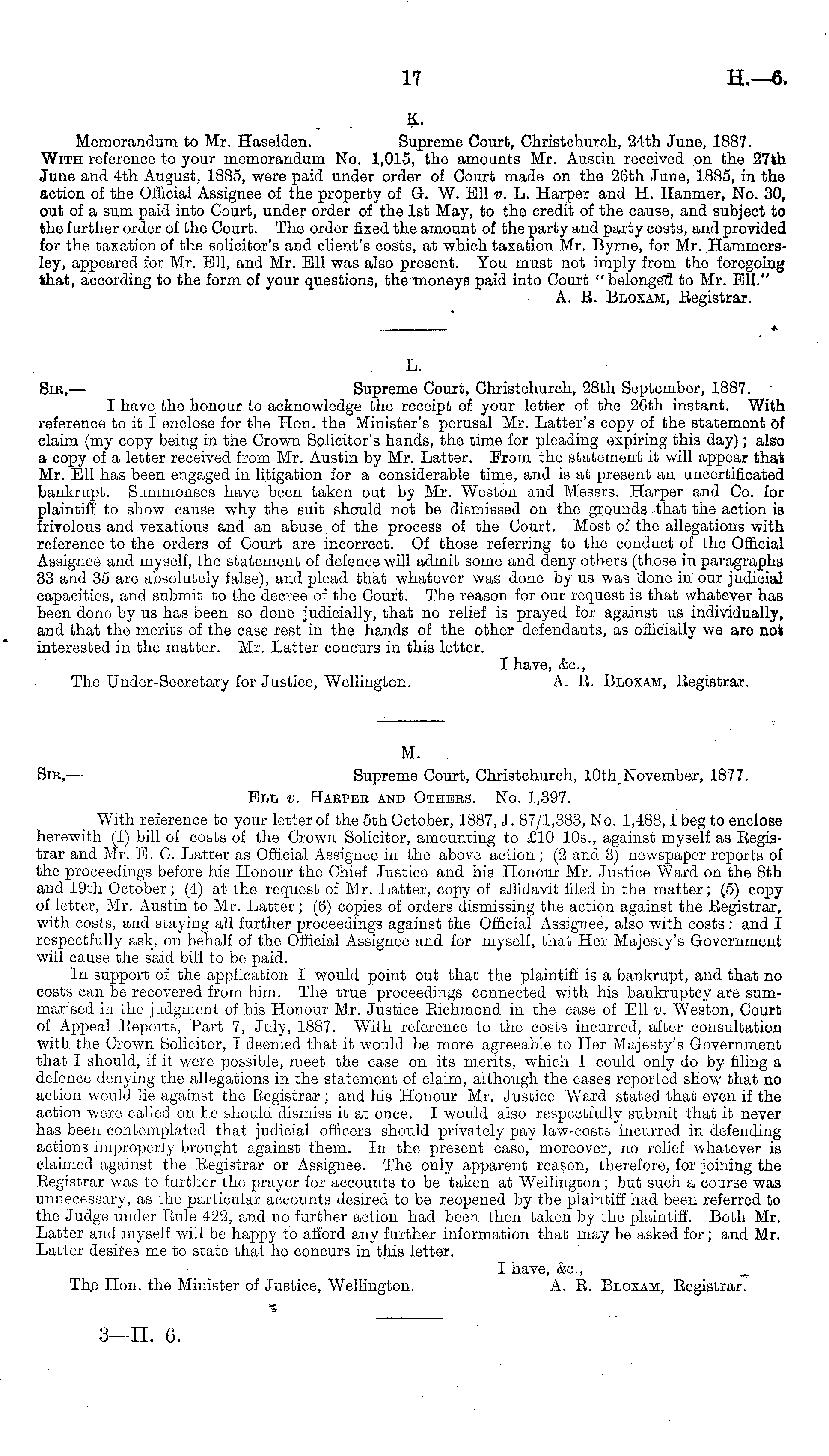 K. Memorandum to Mr. Haselden. Supreme Court, Christchurch, 24th June, 1887. With reference to your memorandum No. 1,015, the amounts Mr. Austin received on the 27th June and 4th August, 1885, were paid under order of Court made on the 26th June, 1885, in the action of the Official Assignee of the property of G. W. Ell v. L. Harper and H. Hanmer, No. 30, out of a sum paid into Court, under order of the Ist May, to the credit of the cause, and subject to the further order of the Court. The order fixed the amount of the party and party costs, and provided for the taxation of the solicitor's and client's costs, at which taxation Mr. Byrne, for Mr. Hammersley, appeared for Air. Ell, and Air. Ell was also present. You must not imply from the foregoing that, according to the form of your questions, the moneys paid into Court " belonged to Mr. Ell." A. R. Bloxam, Registrar. ♦