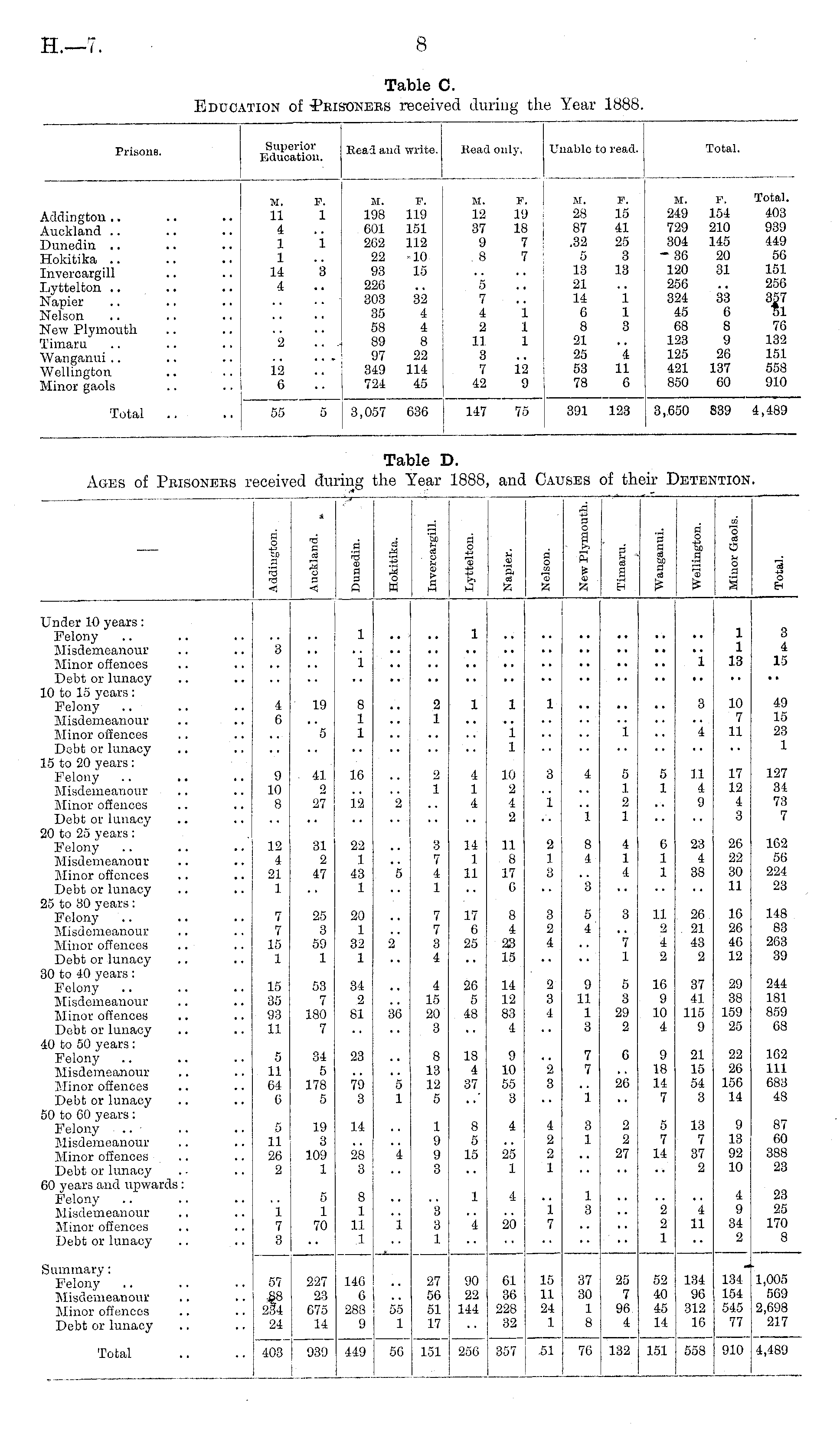 Prisons. Superior Education. Read and write. Read only. Unable to read. Total. riddington .. Auckland .. Dunedin .. Hokitika .. invercargill Liyttelton .. Sfapior kelson Slew Plymouth limaru Wanganui .. Wellington Minor gaols M. 11 4 1 1 14 4 E. 1 i M. 198 601 262 22 93 226 303 35 58 89 97 349 724 F. 119 151 112 10 15 32 4 4 8 22 114 45 M. 12 37 9 8 5 7 4 2 11 3 7 42 F. 19 18 7 7 1 1 1 12 9 M. P. 28 15 87 41 .32 25 5 3 13 13 21 14 1 6 1 8 3 21 25 4 53 11 78 6 31. 249 729 304 - 36 120 256 324 45 68 123 125 421 850 E. Total. 154 403 210 939 145 449 20 56 31 151 256 33 357 6 51 8 76 9 132 26 151 137 558 60 910 _ 12 6 Total 55 5 3,057 636 147 75 891 123 3,650 839 4,489