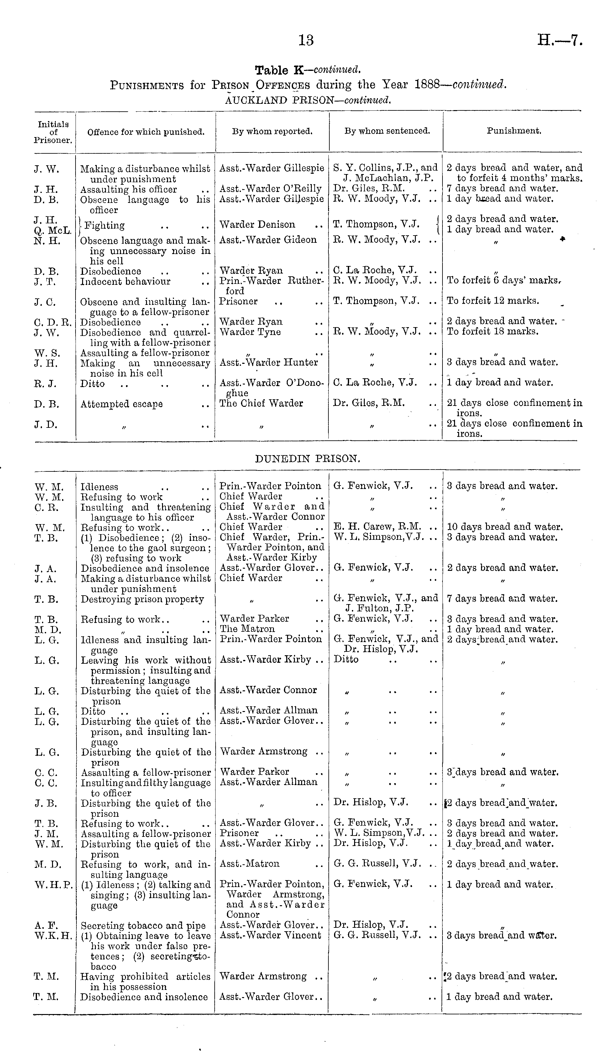 [ — continue Initials of Prisoner. Offence for which punished. By whom reported. By whom sentenced. Punishment. J. W. J. H. D. B. Making a disturbance whilst under punishment Assaulting his officer Obscene language to his officer Asst.-Wardor Gillespie Asst.-Warder O'Reilly Asst.-Warder Gillespie S. Y. Collins, J.P., and J. McLachlan, J.P. Dr. Giles, R.M. R. W. Moody, V.J. .. 2 days bread and water, and to forfeit 4 months' marks. 7 days bread and water. 1 day bxead and water. J. H. Q. McL. N. H. I Fighting Obscene language and making unnecessary noise in his cell Disobedience Indecent behaviour Warder Denison Asst.-Warder Gideon T. Thompson, V.J. j R. W. Moody, V.J. .. 2 days bread and water. 1 day bread and water. ♦ D. B. J. T. Warder Ryan Prin.-Warder Rutherford Prisoner C. La Roche, V.J. .. R. W. Moody, V.J. .. To forfeit 6 days' marks. J. C. Obscene and insulting language to a fellow-prisoner Disobedience Disobedience and quarrelling with a fellow-prisoner Assaulting a fellow-prisoner Making an unnecessary noise in his cell Ditto T. Thompson, V.J. .. To forfeit 12 marks. C. D. R. J. W. Warder Ryan Warder Tyne R. W. Moody, V.J. '.'. 2 days bread and water. To forfeit 18 marks. W. S. J. H. Asst.-Warder Hunter 3 days bread and water. R. J. Asst.-Warder O'Donoghue The Chief Warder C. La Roche, V.J. .. 1 day bread and water. D. B. Attempted escape Dr. Giles, R.M. 21 days close confinement in irons. 21 days close confinement in irons. J. D. DUNEDIN P: ISON. W. M. W. M. C. R. Idleness Refusing to work Insulting and threatening language to his officer Refusing to work (1) Disobedience; (2) insolence to the gaol surgeon; (3) refusing to work Disobedience and insolence Making a disturbance whilst under punishment Destroying prison property Prin.-Warder Pointon Chief Warder Chief Warder and Asst.-Warder Connor Chief Warder Chief Warder, Prin.Warder Pointon, and Asst.-Warder Kirby Asst.-Warder Glover.. Chief Warder G. Fenwick, V.J. 3 days bread and water. W. M. T. B. B. H. Carew, E.M. .. W. L. Simpson.V J. .. 10 days bread and water. 3 days bread and water. J. A. J. A. G. Fenwick, V.J. ! 2 days bread and water. i T. B. G. Fenwick, V.J., and J. Fulton, J.P. G. Fenwick, V.J. 7 days bread and water. T. B. M. D. L. G. Refusing to work.. Idleness and insulting language Leaving his work without permission; insulting and threatening language Disturbing the quiet of the prison Ditto Disturbing tlie quiet of the prison, and insulting language Disturbing the quiet of the prison Assaulting a fellow-prisoner Insulting and filthy language to officer Disturbing the quiet of the prison Refusing to work.. Assaulting a fellow-prisoner Disturbing the quiet of the prison Refusing to work, and insulting language (1) Idleness ; (2) talking and singing; (3) insulting language Warder Parker The Matron Prin.-Warder Pointon G. Fenwick, V.J., and Dr. Hislop, V.J. Ditto 3 clays bread and water. 1 day bread and water. I 2 days_bread_and water. L, G. Asst.-Warder Kirby .. L. G. Asst.-Warder Connor L. G. L. G. Asst.-Warder Allman Asst.-Wardor Glover.. L. G. Warder Armstrong .. C. C. C. C. Warder Parker Asst.-Warder Allman 3~days bread and water. J. B. Dr. Hislop, V.J. P da}'S bread^and water, T. B. J. M. W. M. Asst.-Warder Glover.. Prisoner Asst.-Warder Kirby .. G. Fenwick, V.J. W. L. Simpson,V.J. .. Dr. Hislop, V.J. 3 days bread and water. 2 days bread and water. 1 day bread and water. M. D. Asst.-Matron G. G. Russell, V.J. .. 2 days bread and water. W.H.P. Prin.-Warder Pointon, Warder Armstrong, and Asst.-Warder Connor Asst.-Warder Glover.. Asst.-Warder Vincent G. Fenwick, V.J. .. 1 day bread and water. A. F. W.K.H. Secreting tobacco and pipe (1) Obtaining leave to leave his work under false pretences ; (2) secreting-sto-bacco Having prohibited articles in his possession Disobedience and insolence Dr. Hislop, V.J. G. G. Russell, V.J. .. 3 days breadand water. T. M. Warder Armstrong .. *2 days bread and water. T. M. Asst.-Warder Glover.. 1 day bread and water.