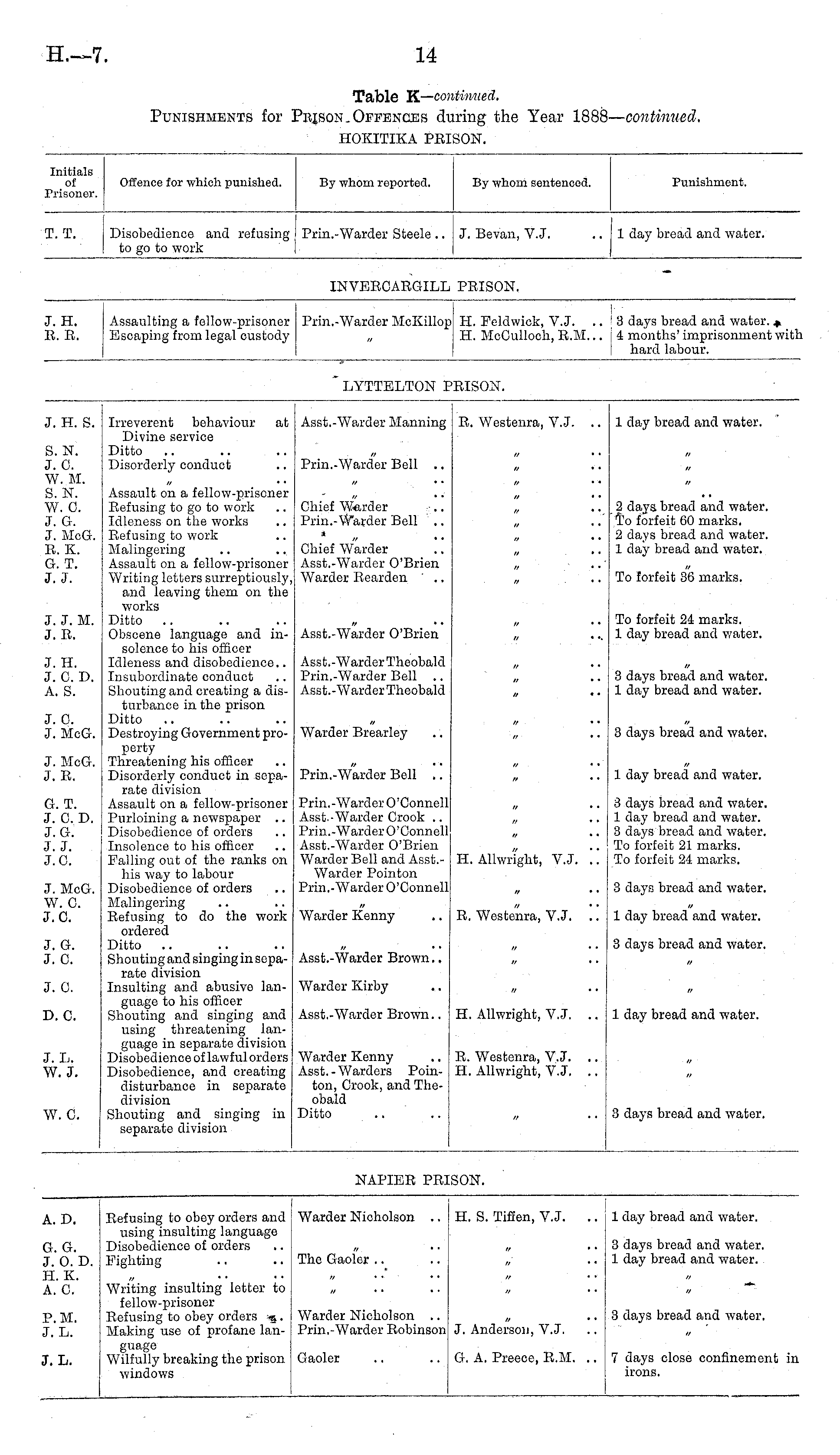 Table K— continued. Punishments for Prison Offences during the Year 1888— continued. HOKITIKA PRISON.