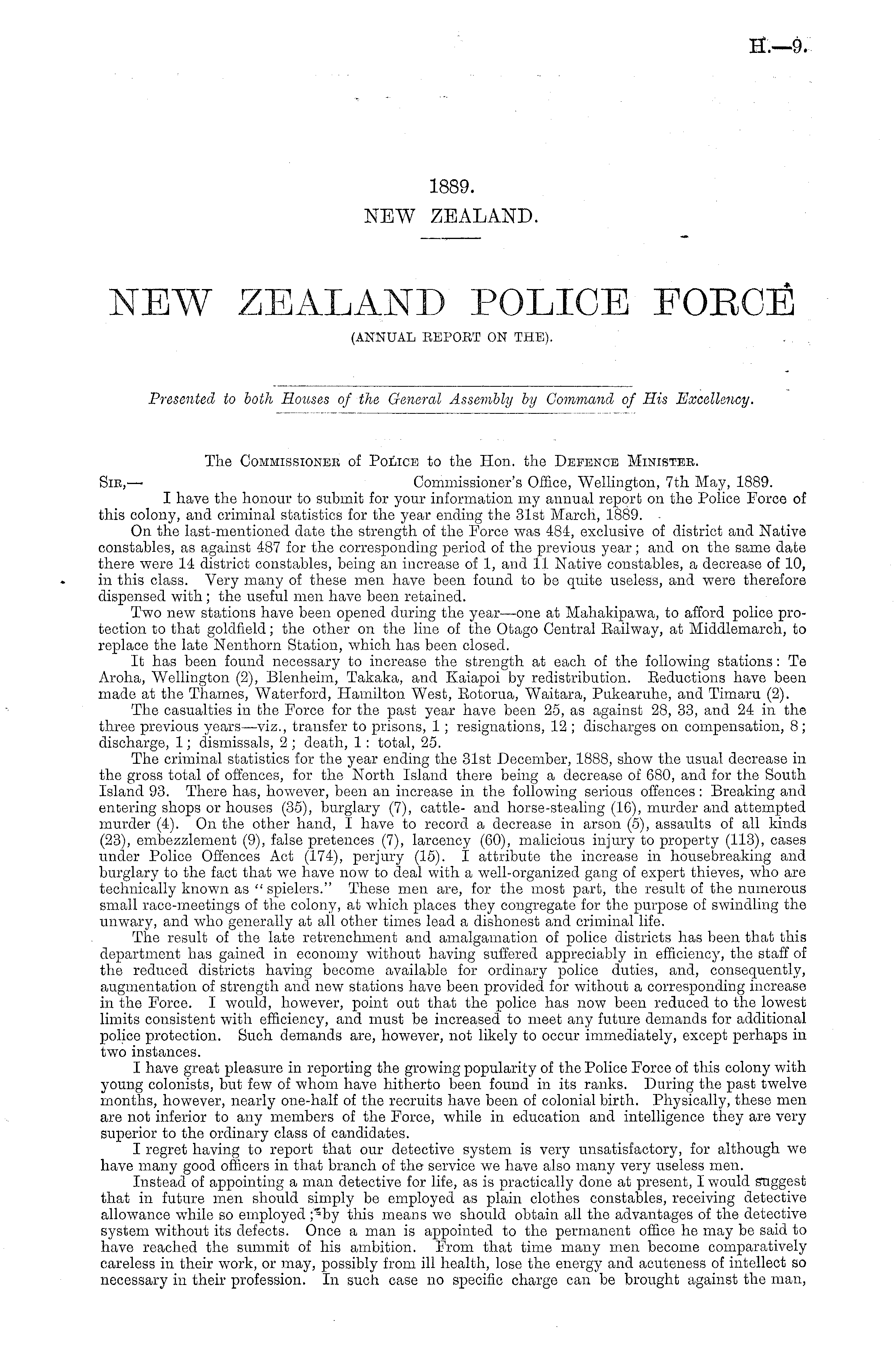 The Commissioner of Police to the Hon. the Defence Minister. Sir, — Commissioner's Office, Wellington, 7th May, 1889. I have the honour to submit for your information my annual report on the Police Force of this colony, and criminal statistics for the year ending the 31st March, 1889. On. the last-mentioned date the strength of the Force was 484, exclusive of district and Native constables, as against 487 for the corresponding period of the previous year; and on the same date there were 14 district constables, being an increase of 1, and 11 Native constables, a decrease of 10, in this class. Very many of these men have been found to be quite useless, and were therefore dispensed with; the useful men have been retained. Two new stations have been opened during the year—one at Mahakipawa, to afford police protection to that goldfield; the other on the line of the Otago Central Railway, at Middlemarch, to replace the late Nenthorn Station, which has been closed. It has been found necessary to increase the strength at each of the following stations: Te Aroha, Wellington (2), Blenheim, Takaka, and Kaiapoi by redistribution. Reductions have been made at the Thames, Waterford, Hamilton West, Rotorua, Waitara, Pukearuhe, and Timaru (2). The casualties in the Force for the past year have been 25, as against 28, 33, and 24 in the three previous years—viz., transfer to prisons, 1 ; resignations, 12 ; discharges on compensation, 8; discharge, 1; dismissals, 2 ; death, 1: total, 25. The criminal statistics for the year ending the 31st December, 1888, show the usual decrease in the gross total of offences, for the North Island there being a decrease of 680, and for the South Island 93. There has, however, been an increase in the following serious offences : Breaking and entering shops or houses (35), burglary (7), cattle- and horse-stealing (16), murder and attempted murder (4). On the other hand, I have to record a decrease in arson (5), assaults of all kinds (23), embezzlement (9), false pretences (7), larcency (60), malicious injury to property (113), cases under Police Offences Act (174), perjury (15). I attribute the increase in housebreaking and burglary to the fact that we have now to deal with a well-organized gang of expert thieves, who are technically known as " spielers." These men are, for the most part, the result of the numerous small race-meetings of the colony, at which places they congregate for the purpose of swindling the unwary, and who generally at all other times lead a dishonest and criminal life. The result of the late retrenchment and amalgamation of police districts has been that this department has gained in economy without having suffered appreciably in efficiency, the staff of the reduced districts having become available for ordinary police duties, and, consequently, augmentation of strength and new stations have been provided for without a corresponding increase in the Force. I would, however, point out that the police has now been reduced to the lowest limits consistent with efficiency, and must be increased to meet any future demands for additional police protection. Such demands are, however, not likely to occur immediately, except perhaps in two instances. I have great pleasure in reporting the growing popularity of the Police Force of this colony with young colonists, but few of whom have hitherto been found in its ranks. During the past twelve months, however, nearly one-half of the recruits have been of colonial birth. Physically, these men are not inferior to any members of the Force, while in education and intelligence they are very superior to the ordinary class of candidates. I regret having to report that our detective system is very unsatisfactory, for although we have many good officers in that branch of the service we have also many very useless men. Instead of appointing a man detective for life, as is practically done at present, I would suggest that in future men should simply be employed as plain clothes constables, receiving detective allowance while so employed ;^by this means we should obtain all the advantages of the detective system without its defects. Once a man is appointed to the permanent office he may be said to have reached the summit of his ambition. From that time many men become comparatively careless in their work, or may, possibly from ill health, lose the energy and acuteness of intellect so necessary in their profession. In such case no specific charge can be brought against the man,