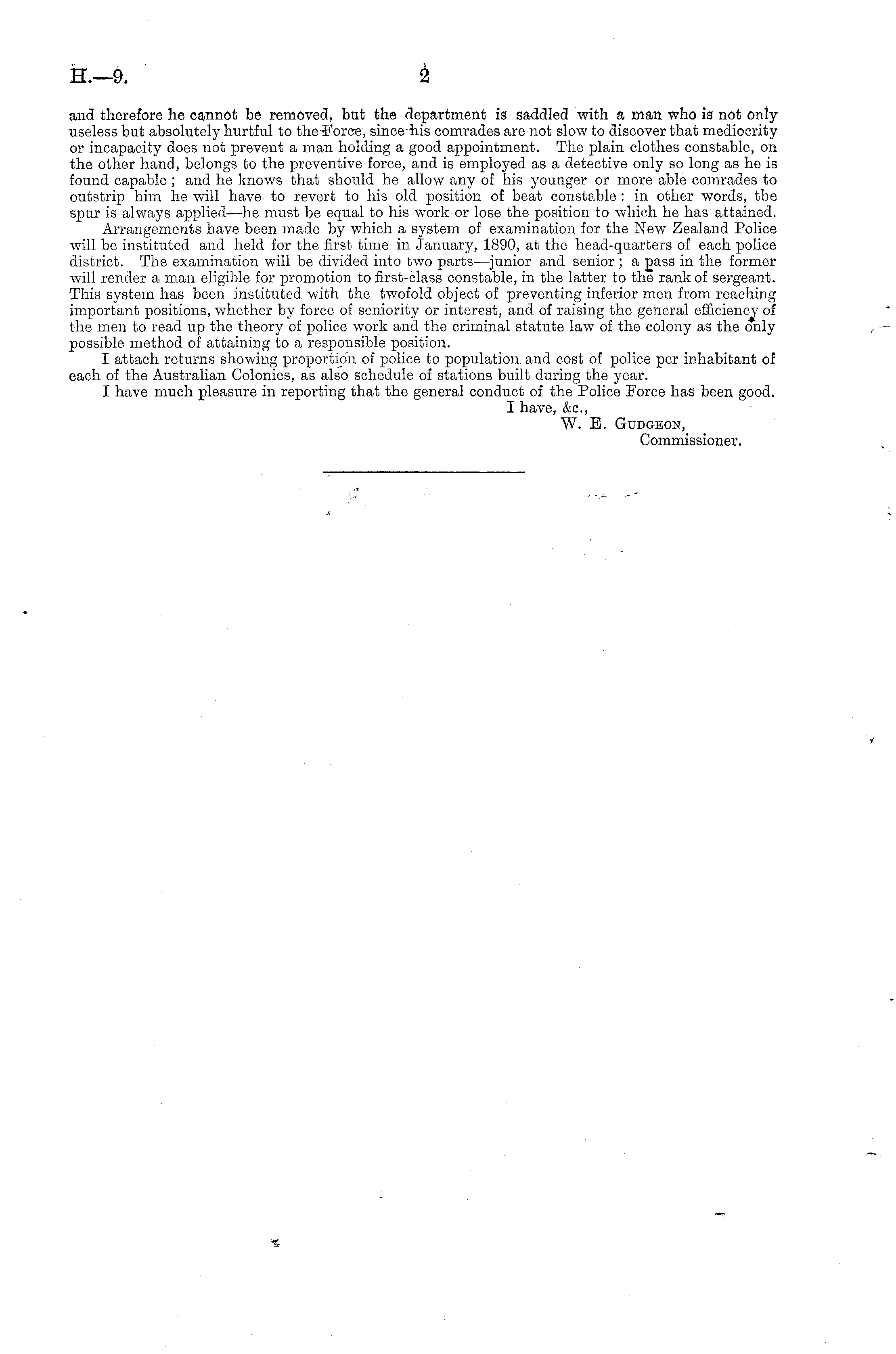 and therefore he cannot be removed, but the department is saddled with a man who is not only useless but absolutely hurtful to the -Force, since his comrades are not slow to discover that mediocrity or incapacity does not prevent a man holding a good appointment. The plain clothes constable, on the other hand, belongs to the preventive force, and is employed as a detective only so long as he is found capable ; and he knows that should he allow any of his younger or more able comrades to outstrip him he will have to revert to his old position of beat constable : in other words, the spur is always applied —he must be equal to his work or lose the position to which he has attained. Arrangements have been made by which a system of examination for the New Zealand Police will be instituted and held for the first time in January, 1890, at the head-quarters of each police district. The examination will be divided into two parts—junior and senior ; a gass in the former will render a man eligible for promotion to first-class constable, in the latter to the rank of sergeant. This system has been instituted with the twofold object of preventing inferior men from reaching important positions, whether by force of seniority or interest, and of raising the general efficiency of the men to read up the theory of police work and the criminal statute law of the colony as the only possible method of attaining to a responsible position. I attach returns showing proportion of police to population and cost of police per inhabitant of each of the Australian Colonies, as also schedule of stations built during the year. I have much pleasure in reporting that the general conduct of the Police Force has been good. I have, &c, W. E. Gudgeon, Commissioner.