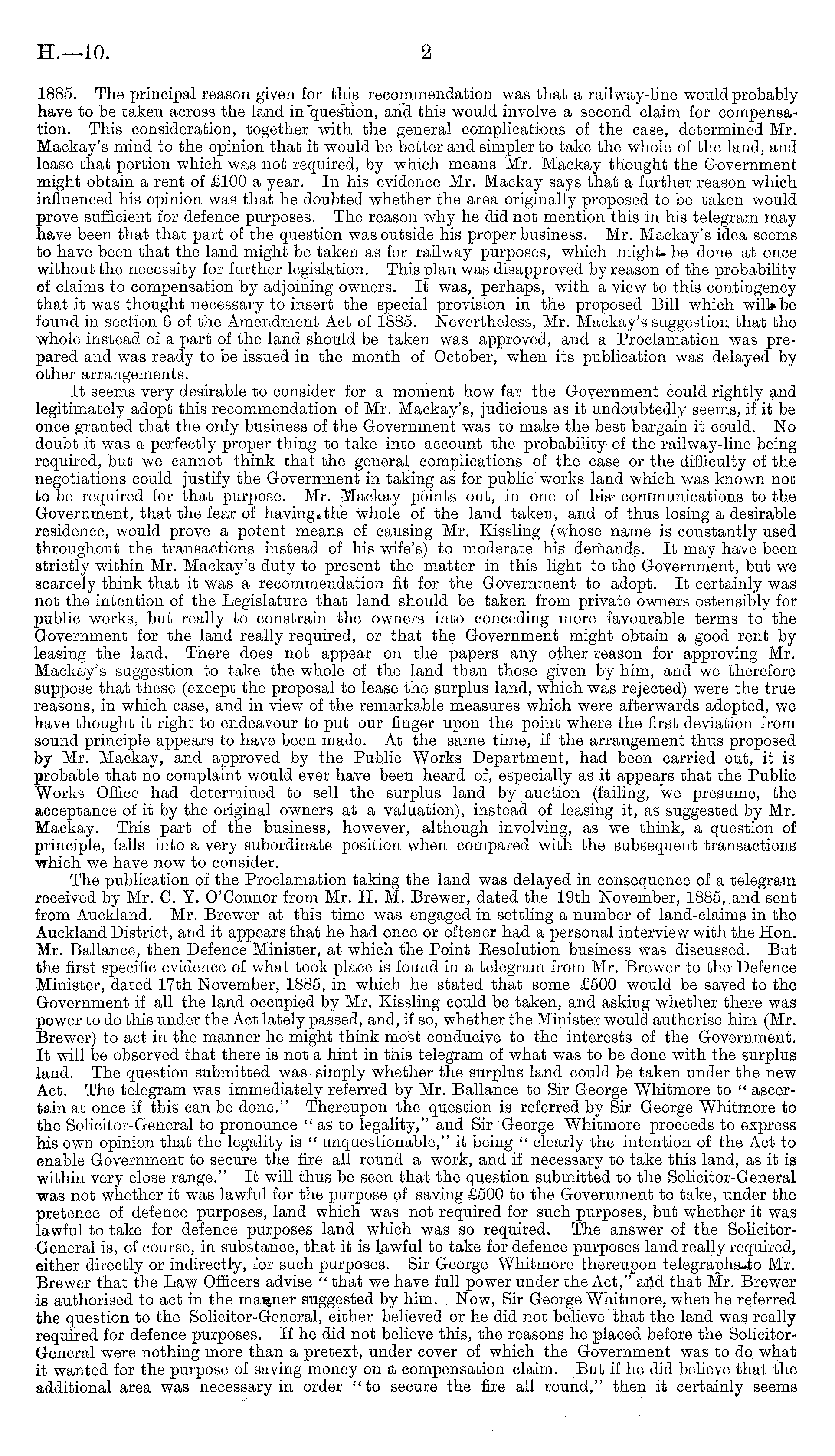 1885. The principal reason given for this recommendation was that a railway-line would probably have to be taken across the land in "question, ancl this would involve a second claim for compensation. This consideration, together with the general complications of the case, determined Mr. Mackay's mind to the opinion that it would be better and simpler to take the whole of the land, and lease that portion which was not required, by which means Mr. Mackay thought the Government might obtain a rent of £100 a year. In his evidence Mr. Mackay says that a further reason which influenced his opinion was that he doubted whether the area originally proposed to be taken would prove sufficient for defence purposes. The reason why he did not mention this in his telegram may have been that that part of the question was outside his proper business. Mr. Mackay's idea seems to have been that the land might be taken as for railway purposes, which might- be done at once without the necessity for further legislation. This plan was disapproved by reason of the probability of claims to compensation by adjoining owners. It was, perhaps, with a view to this contingency that it was thought necessary to insert the special provision in the proposed Bill which will* be found in section 6of the Amendment Act of 1885. Nevertheless, Mr. Mackay's suggestion that the whole instead of a part of the land should be taken was approved, and a Proclamation was prepared and was ready to be issued in the month of October, when its publication was delayed by other arrangements. It seems very desirable to consider for a moment how far the Government could rightly and legitimately adopt this recommendation of Mr. Mackay's, judicious as it undoubtedly seems, if it be once granted that the only business of the Government was to make the best bargain it could. No doubt it was a perfectly proper thing to take into account the probability of the railway-line being required, but we cannot think chat the general complications of the case or the difficulty of the negotiations could justify the Government in taking as for public works land which was known not to be required for that purpose. Mr. Mackay points out, in one of his* communications to the Government, that the fear of having,the whole of the land taken, and of thus losing a desirable residence, would prove a potent means of causing Mr. Kissling (whose name is constantly used throughout the transactions instead of his wife's) to moderate his demands. It may have been strictly within Mr. Mackay's duty to present the matter in this light to the Government, but we scarcely think that it was a recommendation fit for the Government to adopt. It certainly was not the intention of the Legislature that land should be taken from private owners ostensibly for public works, but really to constrain the owners into conceding more favourable terms to the Government for the land really required, or that the Government might obtain a good rent by leasing the land. There does not appear on the papers any other reason for approving Mr. Mackay's suggestion to take the whole of the land than those given by him, and we therefore suppose that these (except the proposal to lease the surplus land, which was rejected) were the true reasons, in which case, and in view of the remarkable measures which were afterwards adopted, we have thought it right to endeavour to put our finger upon the point where the first deviation from sound principle appears to have been made. At the same time, if the arrangement thus proposed by Mr. Mackay, and approved by the Public Works Department, had been carried out, it is probable that no complaint would ever have been heard of, especially as it appears that the Public Works Office had determined to sell the surplus land by auction (failing, we presume, the acceptance of it by the original owners at a valuation), instead of leasing it, as suggested by Mr. Mackay. This part of the business, however, although involving, as we think, a question of principle, falls into a very subordinate position when compared with the subsequent transactions which we have now to consider. The publication of the Proclamation taking the land was delayed in consequence of a telegram received by Mr. C. T. O'Connor from Mr. H. M. Brewer, dated the 19th November, 1885, and sent from Auckland. Mr. Brewer at this time was engaged in settling a number of land-claims in the Auckland District, and it appears that he had once or oftener had a personal interview with the Hon. Mr. Ballance, then Defence Minister, at which the Point Eesolution business was discussed. But the first specific evidence of what took place is found in a telegram from Mr. Brewer to the Defence Minister, dated 17th November, 1885, in which he stated that some £500 would be saved to the Government if all the land occupied by Mr. Kissling could be taken, and asking whether there was power to do this under the Act lately passed, and, if so, whether the Minister would authorise him (Mr. Brewer) to act in the manner he might think most conducive to the interests of the Government. It w Till be observed that there is not a hint in this telegram of what was to be done with the surplus land. The question submitted was simply whether the surplus land could be taken under the new Act. The telegram was immediately referred by Mr. Ballance to Sir George Whitmore to " ascertain at once if this can be done." Thereupon the question is referred by Sir George Whitmore to the Solicitor-General to pronounce "as to legality," and Sir George Whitmore proceeds to express his own opinion that the legality is " unquestionable," it being " clearly the intention of the Act to enable Government to secure the fire all round a work, and if necessary to take this land, as it is within very close range." It will thus be seen that the question submitted to the Solicitor-General was not whether it was lawful for the purpose of saving £500 to the Government to t