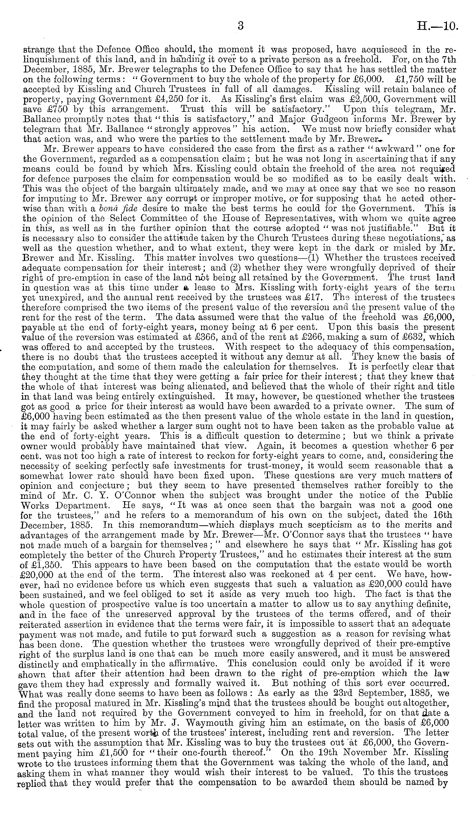 strange that the Defence Office should, the moment it was proposed, have acquiesced in the relinquishment of this land, and in handing it over to a private person as a freehold. For, on the 7th December, 1885, Mr. Brewer telegraphs to the Defence Office to say that he has settled the matter on the following terms : " Government to buy the whole of the property for £6,000. £1,750 will be accepted by Kissling and Church Trustees in full of all damages. Kissling will retain balance of property, paying Government £4,250 for it. As Kissling's first claim was £2,500, Government will save £750 by this arrangement. Trust this will be satisfactory." Upon this telegram, Mr. Ballance promptly notes that " this is satisfactory," and Major Gudgeon informs Mr. Brewer by telegram that Mr. Ballance "strongly approves" his action. We must now briefly consider what that action was, and who were the parties to the settlement made by Mr. BrewerMr. Brewer appears to have considered the case from the first as a rather " awkward " one for the Government, regarded as a compensation claim; but he was not long in ascertaining that if any means could be found by which Mrs. Kissling could obtain the freehold of the area not requited for defence purposes the claim for compensation would be so modified as to be easily dealt with. This was the object of the bargain ultimately made, and we may at once say that we see no reason for imputing to Mr. Brewer any corrupt or improper motive, or for supposing that he acted otherwise than with a bond fide desire to make the best terms he could for the Government. This is the opinion of the Select Committee of the House of Eepresentatives, with whom we quite agree in this, as w rell as in the further opinion that the course adopted " was not justifiable." But it is necessary also to consider the attitude taken by the Church Trustees during these negotiations," as well as the question whether, and to what extent, they were kept in the dark or misled by Mr. Brewer and Mr. Kissling. This matter involves two questions—(l) Whether the trustees received adequate compensation for their interest; and (2) whether they were wrongfully deprived of their right of pre-emption in case of the land not being all retained by the Government. The trust land in question was at this time under a lease to Mrs. Kissling with forty-eight years of the term yet unexpired, and the annual rent received by the trustees was £17. Tho interest of the trustees therefore comprised the two items of the present value of the reversion and the present value of tho rent for the rest of the term. The data assumed were that the value of the freehold was £6,000, payable at the end of forty-eight years, money being at 6 per cent. Upon this basis the present value of the reversion was estimated at £366, and of the rent at £266, making a sum of £632, which was offered to and accepted by the trustees. With respect to the adequacy of this compensation, there is no doubt that the trustees accepted it without any demur at all. They knew the basis of the computation, and some of them made the calculation for themselves. It is perfectly clear that they thought at the time that they were getting a fair price for their interest; that they knew that the whole of that interest was being alienated, and believed that the whole of their right and title in that land was being entirely extinguished. It may, however, be questioned whether the trustees got as good a price for their interest as would have been awarded to a private owner. The sum of £6,000 having been estimated as the then present value of the whole estate in the land in question, it may fairly be asked whether a larger sum ought not to have been taken as the probable value at the end of forty-eight years. This is a difficult question to determine ; but we think a private owner would probably have maintained that view. Again, it becomes a question whether 6 per cent, was not too high a rate of interest to reckon for forty-eight years to come, and, considering the necessity of seeking perfectly safe investments for trust-money, it would seem reasonable that a somewhat lower rate should have been fixed upon. These questions are very much matters of opinion and conjecture ; but they seem to have presented themselves rather forcibly to the mind of Mr. C. Y. O'Connor when the subject was brought under the notice of the Public Works Department. He says, "It was at once seen that the bargain was not a good one for the trustees," and he refers to a memorandum of his own on the subject, dated the 16th December, 1885. In this memorandum —which displays much scepticism as to the merits and advantages of the arrangement made by Mr. Brewer —Mr. O'Connor says that the trustees " have not made much of a bargain for themselves ; " and elsewhere he says that " Mr. Kissling has got completely the better of the Church Property Trustees," and he estimates their interest at the sum of £1,350. This appears to have been based on the computation that the estate would be worth £20,000 at the end of the term. The interest also was reckoned at 4 per cent. We have, however, had no evidence before us which even suggests that such a valuation as £20,000 could have been sustained, and we feel obliged to set it aside as very much too high. The fact is that the whole question of prospective value is too uncertain a matter to allow us to say anything definite, and in the face of the unreserved approval by the trustees of the terms offered, and of their reiterated assertion in evidence that the terms were fair, it is impossible to assert that an adequate payment was not made, and futile to put forward such a suggestion as a reason for revising what has been done. The question whether the trustees were wrongfully deprived of their pre-emptive right of the surplus land is one that can be much more easily answered, and it must be answered distinctly and emphatically in the affirmative. This c