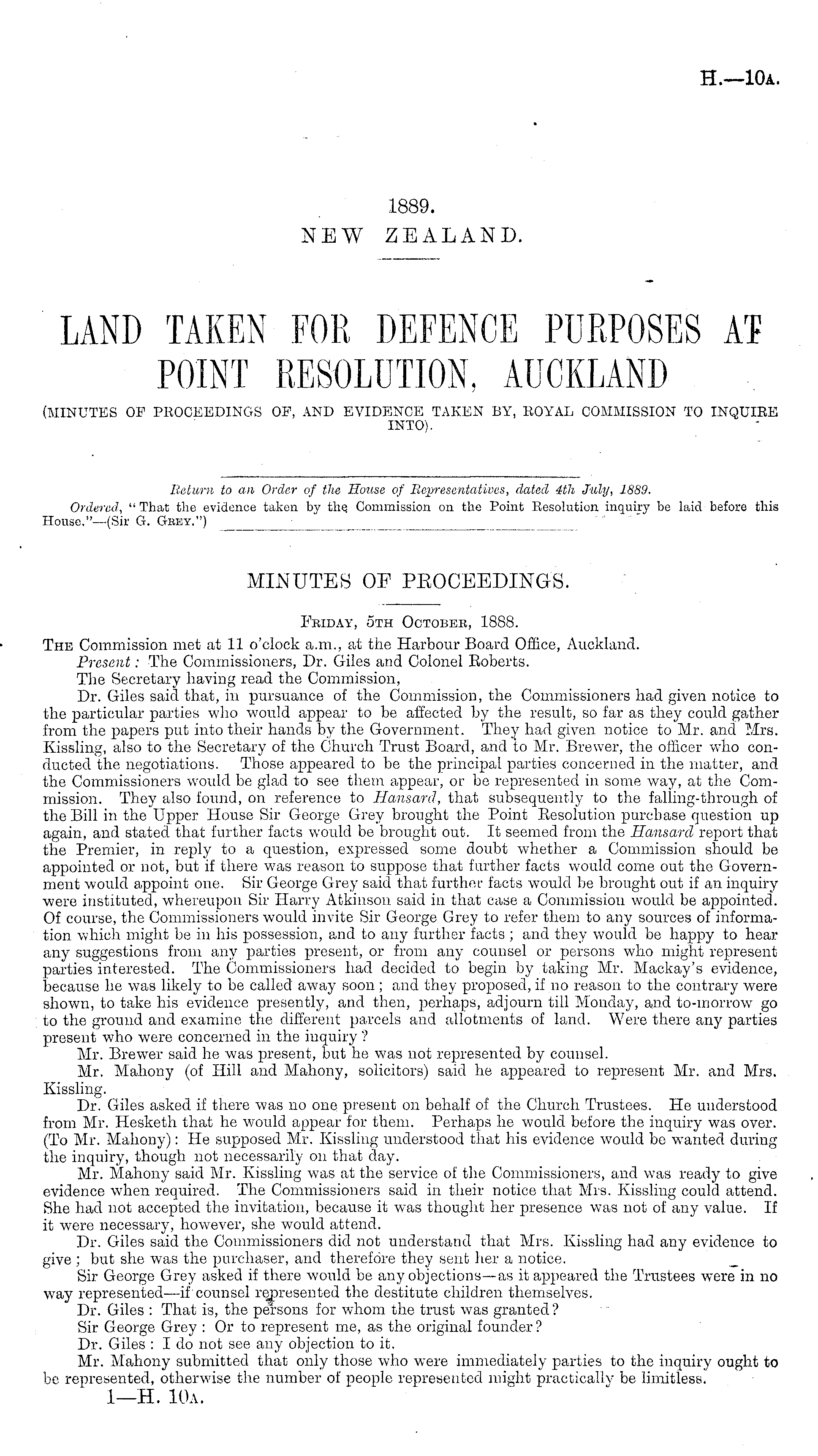 MINUTES OF PEOCEEDINGS. Friday, sth October, 1888. The Commission met at 11 o'clock a.m., at the Harbour Board Office, Auckland. Present: The Commissioners, Dr. Giles and Colonel Roberts. The Secretary having read the Commission, Dr. Giles said that, in pursuance of the Commission, the Commissioners had given notice to the particular parties who would appear to be affected by the result, so far as they could gather from the papers put into their hands by the Government. They had given notice to Mr. and Mrs. Kissling, also to the Secretary of the Church Trust Board, and to Mr. Brewer, the officer who conducted the negotiations. Those appeared to be the principal parties concerned in the matter, and the Commissioners would be glad to see them appear, or be represented in some way, at the Commission. They also found, on reference to Hansard, that subsequently to the falling-through of the Bill in the Upper House Sir George Grey brought the Point Resolution purchase question up again, and stated that further facts would be brought out. It seemed from the Hansard report that the Premier, in reply to a question, expressed some doubt whether a Commission should be appointed or not, but if there was reason to suppose that further facts would come out the Government would appoint one. Sir George Grey said that further facts would be brought out if an inquiry were instituted, whereupon Sir Harry Atkinson said in that case a Commission would be appointed. Of course, the Commissioners would invite Sir George Grey to refer them to any sources of information which might be in his possession, and to any further facts ; and they would be happy to hear any suggestions from any parties present, or from any counsel or persons who might represent parties interested. The Commissioners had decided to begin by taking Mr. Mackay's evidence, because he was likely to be called away soon; and they proposed, if no reason to the contrary were shown, to take his evidence presently, and then, perhaps, adjourn till Monday, and to-morrow go to the ground and examine the different parcels and allotments of land. Were there any parties present who were concerned in the inquiry ? Mr. Brewer said he was present, but he was not represented by counsel. Mr. Mahony (of Hill and Mahony, solicitors) said he appeared to represent Mr. and Mrs. Kissling. Dr. Giles asked if there was no one present on behalf of the Church Trustees. He understood from Mr. Hesketh that he would appear for them. Perhaps he would before the inquiry was over. (To Mr. Mahony): He supposed Mr. Kissling understood that his evidence would be wanted during the inquiry, though not necessarily on that day. Mr. Mahony said Mr. Kissling was at the service of the Commissioners, and was ready to give evidence when required. The Commissioners said in their notice that Mrs. Kissling could attend. She had not accepted the invitation, because it was thought her presence was not of any value. If it were necessary, however, she would attend. Dr. Giles said the Commissioners did not understand that Mrs. Kissling had any evidence to give ; but she was the purchaser, and therefore they sent her a notice. Sir George Grey asked if there would be any objections—as it appeared the Trustees were in no way represented—if counsel represented the destitute children themselves. Dr. Giles : That is, the persons for whom the trust was granted ? Sir George Grey : Or to represent me, as the original founder? Dr. Giles : I do not see any objection to it. Mr. Mahony submitted that only those who were immediately parties to the inquiry ought to be represented, otherwise the number of people represented might practically be limitless. I—H. 10a.