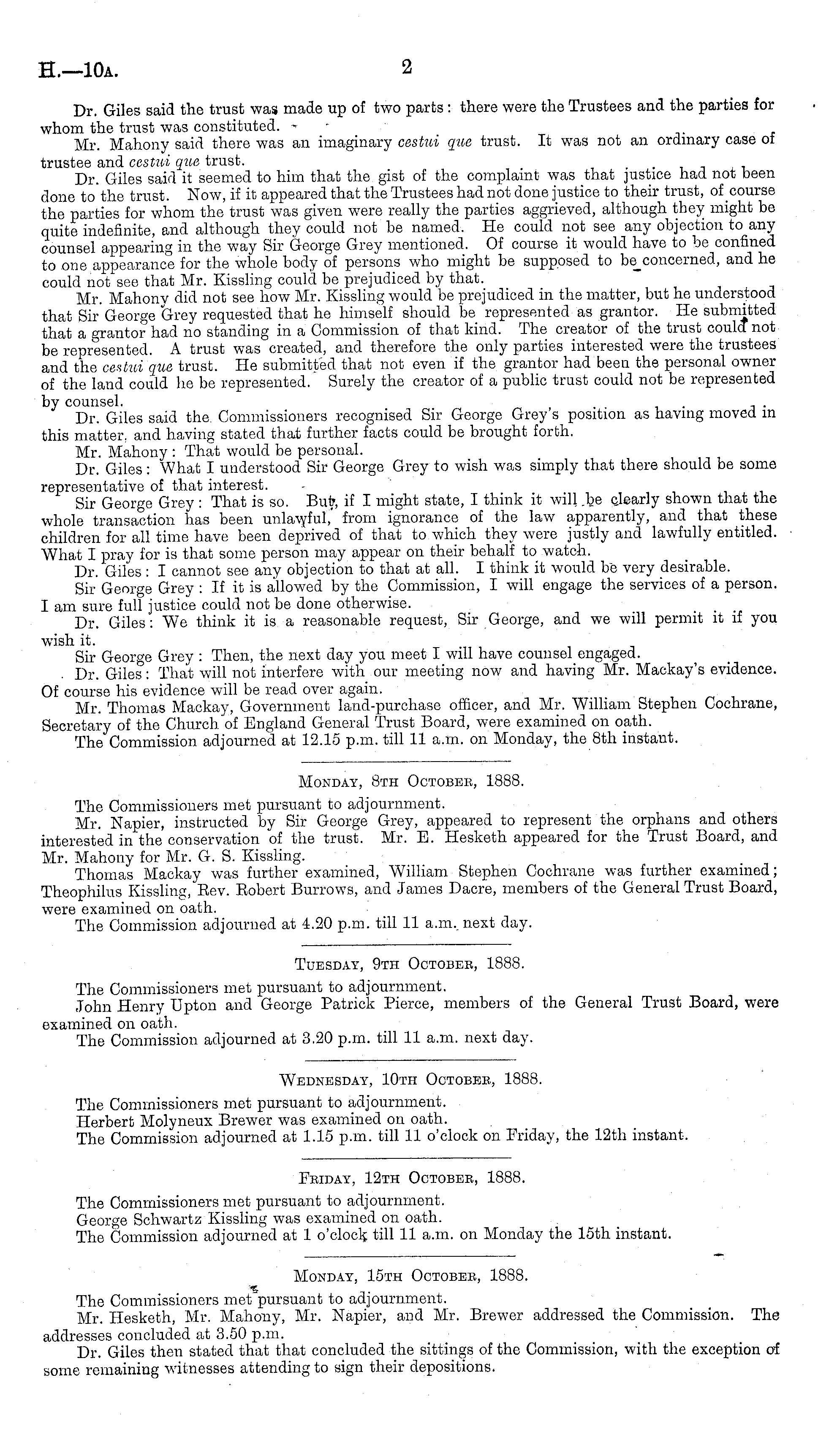 Monday, Bth Octobeb, 1888. The Commissioners met pursuant to adjournment. Mr. Napier, instructed by Sir George Grey, appeared to represent the orphans and others interested in the conservation of the trust. Mr. E. Hesketh appeared for the Trust Board, and Mr. Mahony for Mr. G. S. Kissling. Thomas Mackay was further examined, William Stephen Cochrane was further examined; Theophilus Kissling, Eev. Eobert Burrows, and James Dacre, members of the General Trust Board, were examined on oath. The Commission adjourned at 4.20 p.m. till 11 a.m. next day.