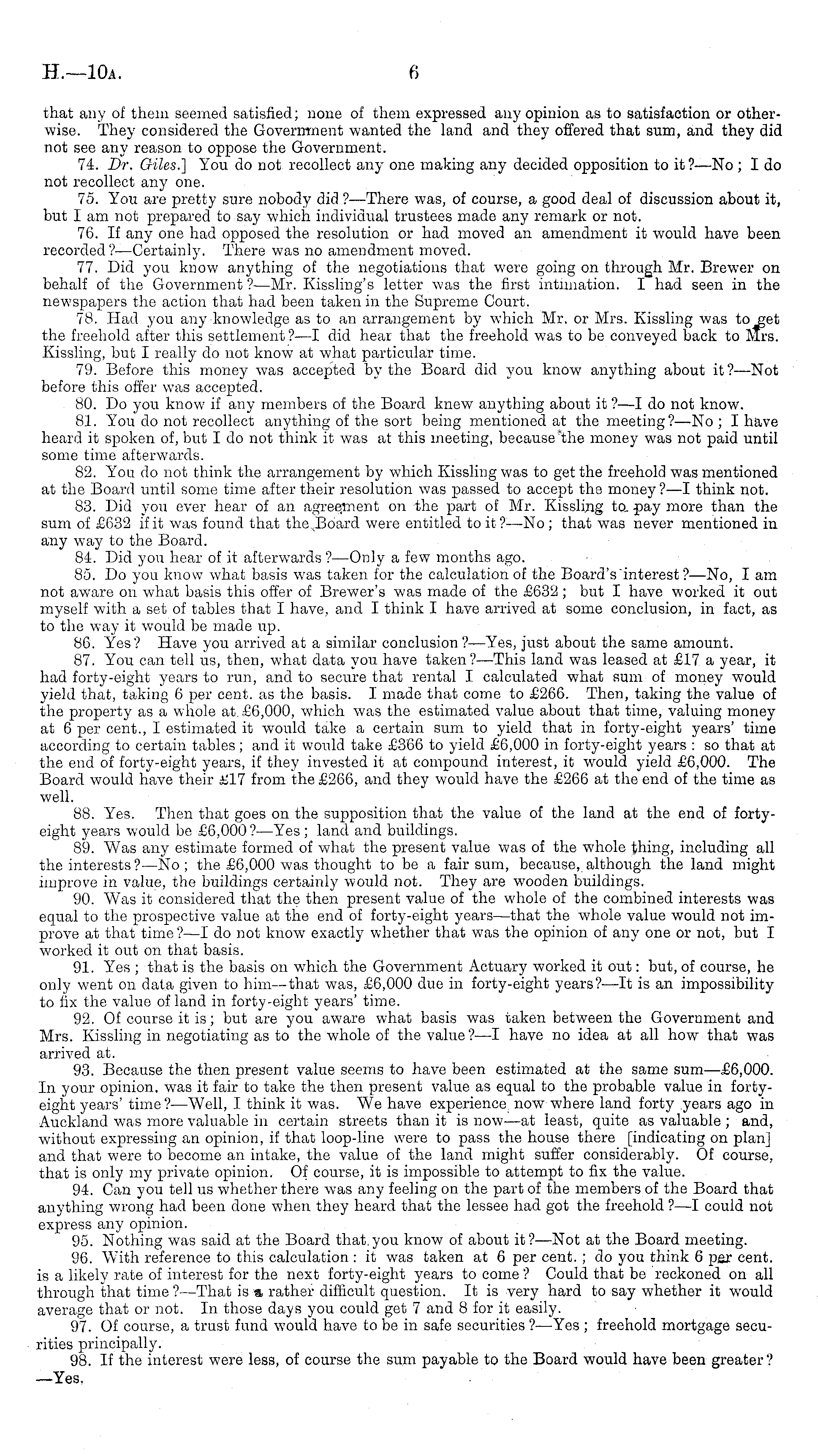 that any of them seemed satisfied; none of them expressed any opinion as to satisfaction or otherwise. They considered the Government wanted the land and they offered that sum, and they did not see any reason to oppose the Government. 74. Dr. Giles.] You do not recollect any one making any decided opposition to it?—No ; I do not recollect any one. 75. You are pretty sure nobody did ?—There was, of course, a good deal of discussion about it, but I am not prepared to say whicla individual trustees made any remark or not. 76. If any one had opposed the resolution or had moved an amendment it would have been recorded ?—Certainly. There was no amendment moved. 77. Did you know anything of the negotiations that were going on through Mr. Brewer on behalf of the Government? —Mr. Kissling's letter was the first intimation. I had seen in the newspapers the action that had been taken in the Supreme Court. 78. Had you any knowledge as to an arrangement by which Mr. or Mrs. Kissling was to set the freehold after this settlement ?—I did hear that the freehold was to be conveyed back to Mrs. Kissling, but I really do not know at what particular time. 79. Before this money was accepted by the Board did you know anything about it? —Not before this offer was accepted. 80. Do you know if any members of the Board knew anything about it ?—I do not know. 81. You do not recollect anything of the sort being mentioned at the meeting?—No ; I have heard it spoken of, but I do not think it was at this meeting, because 'the money was not paid until some time afterwards. 82. You do not think the arrangement by which Kissling was to get the freehold was mentioned at the Board until some time after their resolution was passed to accept the money?—l think not. 83. Did you ever hear of an agreement on the part of Mr. Kissling to. pay more than the sum of £632 if it was found that the,Board were entitled to it ? —No; that was never mentioned in any way to the Board. 84. Did you hear of it afterwards ? —Only a few months ago. 85. Do you know what basis was taken for the calculation of the Board's interest ?—No, I am not aware on what basis this offer of Brewer's was made of the £632 ; but I have worked it out myself with a set of tables that I have, and I think I have arrived at some conclusion, in fact, as to the way it would be made up. 86. Yes? Have you arrived at a similar conclusion ?—Yes, just about the same amount. 87. You can tell us, then, what data you have taken? —This land was leased at £17 a year, it had forty-eight years to run, and to secure that rental I calculated what sum of money would yield that, taking 6 per cent, as the basis. I made that come to £266. Then, taking the value of the property as a whole at. £6,000, which was the estimated value about that time, valuing money at 6 per cent., I estimated it would take a certain sum to yield that in forty-eight years' time according to certain tables; and it would take £366 to yield £6,000 in forty-eight years :so that at the end of forty-eight years, if they invested it at compound interest, it would yield £6,000. The Board would have their £17 from "the £266, and they would have the £266 at the end of the time as well. 88. Yes. Then that goes on the supposition that the value of the land at the end of fortyeight years would be £6,000? —Yes; land and buildings. 89. "Was any estimate formed of what the present value was of the whole thing, including all the interests ? —No ; the £6,000 was thought to be a fair sum, because, although the land might improve in value, the buildings certainly would not. They are wooden buildings. 90. Was it considered that the then present value of the whole of the combined interests was equal to the prospective value at the end of forty-eight years —that the whole value would not improve at that time ? —I do not know exactly whether that was the opinion of any one or not, but I worked it out on that basis. 91. Yes ; that is the basis on which the Government Actuary worked it out: but, of course, he only went on data given to him—that was, £6,000 due in forty-eight years?—lt is an impossibility to fix the value of land in forty-eight years' time. 92. Of course it is; but are you aware what basis was taken between the Government and Mrs. Kissling in negotiating as to the whole of the value ? —I have no idea at all how that was arrived at. 93. Because the then present value seems to have been estimated at the same sum—£6,ooo. In your opinion, was it fair to take the then present value as equal to the probable value in fortyeight years' time?—Well, I think it was. We have experience now where land forty years ago in Auckland was more valuable in certain streets than it is now —at least, quite as valuable ; and, without expressing an opinion, if that loop-line were to pass the house there [indicating on plan] and that were to become an intake, the value of the land might suffer considerably. Of course, that is only my private opinion. Of course, it is impossible to attempt to fix the value. 94. Can you tell us whether there was any feeling on the part of the members of the Board that anything wrong had been done when they heard that the lessee had got the freehold ?—I could not express any opinion. 95. Nothing was said at the Board that you know of about it?—Not at the Board meeting. 96. With reference to this calculation : it was taken at 6 per cent. ; do you think 6 per cent, is a likely rate of interest for the next forty-eight years to come ? Could that be reckoned on all through that time ?—That is a rather difficult question. It is very hard to say whether it would average that or not. In those days you could get 7 and 8 for it easily. 97. Of course, a trust fund would have to be in safe securities ?—Yes ; freehold mortgage securities principally. 98. If the interest were less, of course the sum payable to the Board would have been greater ? —Yes.