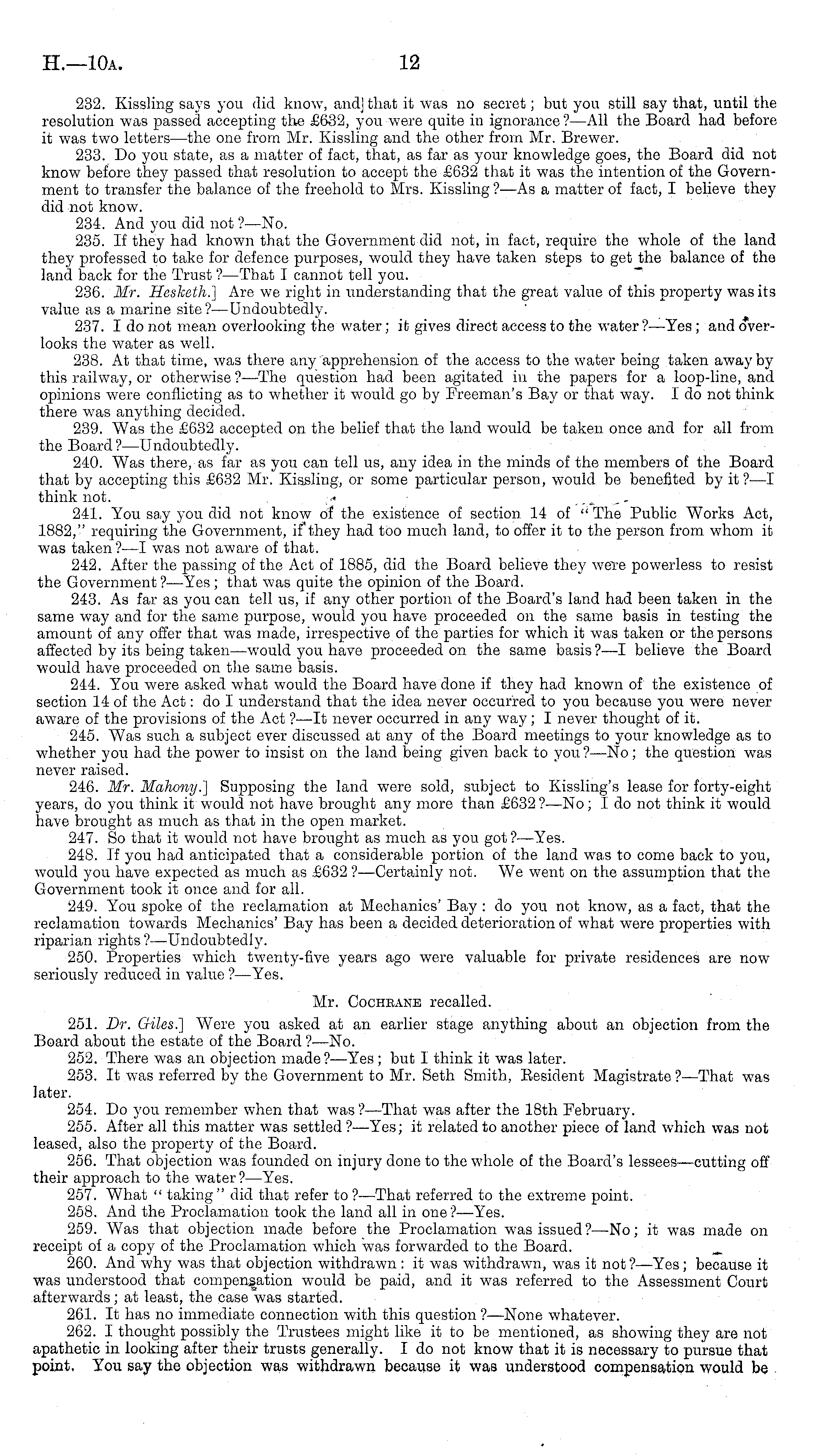 232. Kissling says you did know, and] that it was no secret; but you still say that, until the resolution was passed accepting the £632, you were quite in ignorance ? —All the Board had before it was two letters —the one from Mr. Kissling and the other from Mr. Brewer. 233. Do you state, as a matter of fact, that, as far as your knowledge goes, the Board did not know before they passed that resolution to accept the £632 that it was the intention of the Government to transfer the balance of the freehold to Mrs. Kissling ?—As a matter of fact, I believe they did not know. 234. And you did not'?—No. 235. If they had known that the Government did not, in fact, require the whole of the land they professed to take for defence purposes, would they have taken steps to get the balance of the land back for the Trust ?—That I cannot tell you. 236. Mr. Hesketh.] Are we right in understanding that the great value of this property was its value as a marine site?—Undoubtedly. 237. Ido not mean overlooking the water; it gives direct access to the water ?—Yes; and overlooks the water as well. 238. At that time, was there any apprehension of the access to the water being taken away by this railway, or otherwise ? —The question had been agitated in the papers for a loop-line, and opinions were conflicting as to whether it would go by Freeman's Bay or that way. Ido not think there was anything decided. 239. Was the £632 accepted on the belief that the land would be taken once and for all from the Board?—Undoubtedly. 240. Was there, as far as you can tell us, any idea in the minds of the members of the Board that by accepting this £632 Mr. Kissling, or some particular person, would be benefited by it ? —I think not. 241. You sa.y you did not know of the existence of section 14 of " The Public Works Act, 1882," requiring the Government, if they had too much land, to offer it to the person from whom it was taken?—l was not aware of that. 242. After the passing of the Act of 1885, did the Board believe they w reTe powerless to resist the Government ?—Yes ; that was quite the opinion of the Board. 243. As far as you can tell us, if any other portion of the Board's land had been taken in the same way and for the same purpose, would you have proceeded on the same basis in testing the amount of any offer that was made, irrespective of the parties for which it was taken or the persons affected by its being taken—would you have proceeded on the same basis ? —I believe the Board would have proceeded on the same basis. 244. You were asked what would the Board have done if they had known of the existence of section 14 of the Act: do I understand that the idea never occurred to you because you were never aware of the provisions of the Act ? —lt never occurred in any way; I never thought of it. 245. Was such a subject ever discussed at any of the Board meetings to your knowledge as to whether you had the power to insist on the land being given back to you?—No; the question was never raised. 246. Mr. Mahony.] Supposing the land were sold, subject to Kissling's lease for forty-eight years, do you think it would not have brought any more than £632 ? —No; I do not think it would have brought as much as that in the open market. 247. So that it would not have brought as much as you got?—Yes. 248. If you had anticipated that a considerable portion of the land wa.s to come back to you, would you have expected as much as £632 ? —Certainly not. We went on the assumption that the Government took it once and for all. 249. You spoke of the reclamation at Mechanics' Bay : do you not know, as a fact, that the reclamation towards Mechanics' Bay has been a decided deterioration of what were properties with riparian rights ?—Undoubtedly. 250. Properties which twenty-five years ago were valuable for private residences are now seriously reduced in value ? —Yes. Mr. Cochkane recalled. 251. Dr. Giles.] Were you asked at an earlier stage anything about an objection from the Board about the estate of the Board ?—No. 252. There was an objection made?—Yes; but I think it was later. 253. It was referred by the Government to Mr. Seth Smith, Eesident Magistrate ? —That was later. 254. Do you remember when that was ?—That was after the 18th February. 255. After all this matter was settled ?—Yes; it related to another piece of land which was not leased, also the property of the Board. 256. That objection was founded on injury done to the whole of the Board's lessees—cutting off their approach to the water?—Yes. 257. What " taking " did that refer to ?—That referred to the extreme point. 258. And the Proclamation took the land all in one ?—Yes. 259. AVas that objection made before the Proclamation was issued?—No; it was made on receipt of a copy of the Proclamation which was forwarded to the Board. 260. And why was that objection withdrawn : it was withdrawn, was it not ?—Yes; because it was understood that compensation would be paid, and it was referred to the Assessment Court afterwards; at least, the case was started. 261. It has no immediate connection with this question?—None whatever. 262. I thought possibly the Trustees might like it to be mentioned, as showing they are not apathetic in looking after their trusts generally. I do not know that it is necessary to pursue that point. You say the objection was withdrawn because it was understood compensation would be -.