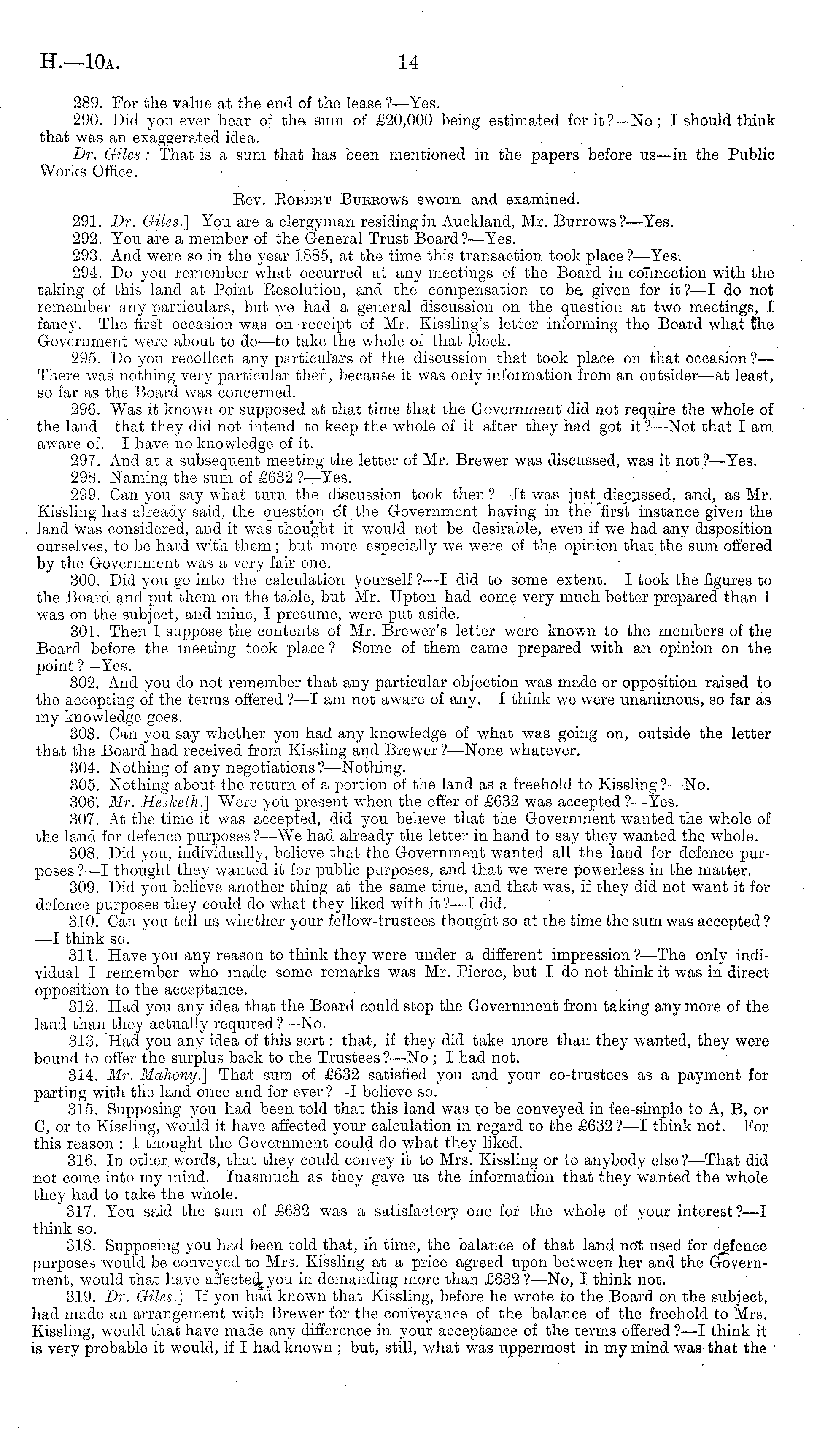 289. For the value at the end of the lease ? —Yes. 290. Did you ever hear of the- sum of £20,000 being estimated for it?—No; I should think that was an exaggerated idea. Dr. Giles : That is a sum that has been mentioned in the papers before us—in the Public Works Office. Eev. Robert Bureows sworn and examined. 291. Dr. Giles.] You are a clergyman residing in Auckland, Mr. Burrows? —Yes. 292. You are a member of the General Trust Board? —Yes. 293. And were so in the year 1885, at the time this transaction took place?—Yes. 294. Do you remember what occurred at any meetings of the Board in connection with the taking of this land at Point Resolution, and the compensation to be, given for it?—l do not remember any particulars, but we had a general discussion on the question at two meetings, I fancy. The first occasion was on receipt of Mr. Kissling's letter informing the Board what the Government were about to do—to take the whole of that block. 295. Do you recollect any particulars of the discussion that took place on that occasion?— There was nothing very particular then, because it was only information from an outsider—at least, so far as the Board was concerned. 296. Was it known or supposed at that time that the Government did not require the whole of the land —that they did not intend to keep the whole of it after they had got it ?—Not that I am aware of. I have no knowledge of it. 297. And at a subsequent meeting the letter of Mr. Brewer was discussed, was it not?—Yes. 298. Naming the sum of £632 ?—Yes. 299. Can you say what turn the discussion took then?—lt was just discussed, and, as Mr. Kissling has already said, the question of the Government having in the first instance given the land was considered, and it was thought it would not be desirable, even if we had any disposition ourselves, to be hard with them; but more especially we were of the opinion that the sum offered by the Government was a very fair one. 300. Did you go into the calculation yourself? —I did to some extent. I took the figures to the Board and put them on the table, but Mr. Upton had come very much better prepared than I was on the subject, and mine, I presume, were put aside. 301. Then I suppose the contents of Mr. Brewer's letter were known to the members of the Board before the meeting took place ? Some of them came prepared with an opinion on the point ? —Yes. 302. And you do not remember that any particular objection was made or opposition raised to the accepting of the terms offered ? —I am not aware of any. I think we were unanimous, so far as my knowledge goes. 303. Can you say whether you had any knowledge of what was going on, outside the letter that the Board had received from Kissling and Brewer ?—None whatever. 304. Nothing of any negotiations ?—Nothing. 305. Nothing about the return of a portion of the land as a freehold to Kissling?—No. 306'. Mr. Hesketh.] Were you present when the offer of £632 was accepted?—Yes. 307. At the time it was accepted, did you believe that the Government wanted the whole of the land for defence purposes? —We had already the letter in hand to say they wanted the whole. 308. Did you, individually, believe that the Government wanted all the land for defence purposes ? —I thought they wanted it for public purposes, and that we were powerless in the matter. 309. Did you believe another thing at the same time, and that was, if they did not want it for defence purposes they could do what they liked with it? —I did. 310. Can you tell us whether your fellow-trustees thought so at the time the sum was accepted ? —I think so. 311. Have you any reason to think they were under a different impression?—The only individual I remember who made some remarks was Mr. Pierce, but I do not think it was in direct opposition to the acceptance. 312. Had you any idea that the Board could stop the Government from taking anymore of the land than they actually required? —No. 313. Had you any idea of this sort: that, if they did take more than they wanted, they were bound to offer the surplus back to the Trustees?—No ; I had not. 314. Mr. Mahony.] That sum of £632 satisfied you and your co-trustees as a payment for parting with the land once and for ever?—l believe so. 315. Supposing you had been told that this land was to be conveyed in fee-simple to A, B, or C, or to Kissling, would it have affected your calculation in regard to the £632?—1 think not. For this reason : I thought the Government could do what they liked. 316. In other words, that they could convey it to Mrs. Kissling or to anybody else ?—That did not come into my mind. Inasmuch as they gave us the information that they wanted the whole they had to take the whole. 317. You said the sum of £632 was a satisfactory one for the whole of your interest?—l think so. 318. Supposing you had been told that, in time, the balance of that land not used for defence purposes would be conveyed to Mrs. Kissling at a price agreed upon between her and the Government, would that have affected you in demanding more than £632 ? —No, I think not. 319. Dr. Giles.] If you had known that Kissling, before he wrote to the Board on the subject, had made an arrangement with Brewer for the conveyance of the balance of the freehold to Mrs. Kissling, would that have made any difference in your acceptance of the terms offered ?—I think it is very probable it would, if I had known ; but, still, what was uppermost in my mind was that the