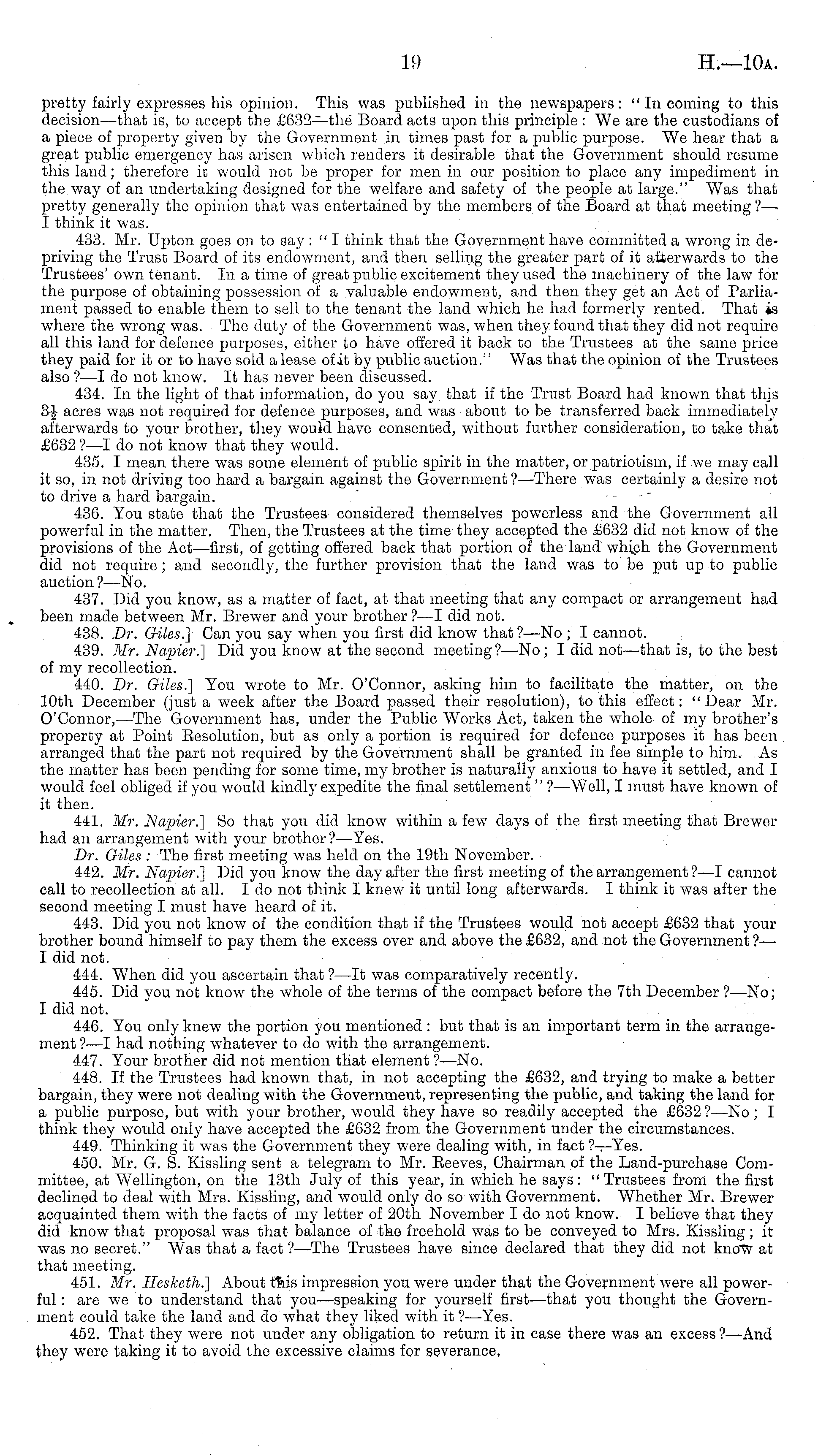 pretty fairly expresses his opinion. This was published in the newspapers: "Incoming to this decision—that is, to accept the £632—the Board acts upon this principle :We are the custodians of a piece of property given by the Government in times past for a public purpose. We hear that a great public emergency has arisen which renders it desirable that the Government should resume this land; therefore it would not be proper for men in our position to place any impediment in the way of an undertaking designed for the welfare and safety of the people at large." Was that pretty generally the opinion that was entertained by the members of the Board at that meeting ?— I think it was. 433. Mr. Upton goes on to say : " I think that the Government have committed a wrong in depriving the Trust Board of its endowment, and then selling the greater part of it afterwards to the Trustees' own tenant. In a time of great public excitement they used the machinery of the law for the purpose of obtaining possession of a valuable endowment, and then they get an Act of Parliament passed to enable them to sell to the tenant the land which he had formerly rented. That is where the wrong was. The duty of the Government was, when they found that they did not require all this land for defence purposes, either to have offered it back to the Trustees at the same price they paid for it or to have sold a lease of it by public auction." Was that the opinion of the Trustees also ?—I do not know. It has never been discussed. 434. In the light of that information, do you say that if the Trust Board had known that this 3£ acres was not required for defence purposes, and was about to be transferred back immediately afterwards to your brother, they would have consented, without further consideration, to take that £632 ?—I do not know that they would. 435. I mean there was some element of public spirit in the matter, or patriotism, if we may call it so, in not driving too hard a bargain against the Government ? —There was certainly a desire not to drive a hard bargain. 436. You state that the Trustees considered themselves powerless and the Government all powerful in the matter. Then, the Trustees at the time they accepted the £632 did not know of the provisions of the Act—first, of getting offered back that portion of the land which the Government did not require; and secondly, the further provision that the land was to be put up to public auction?—No. 437. Did you know, as a matter of fact, at that meeting that any compact or arrangement had been made between Mr. Brewer and your brother ?—I did not. 438. Dr. Giles.'] Can you say when you first did know that ?—No ; I cannot. 439. Mr. Napier. .] Did you know at the second meeting? —No; I did not —that is, to the best of my recollection. 440. Dr. Giles.] You wrote to Mr. O'Connor, asking him to facilitate the matter, on the 10th December (just a week after the Board passed their resolution), to this effect: "Dear Mr. O'Connor, —The Government has, under the Public Works Act, taken the whole of my brother's property at Point Eesolution, but as only a portion is required for defence purposes it has been arranged that the part not required by the Government shall be granted in fee simple to him. As the matter has been pending for some time, my brother is naturally anxious to have it settled, and I would feel obliged if you would kindly expedite the final settlement " ? —Well, I must have known of it then. 441. Mr. Napier.] So that you did know within a few days of the first meeting that Brewer had an arrangement with your brother?—Yes. Dr. Giles : The first meeting was held on the 19th November. ■ 442. Mr. Napier.] Did you know the day after the first meeting of the arrangement ?—I cannot call to recollection at all. Ido not think I knew it until long afterwards. I think it was after the second meeting I must have heard of it. 443. Did you not know of the condition that if the Trustees would not accept £632 that your brother bound himself to pay them the excess over and above the £632, and not the Government ? — I did not. 444. When did you ascertain that ?—lt was comparatively recently. 445. Did you not know the whole of the terms of the compact before the 7th December ?—No; I did not. 446. You only knew the portion you mentioned : but that is an important term in the arrangement? —I had nothing whatever to do with the arrangement. 447. Your brother did not mention that element ? —No. 448. If the Trustees had known that, in not accepting the £632, and trying to make a better bargain, they were not dealing with the Government, representing the public, and taking the land for a public purpose, but with your brother, would they have so readily accepted the £632 ?—No ; I think they would only have accepted the £632 from the Government under the circumstances. 449. Thinking it was the Government they were dealing with, in fact ?—Yes. 450. Mr. G. S. Kissling sent a telegram to Mr. Eeeves, Chairman of the Land-purchase Committee, at Wellington, on the 13th July of this year, in which he says : " Trustees from the first declined to deal with Mrs. Kissling, and would only do so with Government. Whether Mr. Brewer acquainted them with the facts of my letter of 20th November Ido not know. I believe that they did know that proposal was that balance of the freehold was to be conveyed to Mrs. Kissling ; it was no secret." Was that a fact ?—The Trustees have since declared that they did not know at that meeting. 451. Mr. Hesketh.] About tWs impression you were under that the Government were all powerful : are we to understand that you —speaking for yourself first—that you thought the Government could take the land and do what they liked with it ? —Yes. 452. That they were not under any obligation to return it in case there was an excess ?—And they w Tere taking it to avoid the excessive claims for severance,