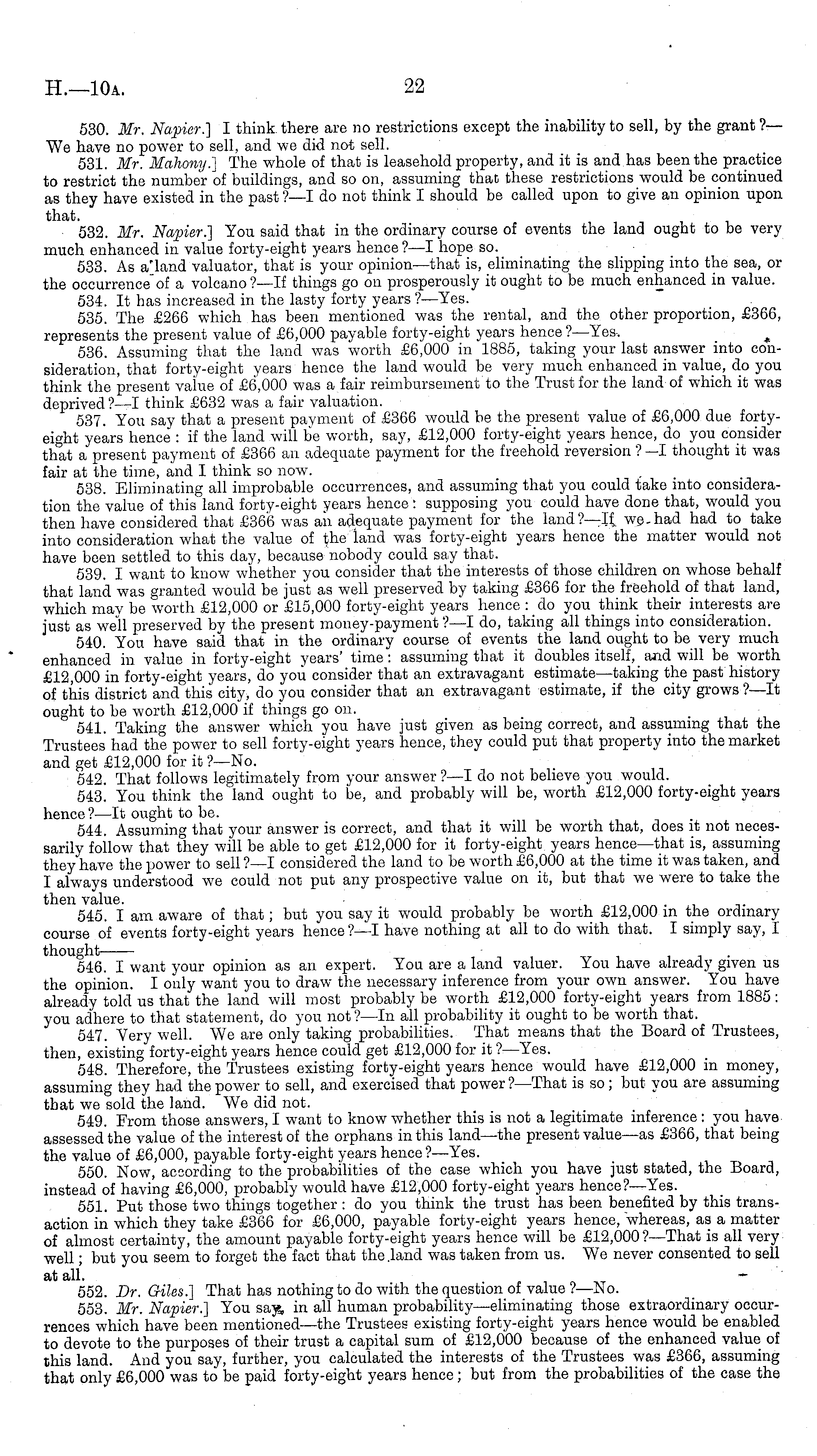 530. Mr. Napier.] I think there are no restrictions except the inability to sell, by the grant ?— We have no power to sell, and we did not sell. 531. Mr. Mahony.] The whole of that is leasehold property, and it is and has been the practice to restrict the number of buildings, and so on, assuming that these restrictions would be continued as they have existed in the past ?—I do not think I should be called upon to give an opinion upon that. 532. Mr. Napier.] You said that in the ordinary course of events the land ought to be very much enhanced in value forty-eight years hence ?—I hope so. 533. As aland valuator, that is your opinion—that is, eliminating the slipping into the sea, or the occurrence"of a volcano?—lf things go on prosperously it ought to be much enhanced in value. 534. It has increased in the lasty forty years ?—Yes. 535. The £266 which has been mentioned was the rental, and the other proportion, £366, represents the present value of £6,000 payable forty-eight years hence ? —Yes. 536. Assuming that the land was worth £6,000 in 1885, taking your last answer into consideration, that forty-eight years hence the land would be very much enhanced in value, do you think the present value of £6,000 was a fair reimbursement to the Trust for the land of which it was deprived ?—I think £632 was a fair valuation. 537. You say that a present payment of £366 would be the present value of £6,000 due fortyeight years hence : if the land will be worth, say, £12,000 forty-eight years hence, do you consider that a present payment of £366 an adequate payment for the freehold reversion ? —I thought it was fair at the time, and I think so now. 538. Eliminating all improbable occurrences, and assuming that you could take into consideration the value of this land forty-eight years hence : supposing you could have done that, would you then have considered that £366 was air adequate payment for the land?—lf we.had had to take into consideration what the value of the land was forty-eight years hence the matter would not have been settled to this day, because nobody could say that. 539. I want to know whether you consider that the interests of those children on whose behalf that land was granted would be just as well preserved by taking £366 for the freehold of that land, which may be worth £12,000 or £15,000 forty-eight years hence : do you think their interests are just as well preserved by the present money-payment ?—I do, taking all things into consideration. 540. You have said that in the ordinary course of events the land ought to be very much enhanced in value in forty-eight years' time: assuming that it doubles itself, _ and will be worth £12,000 in forty-eight years, do you consider that an extravagant estimate —taking the past history of this district and this city, do you consider that an extravagant estimate, if the city grows ?—lt ought to be worth £12,000 if things go on. 541. Taking the answer which you have just given as being correct, and assuming that the Trustees had the power to sell forty-eight years hence, they could put that property into the market and get £12,000 for it ?—No. 542. That follows legitimately from your answer?—l do not believe you would. 543. You think the land ought to be, and probably will be, worth £12,000 forty-eight years hence?—lt ought to be. 544. Assuming that your answer is correct, and that it will be worth that, does it not necessarily follow that they will be able to get £12,000 for it forty-eight years hence—that is, assuming they have the power to sell ?—I considered the land to be worth £6,000 at the time it was taken, and I always understood we could not put any prospective value on it, but that we were to take the then value. 545. lam aware of that; but you say it would probably be worth £12,000 m the ordinary course of events forty-eight years hence ? —I have nothing at all to do with that. I simply say, I thought . 546. I want your opinion as an expert. You are a land valuer. You have already given us the opinion. I only want you to draw the necessary inference from your own answer. You have already told us that the land will most probably be worth £12,000 forty-eight years from 1885: you adhere to that statement, do you not ?—ln all probability it ought to be worth that. 547. Very well. We are only taking probabilities. That means that the Board of Trustees, then, existing forty-eight years hence could get £12,000 for it ? —Yes. 548. Therefore, the Trustees existing forty-eight years hence would have £12,000 in money, assuming they had the power to sell, and exercised that power ?—That is so ; but you are assuming that we sold the land. We did not. 549. From those answers, I want to know whether this is not a legitimate inference : you have assessed the value of the interest of the orphans in this land—the present value—as £366, that being the value of £6,000, payable forty-eight years hence?—Yes. 550. Now, according to the probabilities of the case which you have just stated, the Board, instead of having £6,000, probably would have £12,000 forty-eight years hence?—Yes. 551. Put those two things together : do you think the trust has been benefited by this transaction in which they take £366 for £6,000, payable forty-eight years hence, whereas, as a matter of almost certainty, the amount payable forty-eight years hence will be £12,000?—That is all very well; but you seem to forget the fact that the land was taken from us. We never consented to sell at all. — 552. Dr. Giles.] That has nothing to do with the question of value ? —No. 553. Mr. Napier.] You sajs, in all human probability —eliminating those extraordinary occurrences which have been mentioned—the Trustees existing forty-eight years hence would be enabled to devote to the purposes of their trust a capital sum of £12,000 because of the enhanced value of this land. And you say, further, you calcu