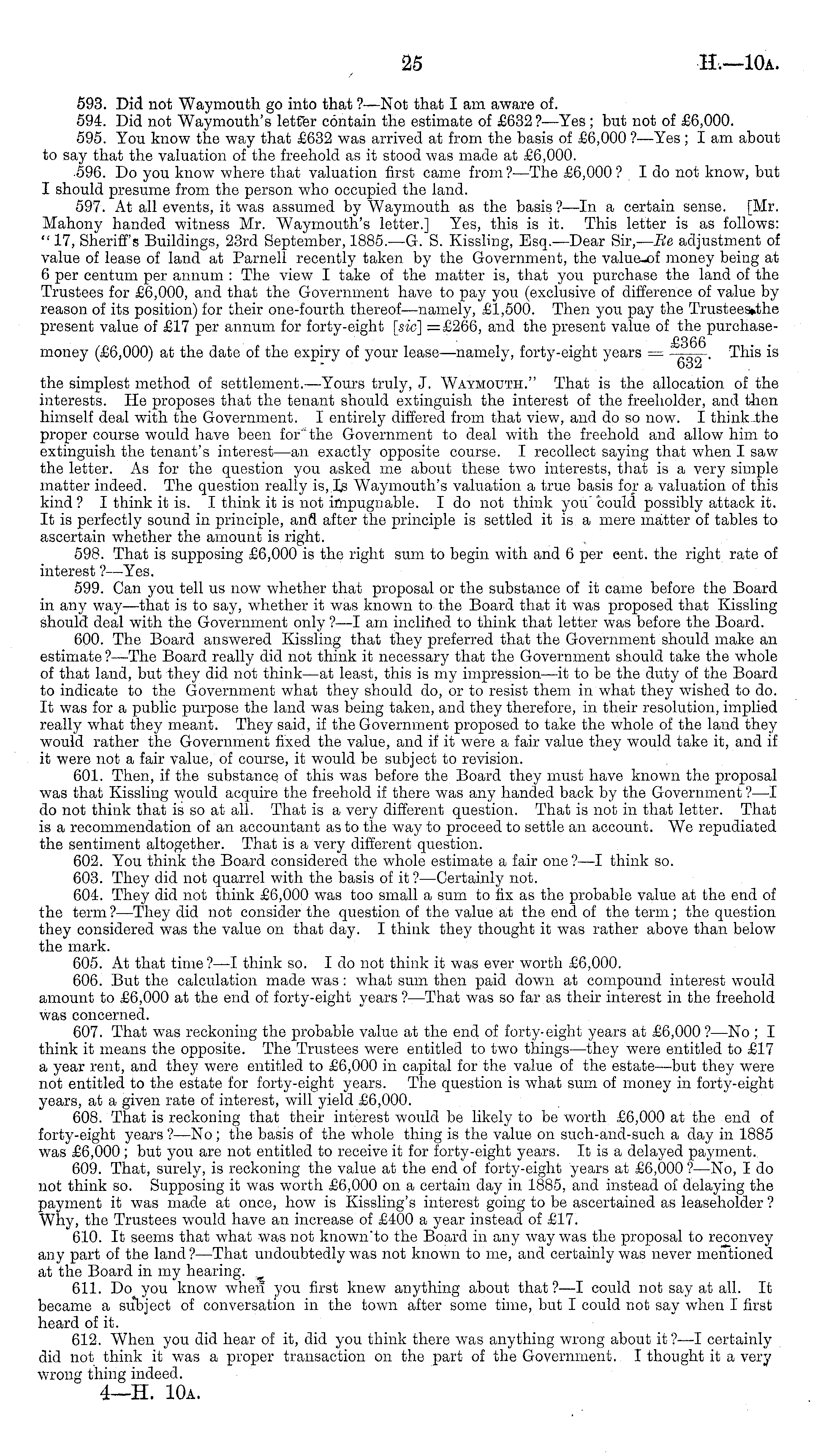593. Did not Waymoufch go into that ?—Not that I am aware of. 594. Did not Waymouth's letter contain the estimate of £632?—Yes ; but not of £6,000. 595. You know the way that £632 was arrived at from the basis of £6,000 ?—Yes; I am about to say that the valuation of the freehold as it stood was made at £6,000. 596. Do you know where that valuation first came from ?—The £6,000 ? Ido not know, but I should presume from the person who occupied the land. 597. At all events, it was assumed by Waymouth as the basis?—ln a certain sense. [Mr. Mahony handed witness Mr. Waymouth's letter.] Yes, this is it. This letter is as follows: " 17, Sheriff's Buildings, 23rd September, 1885.—G. S. Kissb'ng, Esq. —Dear Sir, — Be adjustment of value of lease of land at Parnell recently taken by the Government, the value~of money being at 6 per centum per annum : The view I take of the matter is, that you purchase the land of the Trustees for £6,000, and that the Government have to pay you (exclusive of difference of value by reason of its position) for their one-fourth thereof—namely, £1,500. Then you pay the Trusteessthe present value of £17 per annum for forty-eight [sic] =£266, arid the present value of the purchaseno c c money (£6,000) at the date of the expiry of your lease—namely, forty-eight years == -^ o - ?r . This is the simplest method of settlement.—Yours truly, J, Waymouth." That is the allocation of the interests. He proposes that the tenant should extinguish the interest of the freeholder, and then himself deal with the Government. I entirely differed from that view, and do so now. I thinkthe proper course would have been for the Government to deal with the freehold and allow him to extinguish the tenant's interest —an exactly opposite course. I recollect saying that when I saw the letter. As for the question you asked me about these two interests, that is a very simple matter indeed. The question really is, Is Waymouth's valuation a true basis for a valuation of this kind ? I think it is. I think it is not impugnable. I do not think you could possibly attack it. It is perfectly sound in principle, and after the principle is settled it is a mere matter of tables to ascertain whether the amount is right. 598. That is supposing £6,000 is the right sum to begin with and 6 per cent, the right rate of interest ?—Yes. 599. Can you tell us now whether that proposal or the substance of it came before the Board in any way—that is to say, whether it was known to the Board that it was proposed that Kissling should deal with the Government only ?—I am inclined to think that letter was before the Board. 600. The Board answered Kissling that they preferred that the Government should make an estimate ?—The Board really did not think it necessary that the Government should take the whole of that land, but they did not think—at least, this is my impression—it to be the duty of the Board to indicate to the Government what they should do, or to resist them in what they wished to do. It was for a public purpose the land was being taken, and they therefore, in their resolution, implied really what they meant. They said, if the Government proposed to take the whole of the land they would rather the Government fixed the value, and if it were a fair value they would take it, and if it were not a fair value, of course, it would be subject to revision. 601. Then, if the substance of this was before the Board they must have known the proposal was that Kissling would acquire the freehold if there was any handed back by the Government ?—I do not think that is so at all. That is a very different question. That is not in that letter. That is a recommendation of an accountant as to the way to proceed to settle an account. We repudiated the sentiment altogether. That is a very different question. 602. You think the Board considered the whole estimate a fair one?—l think so. 603. They did not quarrel with the basis of it ?—Certainly not. 604. They did not think £6,000 was too small a sum to fix as the probable value at the end of the term ? —They did not consider the question of the value at the end of the term ; the question they considered was the value on that day. I think they thought it was rather above than below the mark. 605. At that time?—l think so. Ido not think it was ever worth £6,000. 606. But the calculation made was : what sum then paid down at compound interest would amount to £6,000 at the end of forty-eight years ? —That was so far as their interest in the freehold was concerned. 607. That was reckoning the probable value at the end of forty-eight years at £6,000? —No ; I think it means the opposite. The Trustees were entitled to two things —they were entitled to £17 a year rent, and they were entitled to £6,000 in capital for the value of the estate—but they were not entitled to the estate for forty-eight years. The question is what sum of money in forty-eight years, at a given rate of interest, will yield £6,000. 608. That is reckoning that their interest would be likely to be worth £6,000 at the end of forty-eight years ?—No; the basis of the whole thing is the value on such-and-such a day in 1885 was £6,000 ; but you are not entitled to receive it for forty-eight years. It is a delayed payment. 609. That, surely, is reckoning the value at the end of forty-eight years at £6,000 ?—No, I do not think so. Supposing it was worth £6,000 on a certain day in 1885, and instead of delaying the payment it was made at once, how is Kissling's interest going to be ascertained as leaseholder ? Why, the Trustees would have an increase of £400 a year instead of £17. 610. It seems that what was not known to the Board in any way was the proposal to reconvey any part of the land?—That undoubtedly was not known to me, and certainly was never mentioned at the Board in my hearing. 611. Do you know when you first knew anything about that ?—I co