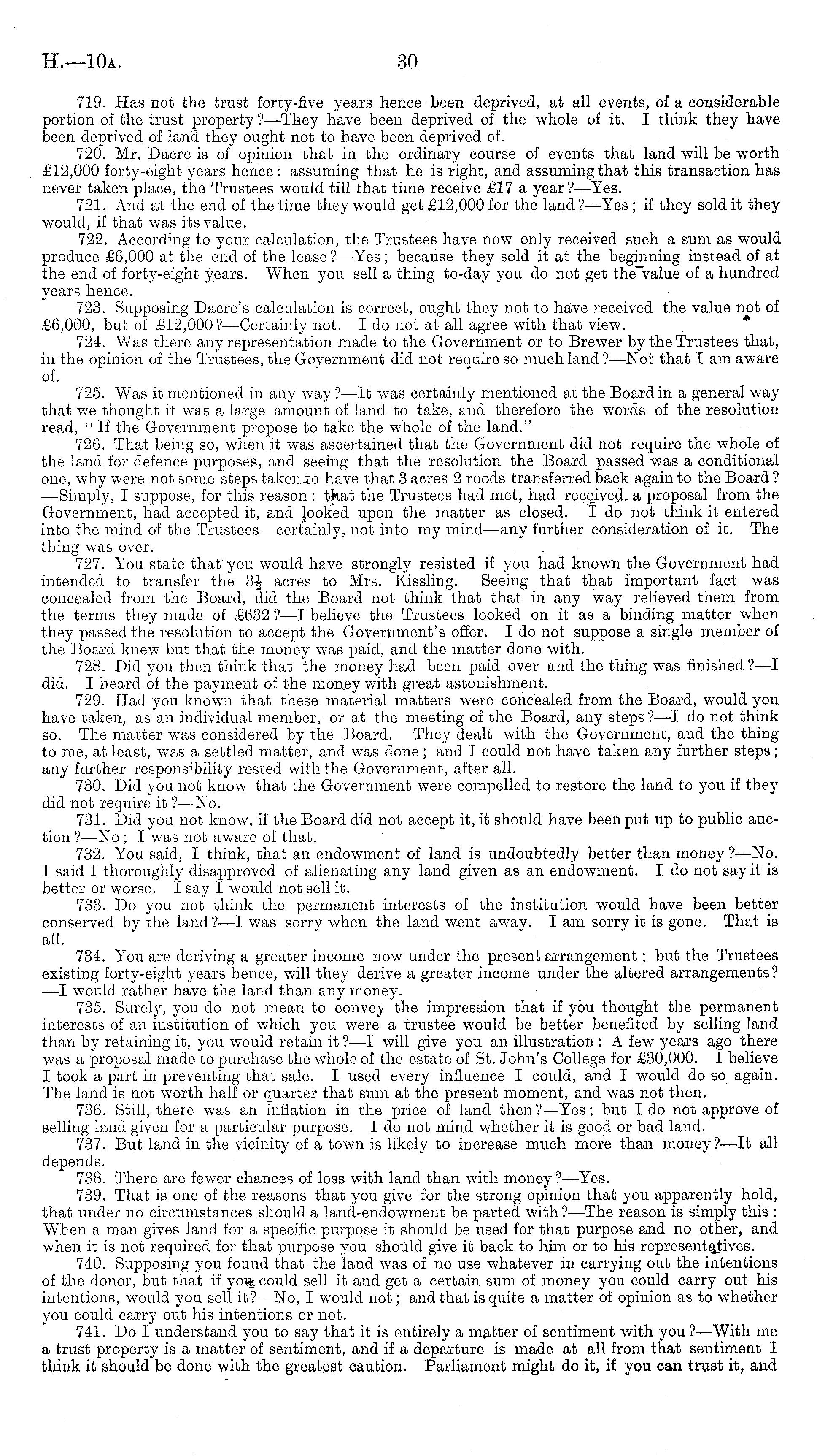 719. Has not the trust forty-five years hence been deprived, at all events, of a considerable portion of the trust property ?—They have been deprived of the whole of it. I think they have been deprived of land they ought not to have been deprived of. 720. Mr. Dacre is of opinion that in the ordinary course of events that land will be worth £12,000 forty-eight years hence: assuming that he is right, and assuming that this transaction has never taken place, the Trustees would till that time receive £17 a year?—Yes. 721. And at the end of the time they would get £12,000 for the land ?—Yes ; if they sold it they would, if that was its value. 722. According to your calculation, the Trustees have now only received such a sum as would produce £6,000 at the end of the lease ?—Yes; because they sold it at the beginning instead of at the end of forty-eight years. When you sell a thing to-day you do not get the"Value of a hundred years hence. 723. Supposing Dacre's calculation is correct, ought they not to have received the value not of £6,000, but of £12,000? —Certainly not. Ido not at all agree with that view. 724. Was there any representation made to the Government or to Brewer by the Trustees that, in the opinion of the Trustees, the Government did not require so much land ? —Not that I am aware of. 725. Was it mentioned in any way ?—lt was certainly mentioned at the Board in a general way that we thought it was a large amount of laud to take, and therefore the words of the resolution read, " If the Government propose to take the whole of the land." 726. That being so, when it was ascertained that the Government did not require the whole of the land for defence purposes, and seeing that the resolution the Board passed was a conditional one, why were not some steps taken-to have that 3 acres 2 roods transferred back again to the Board ? —Simply, I suppose, for this reason : that the Trustees had met, had received, a proposal from the Government, had accepted it, and looked upon the matter as closed. Ido not think it entered into the mind of the Trustees—certainly, not into my mind —any further consideration of it. The thing was over. 727. You state that'you would have strongly resisted if you had known the Government had intended to transfer the 3| acres to Mrs. Kissling. Seeing that that important fact was concealed from the Board, did the Board not think that that in any way relieved them from the terms they made of £632 ? —I believe the Trustees looked on it as a binding matter when they passed the resolution to accept the Government's offer. Ido not suppose a single member of the Board knew but that the money was paid, and the matter done with. 728. .Did you then think that the money had been paid over and the thing was finished ? —I did. I heard of the payment of the money with great astonishment. 729. Had you known that these material matters were concealed from the Board, would you have taken, as an individual member, or at the meeting of the Board, any steps ? —I do not think so. The matter was considered by the Board. They dealt with the Government, and the thing to me, at least, was a settled matter, and was done ; and I could not have taken any further steps; any further responsibility rested with the Government, after all. 730. Did you not know that the Government were compelled to restore the land to you if they did not require it ?—No. 731. Did you not know, if the Board did not accept it, it should have been put up to public auction ?—No ; I was not aware of that. 732. You said, I think, that an endowment of land is undoubtedly better than money?—No. I said I thoroughly disapproved of alienating any land given as an endowment. Ido not say it is better or worse. I say I would not sell it. 733. Do you not think the permanent interests of the institution would have been better conserved by the land?—l was sorry when the land went away. lam sorry it is gone. That is all. 734. You are deriving a greater income now under the present arrangement; but the Trustees existing forty-eight years hence, will they derive a greater income under the altered arrangements? —I would rather have the land than any money. 735. Surely, you do not mean to convey the impression that if you thought the permanent interests of an institution of which you were a trustee would be better benefited by selling land than by retaining it, you would retain it ?—I will give you an illustration : A few years ago there was a proposal made to purchase the whole of the estate of St. John's College for £30,000. I believe I took a part in preventing that sale. I used every influence I could, and I would do so again. The land is not worth half or quarter that sum at the present moment, and was not then. 736. Still, there was an inflation in the price of land then?—Yes; but I do not approve of selling land given for a particular purpose. Ido not mind whether it is good or bad land. 737. But land in the vicinity of a town is likely to increase much more than money?—lt all depends. 738. There are fewer chances of loss with land than with money? —Yes. 739. That is one of the reasons that you give for the strong opinion that you apparently hold, that under no circumstances should a land-endowment be parted with ?—The reason is simply this : When a man gives land for a specific purpose it should be used for that purpose and no other, and when it is not required for that purpose you should give it back to him or to his representatives. 740. Supposing you found that the land was of no use whatever in carrying out the intentions of the donor, but that if yoi^ could sell it and get a certain sum of money you could carry out his intentions, would you sell it?—No, I would not; and that is quite a matter of opinion as to whether you could carry out his intentions or not. 741. Do I understand you to say that it is entirely a matter of sentiment with you ?—With me a trust property i