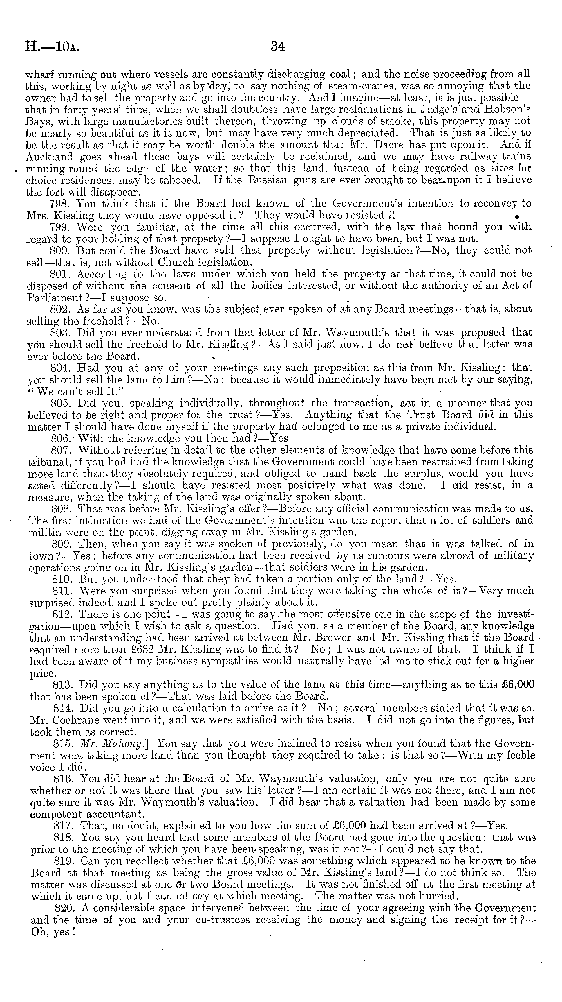 wharf running out where vessels are constantly discharging coal; and the noise proceeding from all this, working by night as well as by "day,' to say nothing of steam-cranes, was so annoying that the owner had to sell the property and go into the country. And I imagine—at least, it is just possible — that in forty years' time, when we shall doubtless have large reclamations in Judge's'and Hobson's Bays, with large manufactories built thereon, throwing up clouds of smoke, this property may not be nearly so beautiful as it is now, but may have very much depreciated. That is just as likely to be the result as that it may be worth double the amount that Mr. Dacre has put upon it. And if Auckland goes ahead these bays will certainly be reclaimed, and we may have railway-trains running round the edge of the water; so that this land, instead of being regarded as sites for choice residences, may be tabooed. If the Eussian guns are ever brought to bear-upon it I believe the fort will disappear. 798. You think that if the Board had known of the Government's intention to reconvey to Mrs. Kissling they would have opposed it ?—They would have lesisted it 799. Were you familiar, at the time all this occurred, with the law that bound you with regard to your holding of that property?—l suppose I ought to have been, but I was not. 800. But could the Board have sold that property without legislation ?—No, they could not sell—that is, not without Church legislation. 801. According to the laws under which you held the property at that time, it could not be disposed of without the consent of all the bodies interested, or without the authority of an Act of Parliament ?—I suppose so. 802. As far as you know, was the subject ever spoken of at any Board meetings—that is, about selling the freehold ?—No. 803. Did you ever understand from that letter of Mr. Waymouth's that it was proposed that you should sell the freehold to Mr. Kissling ?—As I said just now, I do not believe that letter was ever before the Board. 804. Had you at any of your meetings any such proposition as this from Mr. Kissling: that you should sell the land to him ? —No ; because it would immediately have been met by our saying, "We can't sell it." 805. Did you, speaking individually, throughout the transaction, act in a manner that you believed to be right and proper for the trust ?—Yes. Anything that the Trust Board did in this matter I should have done myself if the property had belonged to me as a private individual. 806. With the knowledge you then had ?—Yes. 807. Without referring in detail to the other elements of knowledge that have come before this tribunal, if you had had the knowledge that the Government could have been restrained from taking more land than-they absolutely required, and obliged to hand back the surplus, would you have acted differently? —I should have resisted most positively what was done. I did resist, in a measure, when the taking of the land was originally spoken about. 808. That was before Mr. Kissling's offer?—Before any official communication was made to us. The first intimation we had of the Government's intention was the report that a lot of soldiers and militia were on the point, digging away in Mr. Kissling's garden. 809. Then, when you say it was spoken of previously, do you mean that it was talked of in toWn ?—Yes : before any communication had been received by us rumours were abroad of military operations going on in Mr. Kissling's garden—that soldiers were in his garden. 810. But you understood that they had taken a portion only of the land?—Yes. 811. Were you surprised when you found that they were taking the whole of it? —Very much surprised indeed, and I spoke out pretty plainly about it. 812. There is one point—l was going to say the most offensive one in the scope of the investigation—upon which I wish to ask a question. Had you, as a member of the Board, any knowledge that an understanding had been arrived at between Mr. Brewer and Mr. Kissling that if the Board required more than £632 Mr. Kissling was to find it ? —No ; I was not aware of that. I think if I had been aware of it my business sympathies would naturally have led me to stick out for a higher price. 813. Did you say anything as to the value of the land at this time—anything as to this £6,000 that has been spoken of ?—That was laid before the Board. 814. Did you go into a calculation to arrive at it ?—No; several members stated that it was so. Mr. Cochrane went into it, and we were satisfied with the basis. I did not go into the figures, but took them as correct. 815. Mr. MaJwny.'] You say that you were inclined to resist when you found that the Government were taking more land than you thought they required to take'; is that so ?—With my feeble voice I did. 816. You did hear at the Board of Mr. Waymouth's valuation, only you are not quite sure whether or not it was there that you saw his letter ? —I am certain it was not there, and lam not quite sure it was Mr. Waymouth's valuation. I did hear that a valuation had been made by some competent accountant. 817. That, no doubt, explained to you how the sum of £6,000 had been arrived at ?—Yes. 818. You say you heard that some members of the Board had gone into the question: that was prior to the meeting of which you have been speaking, was it not ?—I could not say that. 819. Can you recollect whether that £6,000 was something which appeared to be known to the Board at that meeting as being the gross value of Mr. Kissling's land?—l do not think so. The matter was discussed at one ifr two Board meetings. It was not finished off at the first meeting at which it came up, but I cannot say at which meeting. The matter was not hurried. 820. A considerable space intervened between the time of your agreeing with the Government and the time of you and your co-trustees receiving the money and signing the receipt for it ? — Oh, yes !