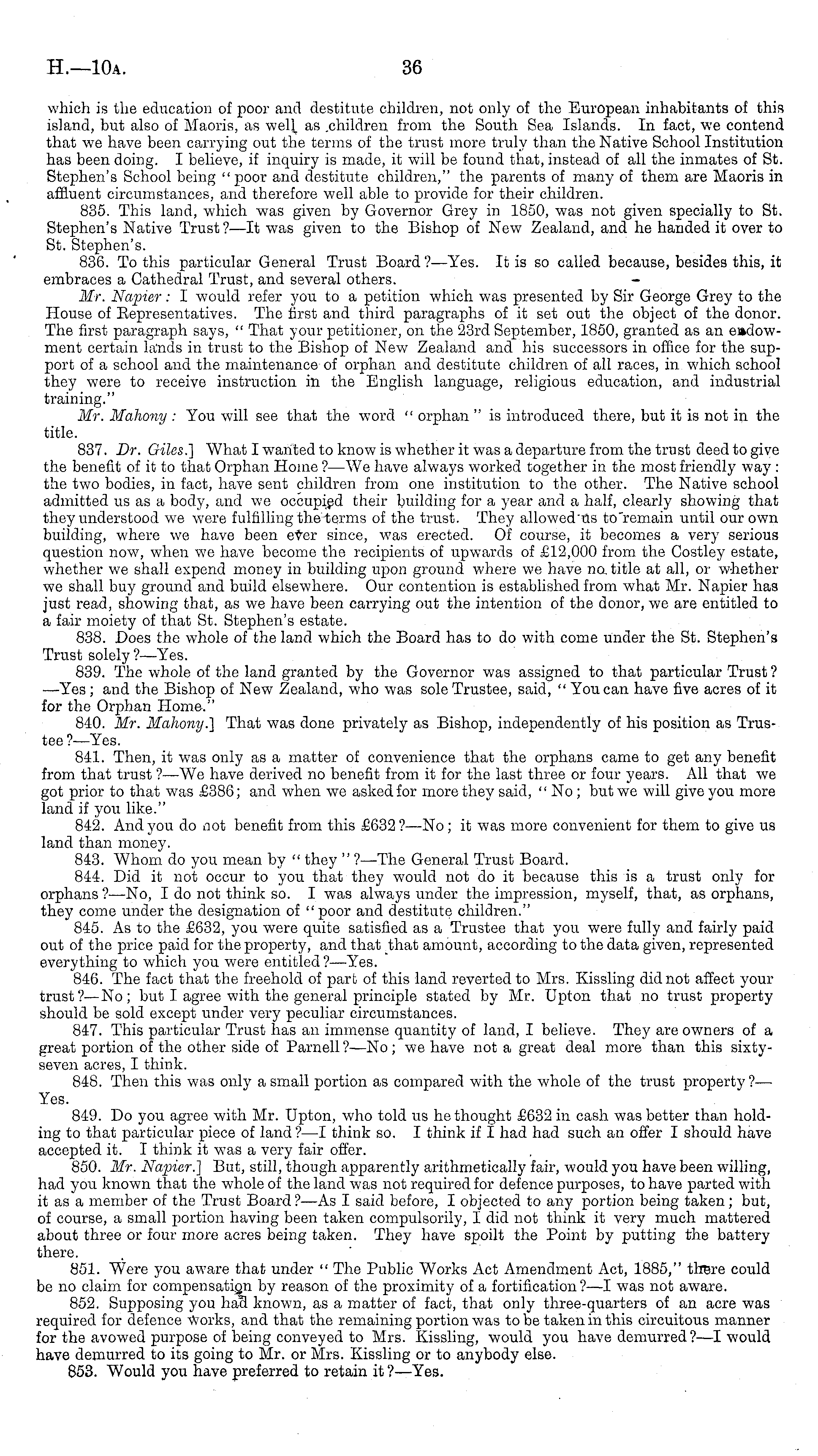 which is the education of poor and destitute children, not only of the European inhabitants of this island, but also of Maoris, as well, as .children from the South Sea Islands. In fact, we contend that we have been carrying out the terms of the trust more truly than the Native School Institution has been doing. I believe, if inquiry is made, it will be found that, instead of all the inmates of St. Stephen's School being "poor and destitute children," the parents of many of them are Maoris in affluent circumstances, and therefore well able to provide for their children. 835. This land, which was given by Governor Grey in 1850, was not given specially to St. Stephen's Native Trust?—lt was given to the Bishop of New Zealand, and he handed it over to St. Stephen's. 836. To this particular General Trust Board ?—Yes. It is so called because, besides this, it embraces a Cathedral Trust, and several others. Mr. Napier: I would refer you to a petition which was presented by Sir George Grey to the House of Eepresentatives. The first and third paragraphs of it set out the object of the donor. The first paragraph says, " That your petitioner, on the 23rd September, 1850, granted as an eadowment certain la'nds in trust to the Bishop of New Zealand and his successors in office for the support of a school and the maintenance of orphan and destitute children of all races, in which school they were to receive instruction in the English language, religious education, and industrial training." Mr. Mahony : You will see that the word " orphan " is introduced there, but it is not in the title. 837. Dr. Giles.] What I wanted to know is whether it was a departure from the trust deed to give the benefit of it to that Orphan Home ? —We have always worked together in the most friendly way : the two bodies, in fact, have sent children from one institution to the other. The Native school admitted us as a body, and we occupied their building for a year and a half, clearly showing that they understood we were fulfilling the terms of the trust. They allowed'us to'remain until our own building, where we have been ever since, was erected. Of course, it becomes a very serious question now, when we have become the recipients of upwards of £12,000 from the Costley estate, whether we shall expend money in building upon ground where we have no title at all, or whether we shall buy ground and build elsewhere. Our contention is established from what Mr. Napier has just read, showing that, as we have been carrying out the intention of the donor, we are entitled to a fair moiety of that St. Stephen's estate. 838. Does the whole of the land which the Board has to do with come under the St. Stephen's Trust solely ?—Yes. 839. The whole of the land granted by the Governor was assigned to that particular Trust ? —Yes ; and the Bishop of New Zealand, who was sole Trustee, said, " You can have five acres of it for the Orphan Home." 840. Mr. Mahony.] That was done privately as Bishop, independently of his position as Trustee ?—Yes. 841. Then, it was only as a matter of convenience that the orphans came to get any benefit from that trust ?—We have derived no benefit from it for the last three or four years. All that we got prior to that was £386; and when we asked for more they said, " No ; but we will give you more land if you like." 842. And you do not benefit from this £632 ? —No; it was more convenient for them to give us land than money. 843. Whom do you mean by " they " ?—The General Trust Board. 844. Did it not occur to you that they would not do it because this is a trust only for orphans ? —No, Ido not think so. I was always under the impression, myself, that, as orphans, they come under the designation of "poor and destitute children." 845. As to the £632, you were quite satisfied as a Trustee that you were fully and fairly paid out of the price paid for the property, and that that amount, according to the data given, represented everything to which you were entitled?—Yes. 846. The fact that the freehold of part of this land reverted to Mrs. Kissling did not affect your trust?—No; but I agree with the general principle stated by Mr. Upton that no trust property should be sold except under very peculiar circumstances. 847. This particular Trust has an immense quantity of land, I believe. They are owners of a great portion of the other side of Parnell ?—No ; we have not a great deal more than this sixtyseven acres, I think. 848. Then this was only a small portion as compared with the whole of the trust property ?— Yes. 849. Do you agree with Mr. Upton, who told us he thought £632 in cash was better than holding to that particular piece of land ?—I think so. I think if I had had such an offer I should have accepted it. I think it was a very fair offer. 850. Mr. Napier.] But, still, though apparently arithmetically fair, would you have been willing, had you known that the whole of the land was not required for defence purposes, to have parted with it as a member of the Trust Board?—As I said before, I objected to any portion being taken; but, of course, a small portion having been taken compulsorily, I did not think it very much mattered about three or four more acres being taken. They have spoilt the Point by putting the battery there. 851. Were you aware that under " The Public Works Act Amendment Act, 1885," there could be no claim for compensatign by reason of the proximity of a fortification? —I was not aware. 852. Supposing you had known, as a matter of fact, that only three-quarters of an acre was required for defence works, and that the remaining portion was to be taken in this circuitous manner for the avowed purpose of being conveyed to Mrs. Kissling, would you have demurred ?—I would have demurred to its going to Mr. or Mrs. Kissling or to anybody else. 853. Would you have preferred to retain it ?—Yes.