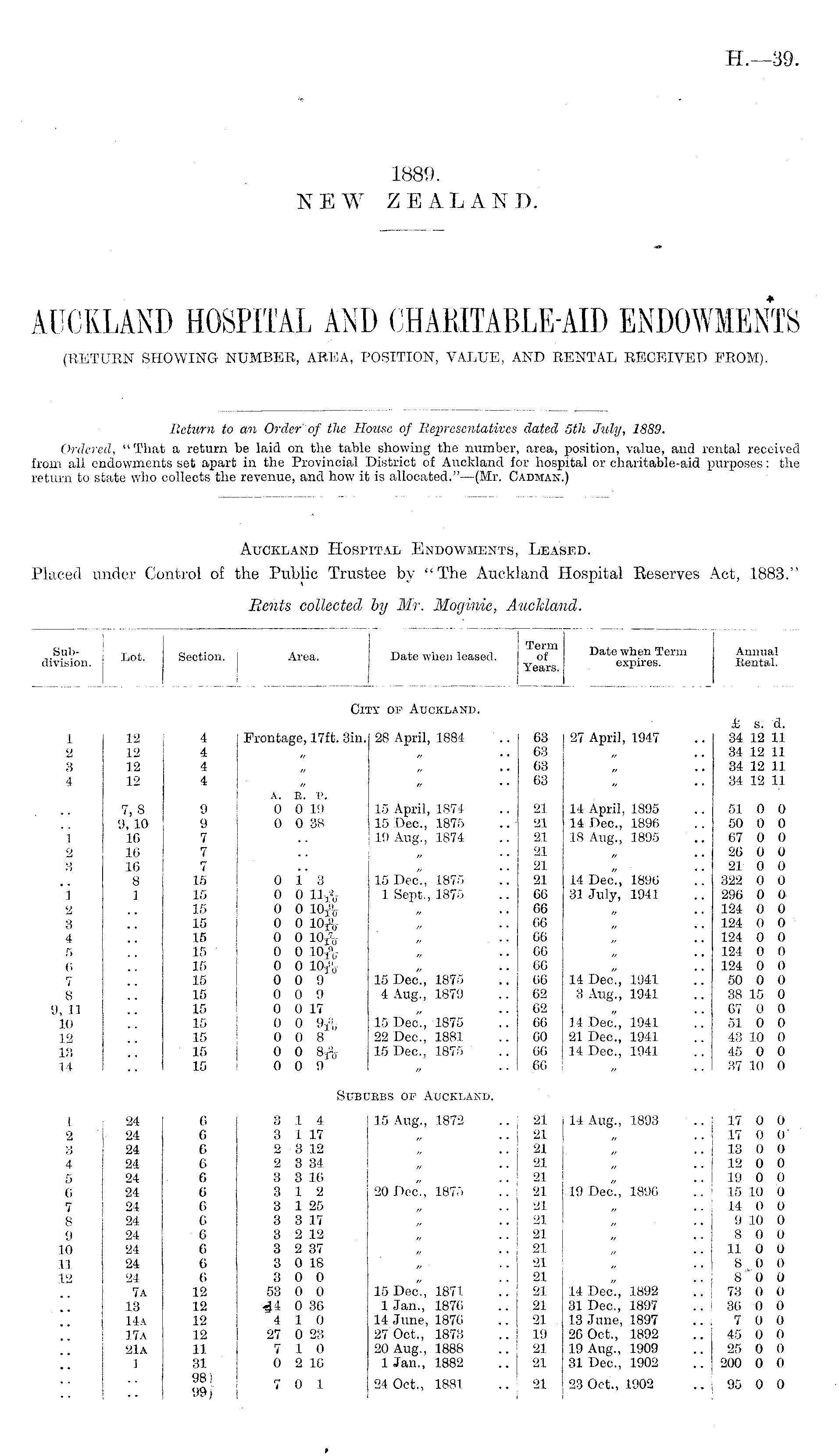 Auckland Hospital Endowments, Leased. Placed under Control of the Public Trustee by "The Auckland Hospital Reserves Act, 1883." Rents collected by Mr. Moginie, Auckland.