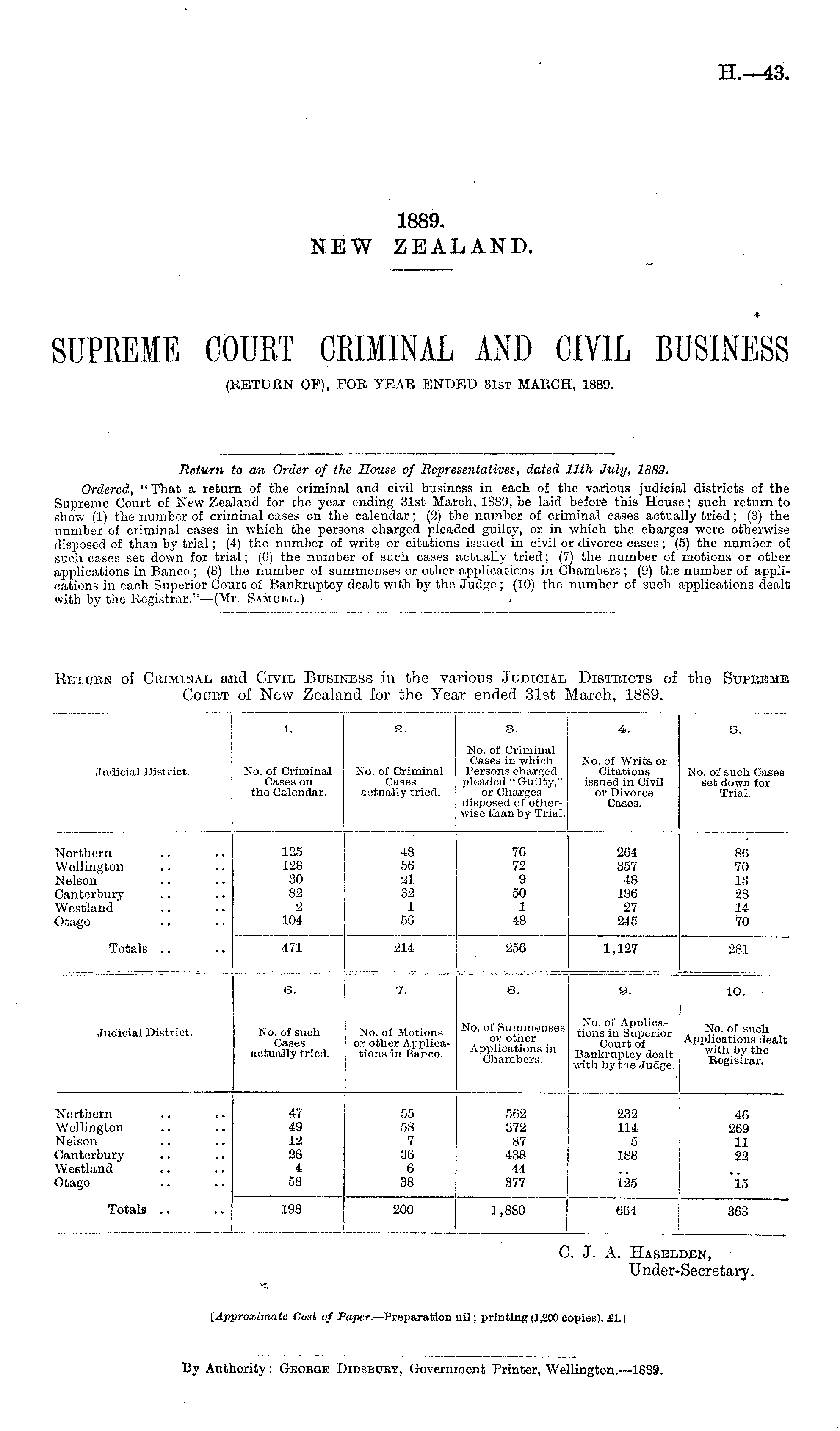 Return to an Order of the House of Representatives, dated 11th July, 1889. Ordered, "That a return of the criminal and civil business in each of the various judicial districts of the Supreme Court of New Zealand for che year ending 31st March, 1889, be laid before this House; such return to show (1) the number of criminal cases on the calendar; (2) the number of criminal cases actually tried ; (3) the number of criminal cases in which the persons charged pleaded guilty, or in which the charges were otherwise disposed of than by trial; (4) the number of writs or citations issued in civil or divorce cases; (5) the number of such cases set down for trial; (6) the number of such cases actually tried; (7) the number of motions or other applications in Banco ; (8) the number of summonses or other applications in Chambers ; (9) the number of applications in each Superior Court of Bankruptcy dealt with by the Judge ; (10) the number of such applications dealt with by the Registrar." —(Mr. Samuel.)