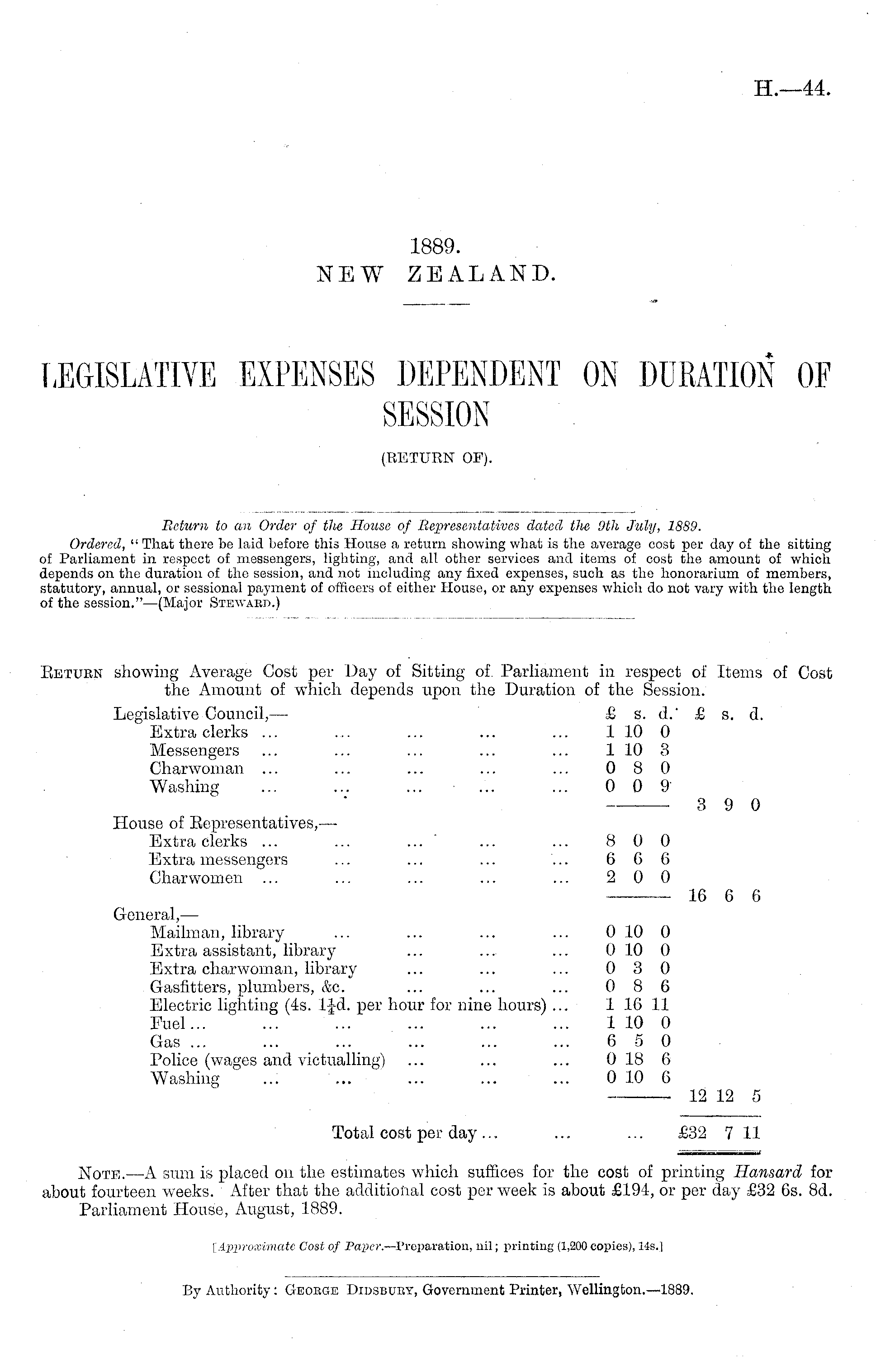 Return to an Order of the Souse of Representatives dated the 9th July, 1889. Ordered, " That there be laid before this House a return showing what is the average cost per day of the sitting of Parliament in respect of messengers, lighting, and all other services and items of cost the amount of which depends on the duration of the session, and not including any fixed expenses, such as the honorarium of members, statutory, annual, or sessional payment of officers of either House, or any expenses which do not vary with the length of the session."—(Major Steward.)