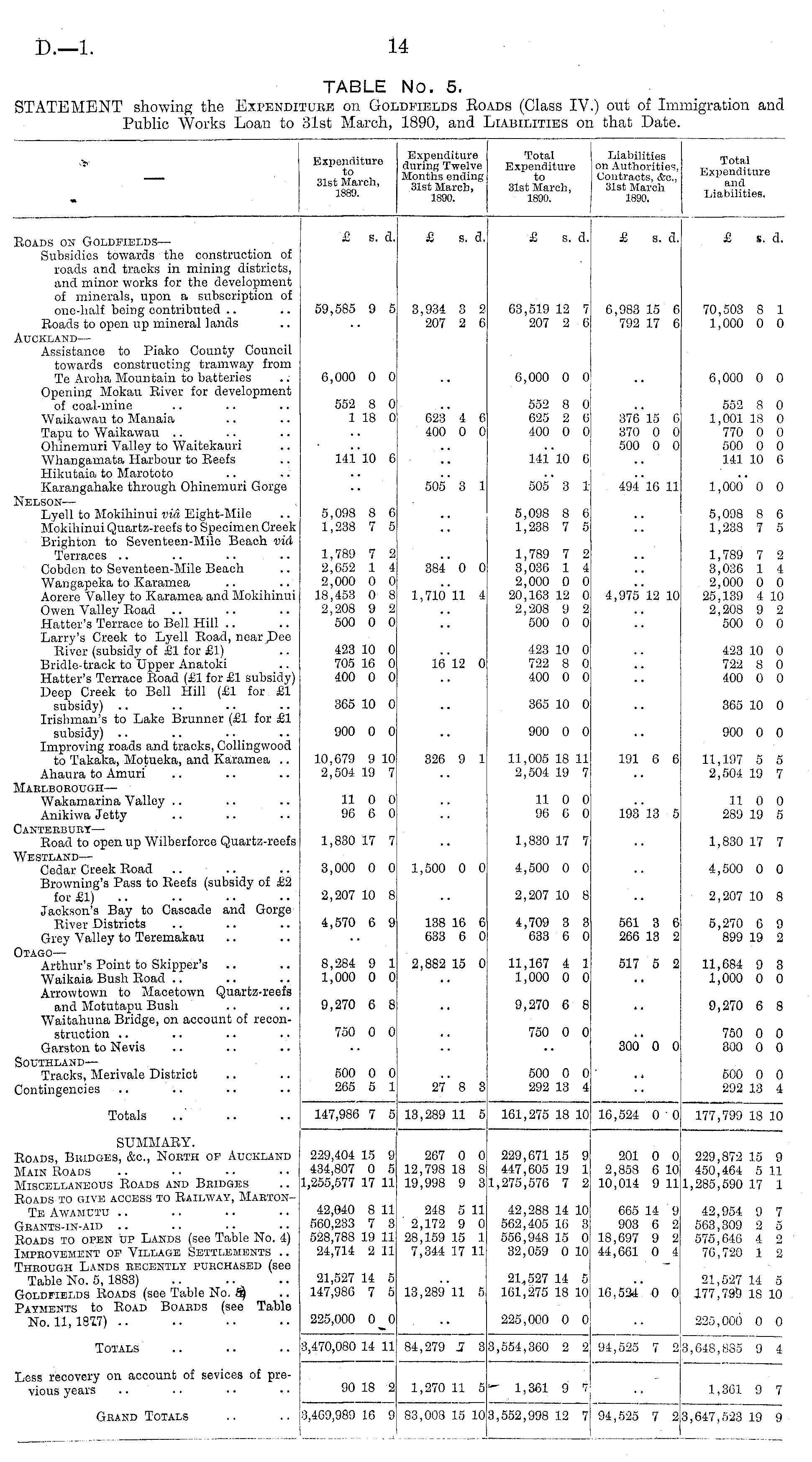 TABLE No. 5. STATEMENT showing the Expenditure on Goldfields Roads (Class IV.) out of Immigration and Public Works Loan to 31st March, 1890, and Liabilities on that Date.