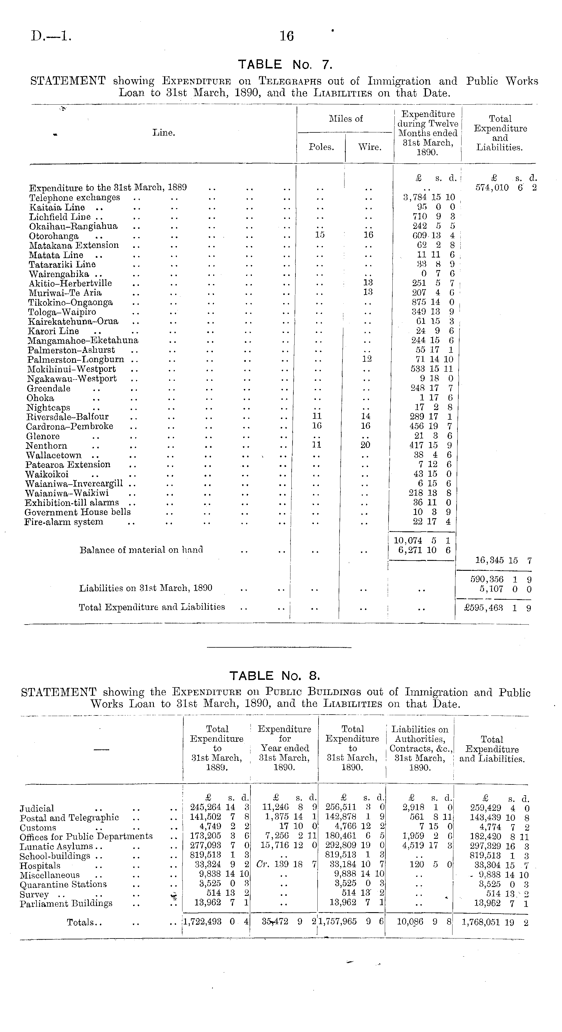 TABLE No. 7. STATEMENT showing Expenditure on Telegraphs out of Immigration and Public Works Loan to 31st March, 1890, and the Liabilities on that Date.