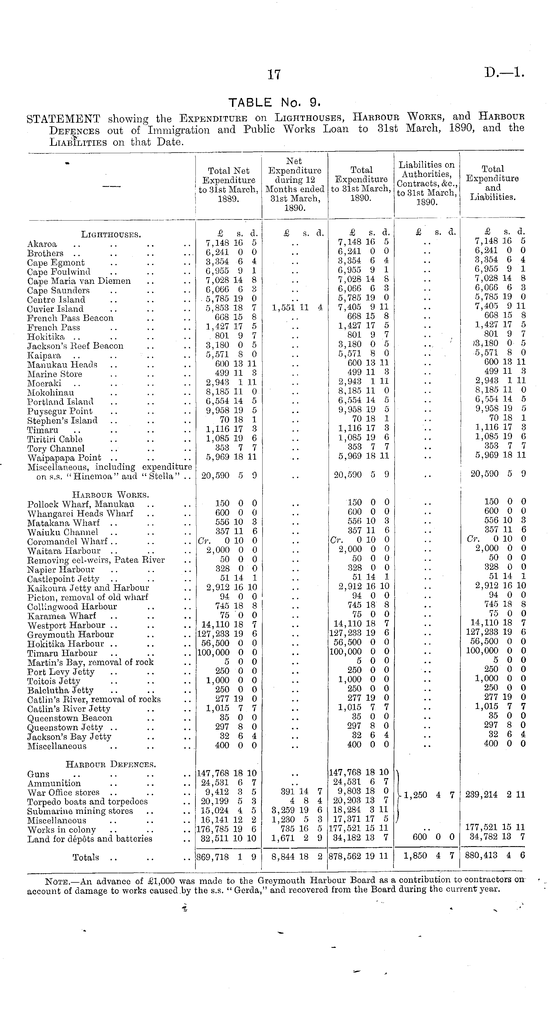 Total Net Expenditure to 31st March, 1889. Net Expenditure during 12 Months ended 31st March, 1890. Total Expenditure to 31st March, 1890. Liabilities on Authorities, Contracts, &c, to 31st March, 1890. Total Expenditure and Liabilities. Lighthouses. Akaroa Brothers Cape Egmont Cape Foulwind Cape Maria van Diemen Capo Saunders Centre Island Cuvier Island French Pass Beacon French Pass Hokitika Jackson's Beef Beacon Kaipara .. .. Manukau Heads Marine Store Moeraki Mokohinau Portland Island Puysegur Point Stephen's Island Timaru Tiritiri Cable Tory Channel Waipapapa Point Miscellaneous, including expenditure on s.s. "Hinemoa" and " Stella" .. £ s. d. 7,148 16 5 6,241 0 0 3,354 6 4 0,955 9 1 7,028 14 8 0,060 0 3 5,785 19 0 5,853 18 7 068 15 8 1,427 17 5 , 801 9 7 3,180 0 5 5,571 8 0 600 13 11 499 11 3 2,943 1 11 8,185 11 0 6,554 14 5 9,958 19 5 70 18 1 1,116 17 3 1,085 19 6 353 7 7 5,969 18 11 £ s. a, 1,551 11 4 & s. d. 7,148 16 5 0,241 0 0 3,354 6 4 6,955 9 1 7,028 14 8 6,066 6 3 5,785 19 0 7,405 9 11 668 15 8 1,427 17 5 '801 9 7 3,180 0 5 5,571 8 0 600 13 11 499 11 3 2,943 1 11 8,185 11 0 6,554 14 5 9,958 19 5 70 18 1 1,116 17 3 1,085 19 6 353 7 7 5,969 18 11 £ s. d. £ s. d. 7,148 16 5 6,241 0 0 3,354 6 4 6,955 9 1 7,028 14 8 6,066 6 3 5,785 19 0 7,405 9 11 668 15 8 1,427 17 5 801 9 7 13,180 0 5 5,571 8 0 600 13 11 499 11 3 2,943 1 11 8,185 11 0 6,554 14 5 9,958 19 fl 70 18 1 1,116 17 3 1,085 19 6 353 7 7 5,969 18 11 .. 20,590 5 9 20,590 5 9 20,590 5 9 Habboub Works. Pollock Wharf, Manukau Whangarei Heads Wharf Matakana Wharf Waiuku Channel Ooromandel Wharf Waitara Harbour Removing eel-weirs, Patea River Napier Harbour Oastlepoint Jetty Kaikoura Jetty and Harbour Picton, removal of old wharf Collingwood Harbour Karamea Wharf Westport Harbour G-reymouth Harbour Hokitika Harbour Timara Harbour Martin's Bay, removal of rock Port Levy Jetty Toitois Jetty Balelutha Jetty Catlin's River, removal of rocks Catlin's River Jetty Queenstown Beacon Queenstown Jetty Jackson's Bay Jetty Miscellaneous 150 0 0 600 0 0 556 10 3 357 11 6 Cr. 0 10 0 2,000 0 0 50 0 0 328 0 O 51 14 1 2,912 16 10 94 0 0 745 18 8 75 0 0 14,110 18 7 127,233 19 6 56,500 0 0 100,000 0 0 5 0 0 250 0 0 1,000 0 0 250 0 0 277 19 0 1,015 7 7 35 0 0 297 8 0 32 6 4 400 0 0 150 0 0 600 0 0 556 10 3 357 11 6 Or. 0 10 0 2,000 0 0 50 0 0 328 0 0 51 14 1 2,912 16 10 94 0 0 745 18 8 75 0 0 14,110 18 7 127,233 19 6 56,500 0 0 100,000 0 0 5 0 0 250 0 0 1,000 0 0 250 0 0 277 19 0 1,015 7 7 35 0 0 297 8 0 32 6 4 400 0 0 150 0 0 600 0 0 556 10 3 357 11 6 Cr. 0 10 0 2,000 0 0 50 0 0 328 0 0 51 14 1 2,912 16 10 94 0 0 745 18 8 75 0 0 14,110 18 7 127,233 19 6 56,500 0 0 100,000 0 0 5 0 0 250 0 0 1,000 0 0 250 0 0 277 19 0 1,015 7 7 35 0 0 297 8 0 32 6 4 400 0 0 Harbour Defences. 147,768 18 10 24,531 6 7 9,412 3 5 20,199 5 3 15,024 4 5 16,141 12 2 176,785 19 6 32,511 10 10 147,768 18 10 24,531 6 7 9,803 18 0 20,203 13 7 18,284 3 11 17,371 17 5 177,521 15 11 34,182 13 7 11,250 4 7 J Guns Ammunition War Office stores Torpedo boats and torpedoes Submarine mining stores Miscellaneous Works in colony Land for depots and batteries 391 14 7 4 8 4 3,259 19 6 1,230 5 3 735 16 5 1,671 2 9 239,214 2 11 600 0 0 177,521 15 11 34,782 13 7 Totals 869,718 1 9 8,844 18 2 878,562 19 11 1,850 4 7 880,413 4 6