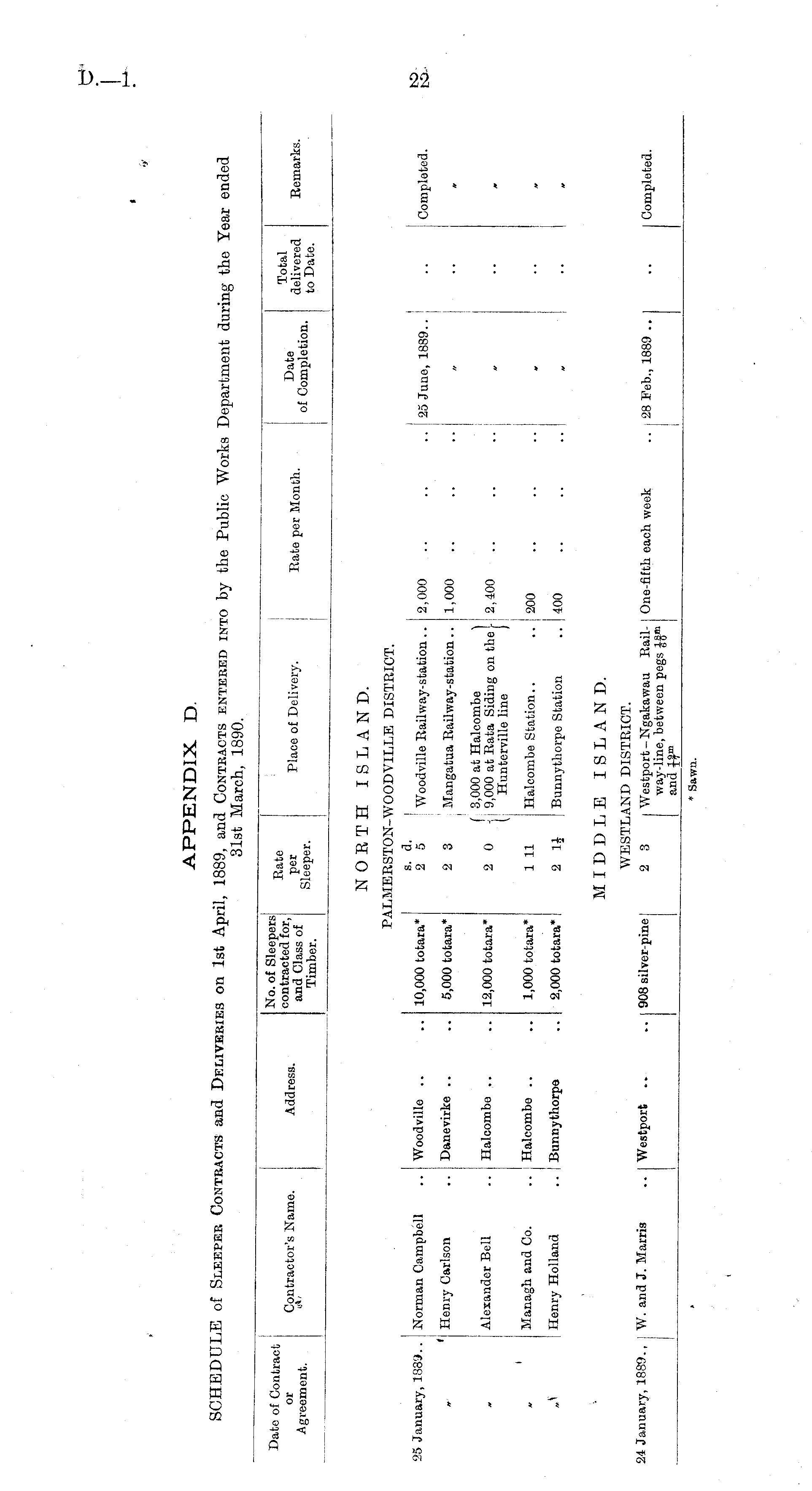 APPENDIX D. SCHEDULE of Sleeper Contracts and Deliveries on 1st April, 1889, and Contracts entered into by the Public Works Department during the Year ended 31st March, 1890.