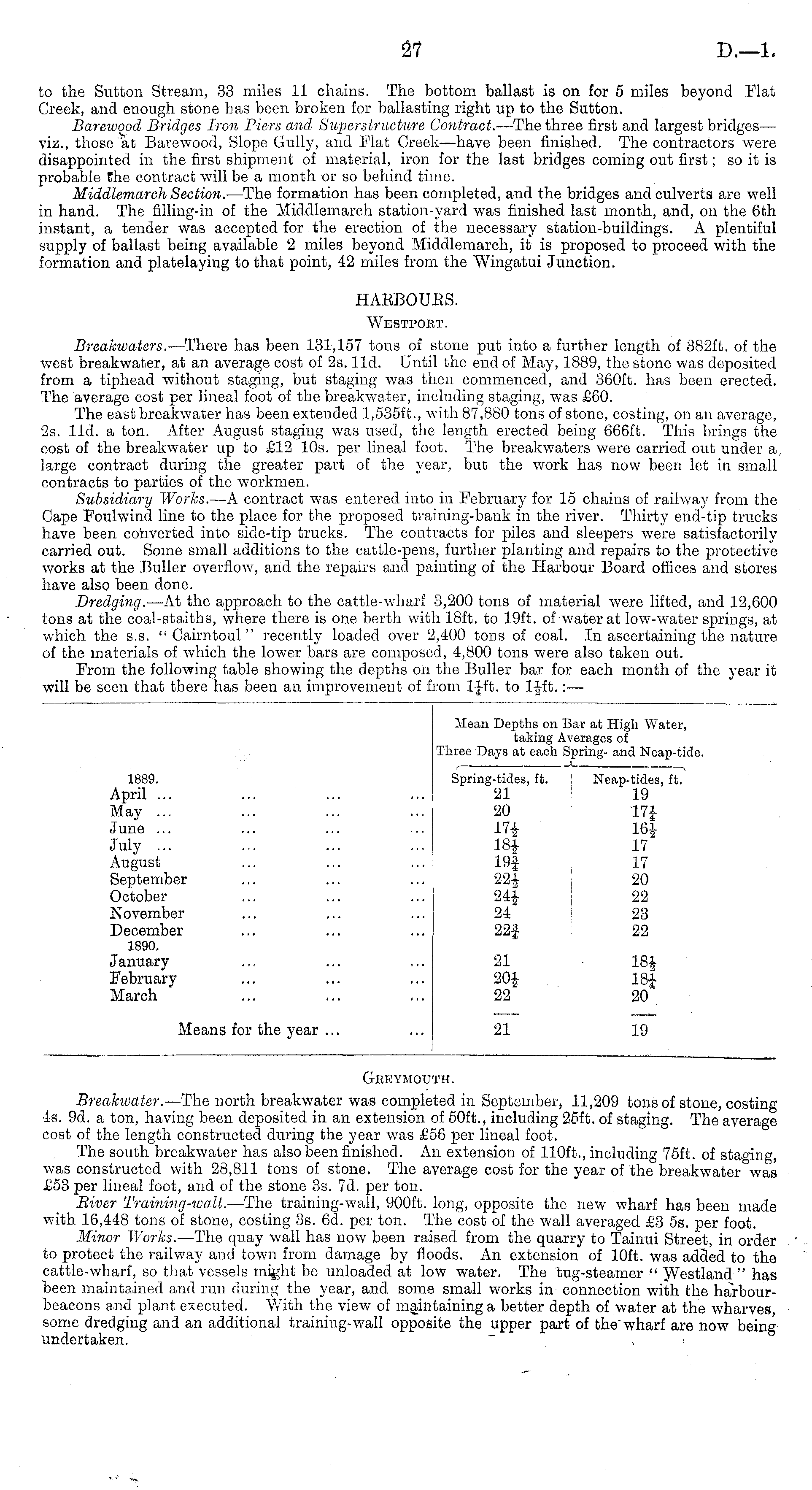 to the Sutton Stream, 33 miles 11 chains. The bottom ballast is on for 5 miles beyond Flat Creek, and enough stone has been broken for ballasting right up to the Sutton. Barewood Bridges Iron Piers and Superstructure Contract. —The three first and largest bridges— viz., those at Barewood, Slope Gully, and Flat Creek—have been finished. The contractors were disappointed in the first shipment of material, iron for the last bridges coming out first; so it is probable the contract will be a month or so behind time. Middleviarch Section. —The formation has been completed, and the bridges and culverts are well in hand. The filling-in of the Middlemarch station-yard was finished last month, and, on the 6th instant, a tender was accepted for the erection of the necessary station-buildings. A plentiful supply of ballast being available 2 miles beyond Middlemarch, it is proposed to proceed with the formation and platelaying to that point, 42 miles from the Wingatui Junction. HAEBOUES. Westpokt. Breakwaters. —There has been 131,157 tons of stone put into a further length of 382ft. of the west breakwater, at an average cost of 2s. lid. Until the end of May, 1889, the stone was deposited from a tiphead without staging, but staging was then commenced, and 360ft. has been erected. The average cost per lineal foot of the breakwater, including staging, was £60. The east breakwater has been extended 1,535ft., with 87,880 tons of stone, costing, on an average, 2s. lid. a ton. After August staging was used, the length erected being 666ft. This brings the cost of the breakwater up to £12 10s. per lineal foot. The breakwaters were carried out under a large contract during the greater part of the year, but the work has now been let in small contracts to parties of the workmen. Subsidiary Works. —A contract was entered into in February for 15 chains of railway from the Cape Fouhvind line to the place for the proposed training-bank in the river. Thirty end-tip trucks have been converted into side-tip trucks. The contracts for piles and sleepers were satisfactorily carried out. Some small additions to the cattle-pens, further planting and repairs to the protective works at the Buller overflow, and the repairs and painting of the Harbour Board offices and stores have also been done. Dredging. —At the approach to the cattle-wharf 3,200 tons of material were lifted, and 12,600 tons at the coal-staiths, where there is one berth with 18ft. to 19ft. of water at low-water springs, at which the s.s. " Cairntoul " recently loaded over 2,400 tons of coal. In ascertaining the nature of the materials of which the lower bars are composed, 4,800 tons were also taken out. From the following table showing the depths on the Buller bar for each month of the year it will be seen that there has been an improvement of from ljft. to lift.: —