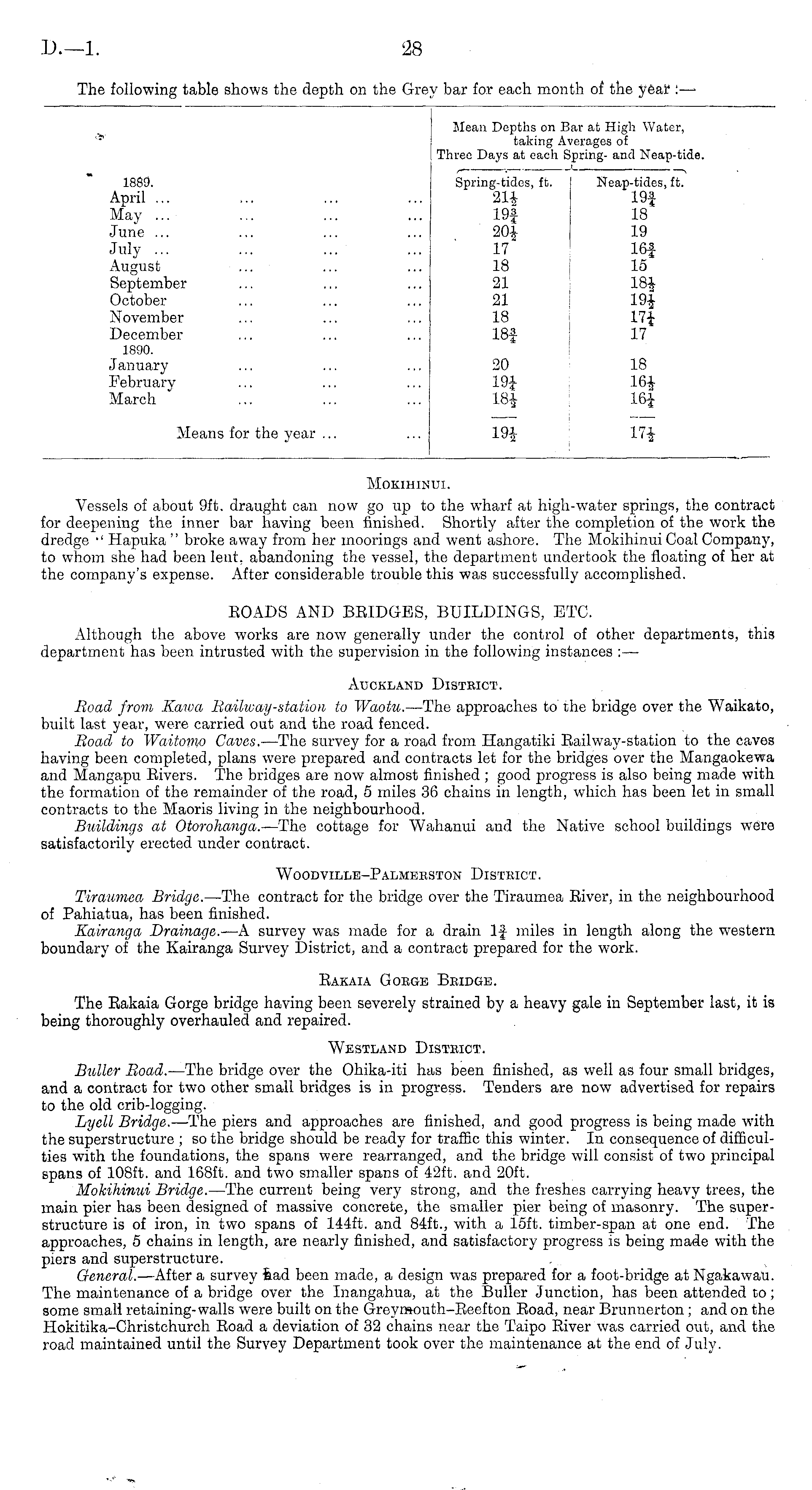 MOKIHINTJI. Vessels of about 9ft. draught can now go up to the wharf at high-water springs, the contract for deepening the inner bar having been finished. Shortly after the completion of the work the dredge " Hapuka " broke away from her moorings and went ashore. The Mokihinui Coal Company, to whom she had been lent., abandoning the vessel, the department undertook the floating of her at the company's expense. After considerable trouble this was successfully accomplished. BO ADS AND BRIDGES, BUILDINGS, ETC. Although the above works are now generally under the control of other departments, this department has been intrusted with the supervision in the following instances : — Auckland Disteict. Road from Kaiua liailway-station to Waotu. —The approaches to the bridge over the Waikato, built last year, were carried out and the road fenced. Road to Waitovw Caves. —The survey for a road from Hangatiki Railway-station to the caves having been completed, plans were prepared and contracts let for the bridges over the Mangaokewa and Mangapu Rivers. The bridges are now almost finished ; good progress is also being made with the formation of the remainder of the road, 5 miles 36 chains in length, which has been let in small contracts to the Maoris living in the neighbourhood. Buildings at Otorohanga. —The cottage for Wahanui and the Native school buildings were satisfactorily erected under contract. Woodville-Palmeeston Disteict. Tiraumea Bridge. —The contract for the bridge over the Tiraumea River, in the neighbourhood of Pahiatua, has been finished. Kairanga Drainage. —A survey was made for a drain If miles in length along the western boundary of the Kairanga Survey District, and a contract prepared for the w rork. Rakaia Goege Beidge. The Rakaia Gorge bridge having been severely strained by a heavy gale in September last, it is being thoroughly overhauled and repaired. Westland Disteict. Bullet Road. —The bridge over the Ohika-iti has been finished, as well as four small bridges, and a contract for two other small bridges is in progress. Tenders are now advertised for repairs to the old crib-logging. Lycll Bridge. —The piers and approaches are finished, and good progress is being made with the superstructure ;so the bridge should be ready for traffic this winter. In consequence of difficulties with the foundations, the spans were rearranged, and the bridge will consist of two principal spans of 108ft. and 168ft. and two smaller spans of 42ft. and 20ft. Mokihinui Bridge. —The current being very strong, and the freshes carrying heavy trees, the main pier has been designed of massive concrete, the smaller pier being of masonry. The superstructure is of iron, in two spans of 144ft. and 84ft., with a 15ft. timber-span at one end. The approaches, 5 chains in length, are nearly finished, and satisfactory progress is being made with the piers and superstructure. General. —After a survey fead been made, a design was prepared for a foot-bridge at Ngakawau. The maintenance of a bridge over the Inangahua, at the Buller Junction, has been attended to; some small retaining-walls were built on the Greymouth-Reefton Road, near Brunnerton ; and on the Hokitika-Christchurch Road a deviation of 32 chains near the Taipo River was carried out, and the road maintained until the Survey Department took over the maintenance at the end of July.