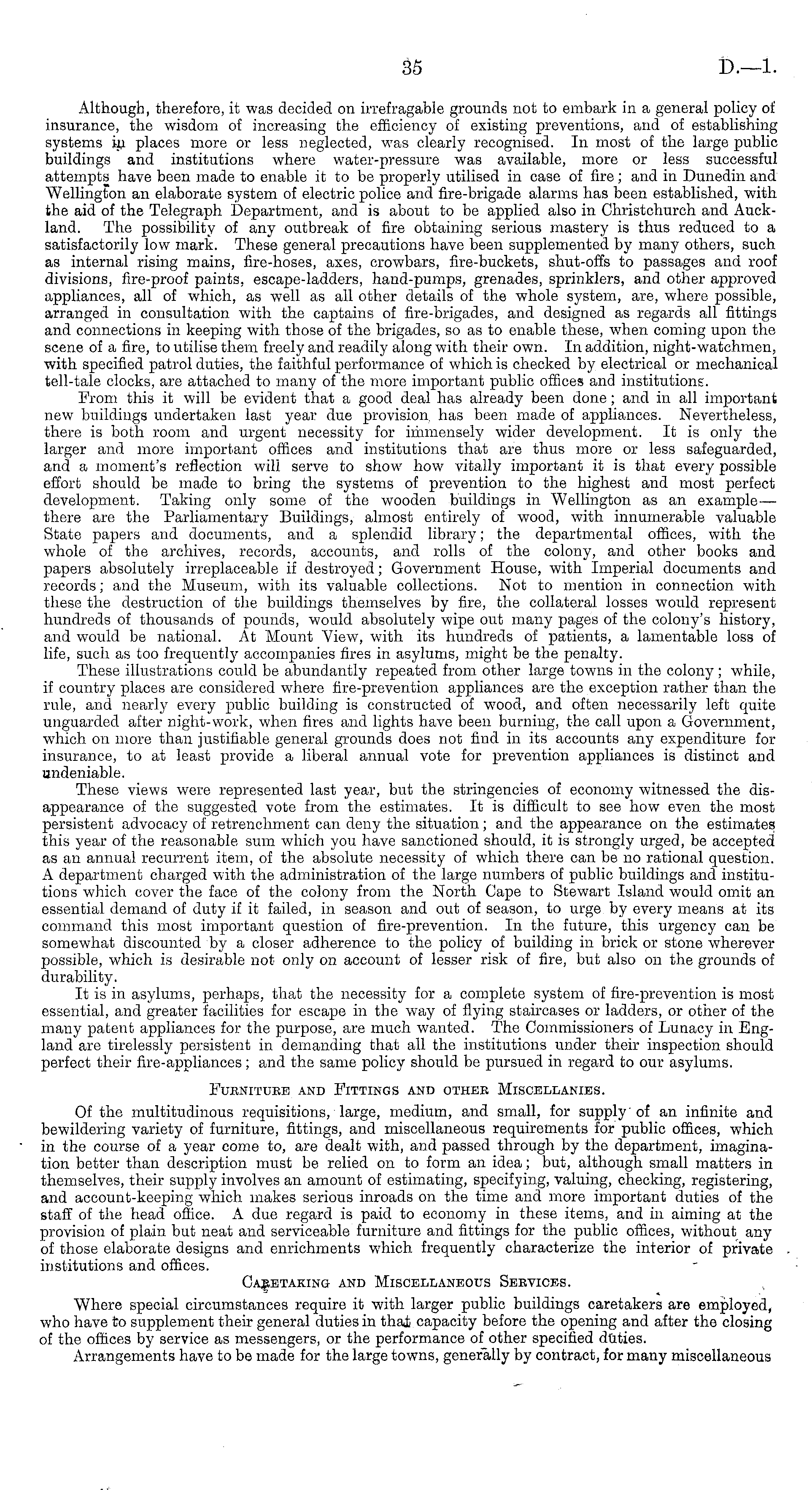 Although, therefore, it was decided on irrefragable grounds not to embark in a general policy of insurance, the wisdom of increasing the efficiency of existing preventions, and of establishing systems ki places more or less neglected, was clearly recognised. In most of the large public buildings and institutions where water-pressure was available, more or less successful attempts have been made to enable it to be properly utilised in case of fire; and in Dunedin and Wellington an elaborate system of electric police and fire-brigade alarms has been established, with the aid of the Telegraph Department, and is about to be applied also in Christchurch and Auckland. The possibility of any outbreak of fire obtaining serious mastery is thus reduced to a satisfactorily low mark. These general precautions have been supplemented by many others, such as internal rising mains, fire-hoses, axes, crowbars, fire-buckets, shut-offs to passages and roof divisions, fire-proof paints, escape-ladders, hand-pumps, grenades, sprinklers, and other approved appliances, all of which, as well as all other details of the whole system, are, where possible, arranged in consultation with the captains of fire-brigades, and designed as regards all fittings and connections in keeping with those of the brigades, so as to enable these, when coming upon the scene of a fire, to utilise them freely and readily along with their own. In addition, night-watchmen, with specified patrol duties, the faithful performance of which is checked by electrical or mechanical tell-tale clocks, are attached to many of the more important public offices and institutions. From this it will be evident that a good deal has already been done ; and in all important new buildings undertaken last year due provision, has been made of appliances. Nevertheless, there is both room and urgent necessity for immensely wider development. It is only the larger and more important offices and institutions that are thus more or less safeguarded, and a moment's reflection will serve to show how vitally important it is that every possible effort should be made to bring the systems of prevention to the highest and most perfect development. Taking only some of the wooden buildings in Wellington as an example— there are the Parliamentary Buildings, almost entirely of wood, with innumerable valuable State papers and documents, and a splendid library; the departmental offices, with the whole of the archives, records, accounts, and rolls of the colony, and other books and papers absolutely irreplaceable if destroyed; Government House, with Imperial documents and records; and the Museum, with its valuable collections. Not to mention in connection with these the destruction of the buildings themselves by fire, the collateral losses would represent hundreds of thousands of pounds, would absolutely wipe out many pages of the colony's history, and would be national. At Mount View, with its hundreds of patients, a lamentable loss of life, such as too frequently accompanies fires in asylums, might be the penalty. These illustrations could be abundantly repeated from other large towns in the colony ; while, if country places are considered where fire-prevention appliances are the exception rather than, the rule, and nearly every public building is constructed of wood, and often necessarily left quite unguarded after night-work, when fires and lights have been burning, the call upon a Government, which on more than justifiable general grounds does not find in its accounts any expenditure for insurance, to at least provide a liberal annual vote for prevention appliances is distinct and undeniable. These views were represented last year, but the stringencies of economy witnessed the disappearance of the suggested vote from the estimates. It is difficult to see how even the most persistent advocacy of retrenchment can deny the situation; and the appearance on the estimates this year of the reasonable sum which you have sanctioned should, it is strongly urged, be accepted as an annual recurrent item, of the absolute necessity of which there can be no rational question. A department charged with the administration of the large numbers of public buildings and institutions which cover the face of the colony from the North Cape to Stewart Island would omit an essential demand of duty if it failed, in season and out of season, to urge by every means at its command this most important question of fire-prevention. In the future, this urgency can be somewhat discounted by a closer adherence to the policy of building in brick or stone wherever possible, which is desirable not only on account of lesser risk of fire, but also on the grounds of durability. It is in asylums, perhaps, that the necessity for a complete system of fire-prevention is most essential, and greater facilities for escape in the way of flying staircases or ladders, or other of the many patent appliances for the purpose, are much wanted. The Commissioners of Lunacy in England are tirelessly persistent in demanding that all the institutions under their inspection should perfect their fire-appliances; and the same policy should be pursued in regard to our asylums. Furniture and Fittings and other Miscellanies. Of the multitudinous requisitions, large, medium, and small, for supply of an infinite and bewildering variety of furniture, fittings, and miscellaneous requirements for public offices, which in the course of a year come to, are dealt with, and passed through by the department, imagination better than description must be relied on to form an idea; but, although small matters in themselves, their supply involves an amount of estimating, specifying, valuing, checking, registering, and account-keeping which makes serious inroads on the time and more important duties of the staff of the head office. A due regard is paid to economy in these items, and in aiming at the provision of plain but neat and serviceable furniture