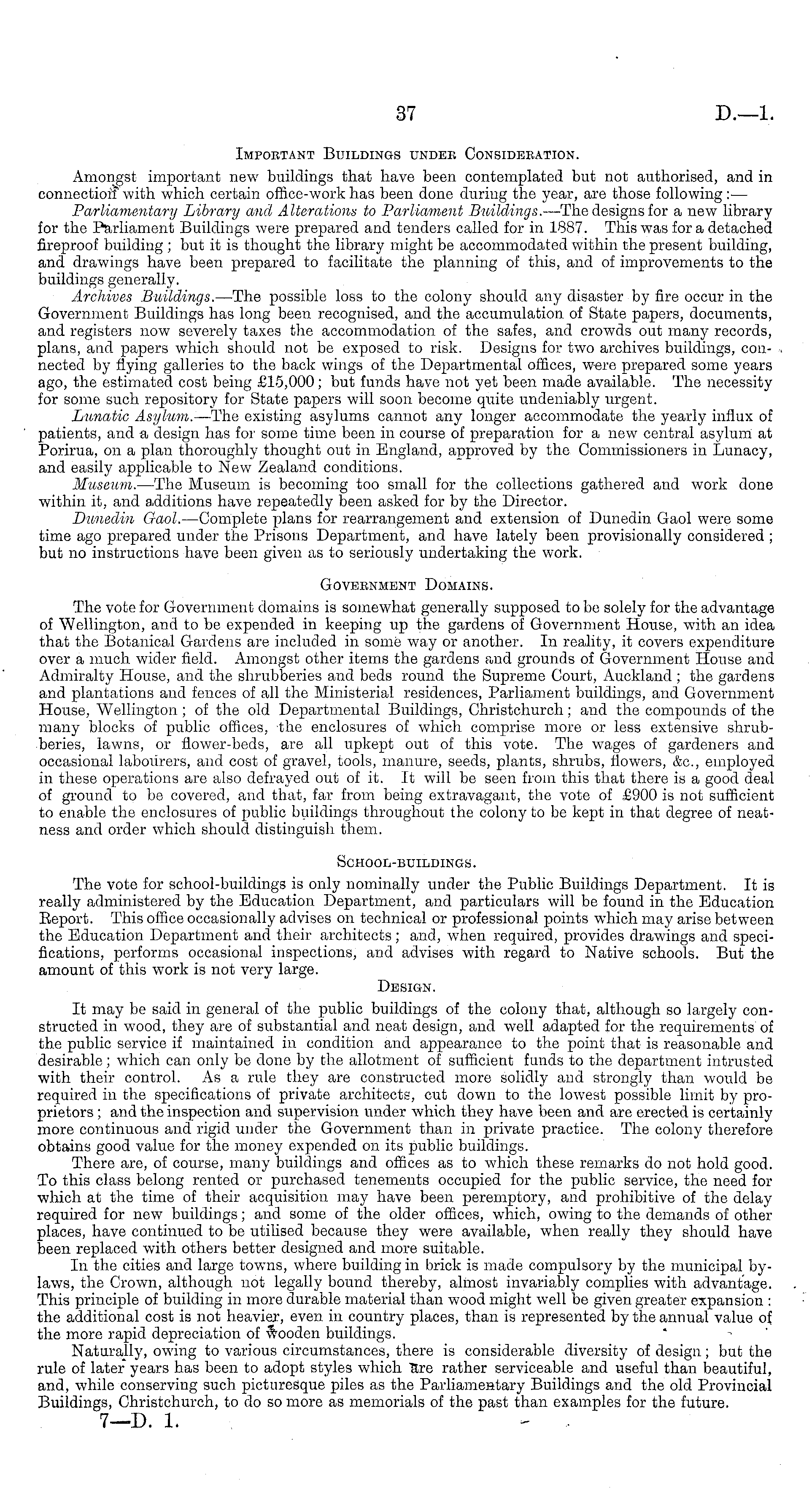 Important Buildings under Consideration. Amongst important now buildings that have been contemplated but not authorised, and in connection^ with which certain office-work has been done during the year, are those following : — Parliamentary Library and Alterations to Parliament Buildings. —The designs for a new library for the Parliament Buildings were prepared and tenders called for in 1887. This was for a detached fireproof building ; but it is thought the library might be accommodated within the present building, and drawings have been prepared to facilitate the planning of this, and of improvements to the buildings generally. Archives Buildings. —The possible loss to the colony should any disaster by fire occur in the Government Buildings has long been recognised, and the accumulation of State papers, documents, and registers now severely taxes the accommodation of the safes, and crowds out many records, plans, and papers which should not be exposed to risk. Designs for two archives buildings, connected by flying galleries to the back wings of the Departmental offices, were prepared some years ago, the estimated cost being £15,000; but funds have not yet been made available. The necessity for some such repository for State papers will soon become quite undeniably urgent. Lunatic Asylum. —The existing asylums cannot any longer accommodate the yearly influx of patients, and a design has for some time been in course of preparation for a new central asylum at Porirua, on a plan thoroughly thought out in England, approved by the Commissioners in Lunacy, and easily applicable to New Zealand conditions. Museum. —The Museum is becoming too small for the collections gathered and work done within it, and additions have repeatedly been asked for by the Director. Duhedin Gaol. —Complete plans for rearrangement and extension of Dunedin Gaol were some time ago prepared under the Prisons Department, and have lately been provisionally considered ; but no instructions have been given as to seriously undertaking the work. Government Domains. The vote for Government domains is somewhat generally supposed to be solely for the advantage of Wellington, and to be expended in keeping up the gardens of Government House, with an idea that the Botanical Gardens are included in some way or another. In reality, it covers expenditure over a much wider field. Amongst other items the gardens and grounds of Government House and Admiralty House, and the shrubberies and beds round the Supreme Court, Auckland ; the gardens and plantations and fences of all the Ministerial residences, Parliament buildings, and Government House, Wellington ; of the old Departmental Buildings, Christchurch; and the compounds of the many blocks of public offices, the enclosures of which comprise more or less extensive shrubberies, lawns, or flower-beds, are all upkept out of this vote. The wages of gardeners and occasional labourers, and cost of gravel, tools, manure, seeds, plants, shrubs, flowers, &c, employed in those operations are also defrayed out of it. It will be seen from this that there is a good deal of ground to be covered, and that, far from being extravagant, the vote of £900 is not sufficient to enable the enclosures of public buildings throughout the colony to be kept in that degree of neatness and order which should distinguish them. School-buildings. The vote for school-buildings is only nominally under the Public Buildings Department. It is really administered by the Education Department, and particulars will be found in the Education Eeport. This office occasionally advises on technical or professional points which may arise between the Education Department and their architects ; and, when required, provides drawings and specifications, performs occasional inspections, and advises with regard to Native schools. But the amount of this work is not very large. Design. It may be said in general of the public buildings of the colony that, although so largely constructed in wood, they are of substantial and neat design, and well adapted for the requirements of the public service if maintained in condition and appearance to the point that is reasonable and desirable; wMcbi can only be done by the allotment of sufficient funds to the department intrusted with their control. As a rule they are constructed more solidly and strongly than would be required in the specifications of private architects, cut down to the lowest possible limit by proprietors ; and the inspection and supervision under which they have been and are erected is certainly more continuous and rigid under the Government than in private practice. The colony therefore obtains good value for the money expended on its public buildings. There are, of course, many buildings and offices as to which these remarks do not hold good. To this class belong rented or purchased tenements occupied for the public service, the need for which at the time of their acquisition may have been peremptory, and prohibitive of the delay required for new buildings; and some of the older offices, which, owing to the demands of other places, have continued to be utilised because they were available, when really they should have been replaced with others better designed and more suitable. In the cities and large towns, where building in brick is made compulsory by the municipal bylaws, the Crown, although not legally bound thereby, almost invariably complies with advantage. This principle of building in more durable material than wood might well be given greater expansion : the additional cost is not heavier, even in country places, than is represented by the annual value of the more rapid depreciation of wooden buildings. Naturally, owing to various circumstances, there is considerable diversity of design; but the rule of later years has been to adopt styles which Ure rather serviceable and useful than beautiful, and, while conserving such picturesque piles as the Parliamentary 