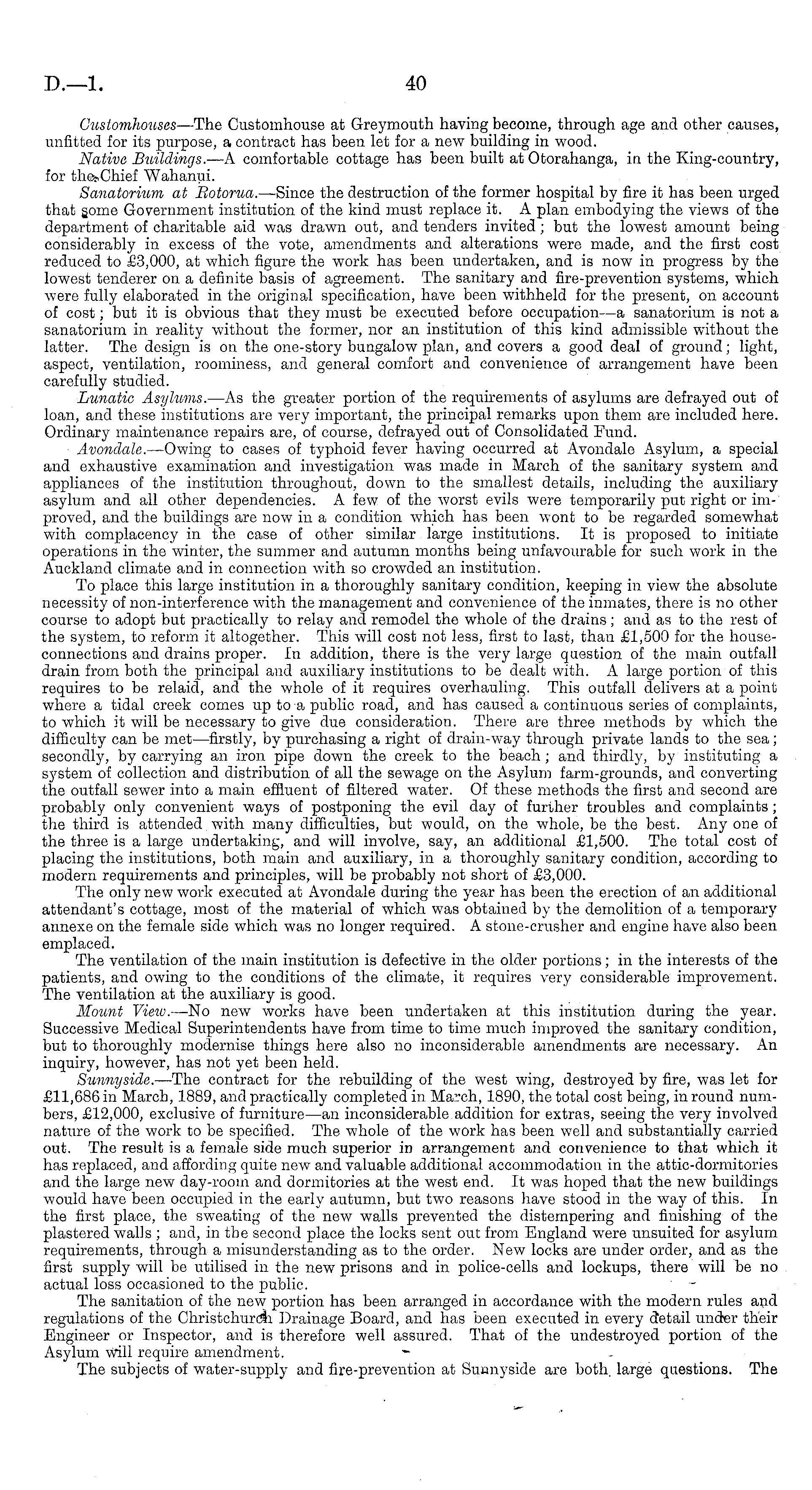 Customhouses —The Customhouse at Greymouth having become, through age and other causes, unfitted for its purpose, a contract has been let for a new building in wood. Native Buildings. —A comfortable cottage has been built at Otorahanga, in the King-country, for the*. Chief Wahanui. Sanatorium at Rotorua. —Since the destruction of the former hospital by fire it has been urged that gome Government institution of the kind must replace it. A plan embodying the views of the department of charitable aid was drawn out, and tenders invited ; but the lowest amount being considerably in excess of the vote, amendments and alterations were made, and the first cost reduced to £3,000, at which figure the work has been undertaken, and is now in progress by the lowest tenderer on a definite basis of agreement. The sanitary and fire-prevention systems, which were fully elaborated in the original specification, have been withheld for the present, on account of cost; but it is obvious that they must be executed before occupation—a sanatorium is not a sanatorium in reality without the former, nor an institution of this kind admissible without the latter. The design is on the one-story bungalow plan, and covers a good deal of ground; light, aspect, ventilation, roominess, and general comfort and convenience of arrangement have been carefully studied. Lunatic Asylums. —As the greater portion of the requirements of asylums are defrayed out of loan, and these institutions are very important, the principal remarks upon them are included here. Ordinary maintenance repairs are, of course, defrayed out of Consolidated Fund. Avondale. —Owing to cases of typhoid fever having occurred at Avondale Asylum, a special and exhaustive examination and investigation was made in March of the sanitary system and appliances of the institution throughout, down to the smallest details, including the auxiliary asylum and all other dependencies. A few of the worst evils were temporarily put right or improved, and the buildings are now in a condition which has been wont to be regarded somewhat with complacency in the case of other similar large institutions. It is proposed to initiate operations in the winter, the summer and autumn months being unfavourable for such work in the Auckland climate and in connection with so crowded an institution. To place this large institution in a thoroughly sanitary condition, keeping in view the absolute necessity of non-interference with the management and convenience of the inmates, there is no other course to adopt but practically to relay and remodel the whole of the drains ; and as to the rest of the system, to reform it altogether. This will cost not less, first to last, than £1,500 for the houseconnections and drains proper. In addition, there is the very large question of the main outfall drain from both the principal and auxiliary institutions to bo dealt with. A large portion of this requires to be relaid, and the whole of it requires overhauling. This outfall delivers at a point where a tidal creek comes up to a public road, and has caused a continuous series of complaints, to which it will be necessary to give due consideration. There are three methods by which the difficulty can be met —firstly, by purchasing a right of drain-way through private lands to the sea; secondly, by carrying an iron pipe down the creek to the beach ; and thirdly, by instituting a system of collection and distribution of all the sewage on the Asylum farm-grounds, and converting the outfall sewer into a main effluent of filtered water. Of these methods the first and second are probably only convenient ways of postponing the evil day of further troubles and complaints ; the third is attended with many difficulties, but would, on the whole, be the best. Any one of the three is a large undertaking, and will involve, say, an additional £1,500. The total cost of placing the institutions, both main and auxiliary, in a thoroughly sanitary condition, according to modern requirements and principles, will be probably not short of £3,000. The only new work executed at Avondale during the year has been the erection of an additional attendant's cottage, most of the material of which was obtained by the demolition of a temporary annexe on the female side which was no longer required. A stone-crusher and engine have also been emplaced. The ventilation of the main institution is defective in the older portions; in the interests of the patients, and owing to the conditions of the climate, it requires very considerable improvement. The ventilation at the auxiliary is good. Mount View. —No new works have been undertaken at this institution during the year. Successive Medical Superintendents have from time to time much improved the sanitary condition, but to thoroughly modernise things here also no inconsiderable amendments are necessary. An inquiry, however, has not yet been held. Sunnyside. —The contract for the rebuilding of the west wing, destroyed by fire, was let for £11,686 in March, 1889, and practically completed in March, 1890, the total cost being, in round numbers, £12,000, exclusive of furniture—an inconsiderable addition for extras, seeing the very involved nature of the work to be specified. The whole of the work has been well and substantially carried out. The result is a female side much superior in arrangement and convenience to that which it has replaced, and affording quite new and valuable additional accommodation in the attic-dormitories and the large new day-room and dormitories at the west end. It was hoped that the new buildings would have been occupied in the early autumn, but two reasons have stood in the way of this. In the first place, the sweating of the new walls prevented the distempering and finishing of the plastered walls ; and, in the second place the locks sent out from England were unsuited for asylum requirements, through a misunderstanding as to the order. New locks 